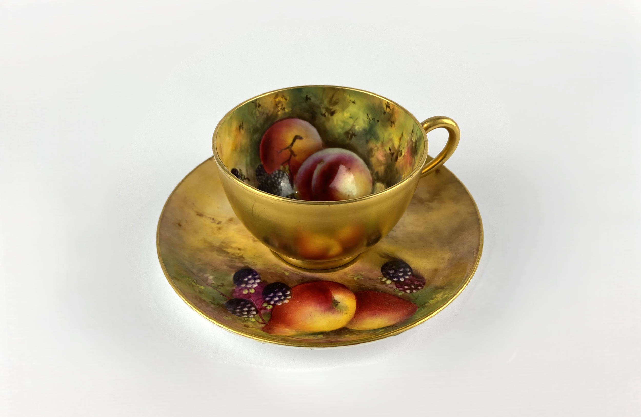 A Royal Worcester cabinet cup and saucer, retailed by Townsend & Co. Newcastle-upon-Tyne, painted by E. Townsend and Stanley, each decorated with scenes of fruit within a woodland, cup exterior gilt decorated, puce marks to base (the saucer AF) (2)