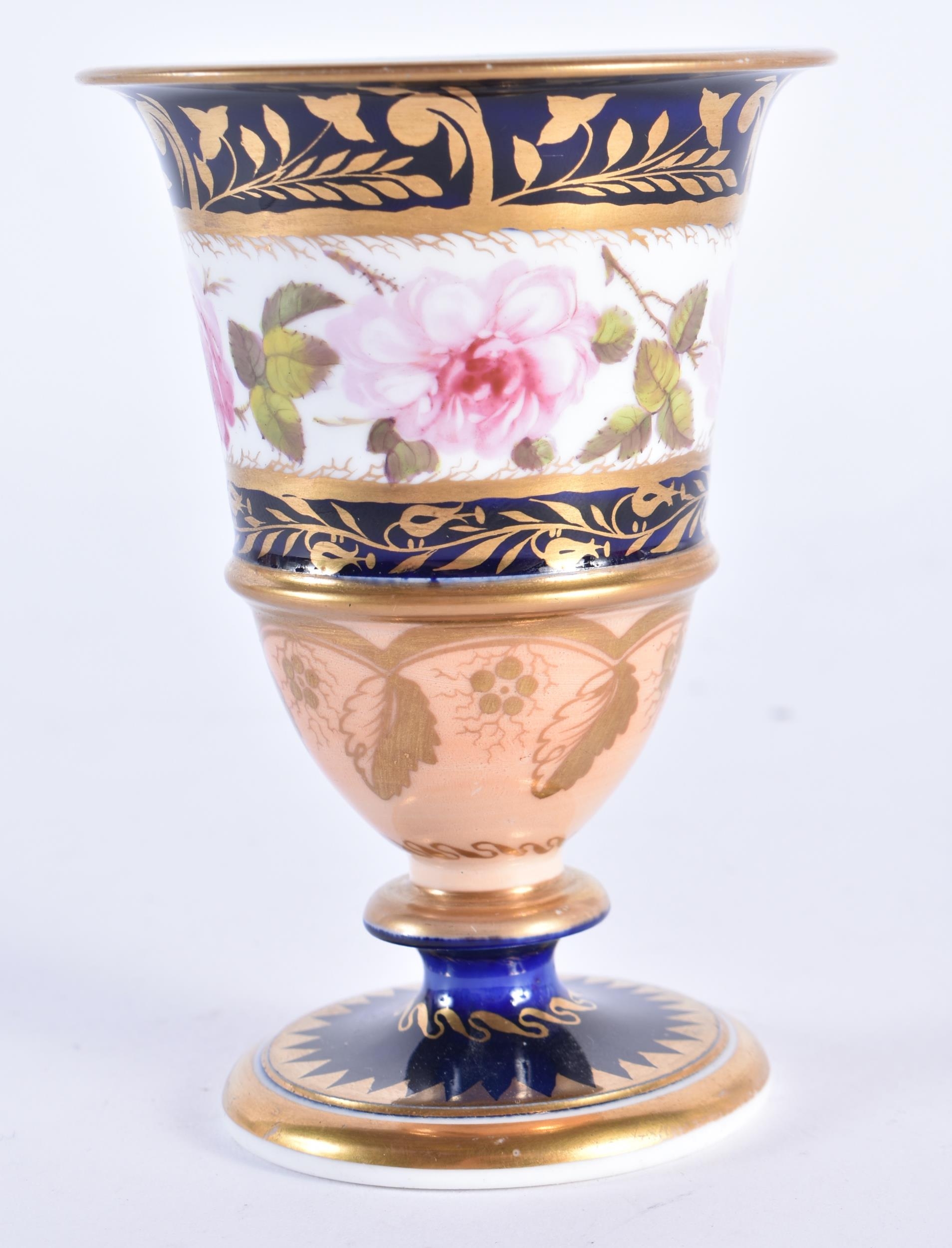 A FINE EARLY 19TH CENTURY ENGLISH PORCELAIN VASE by Charles Bourne, painted with flowers. 10 cm high. See G A Godden Staffordshire Porcelain - plate 373 for identical vase