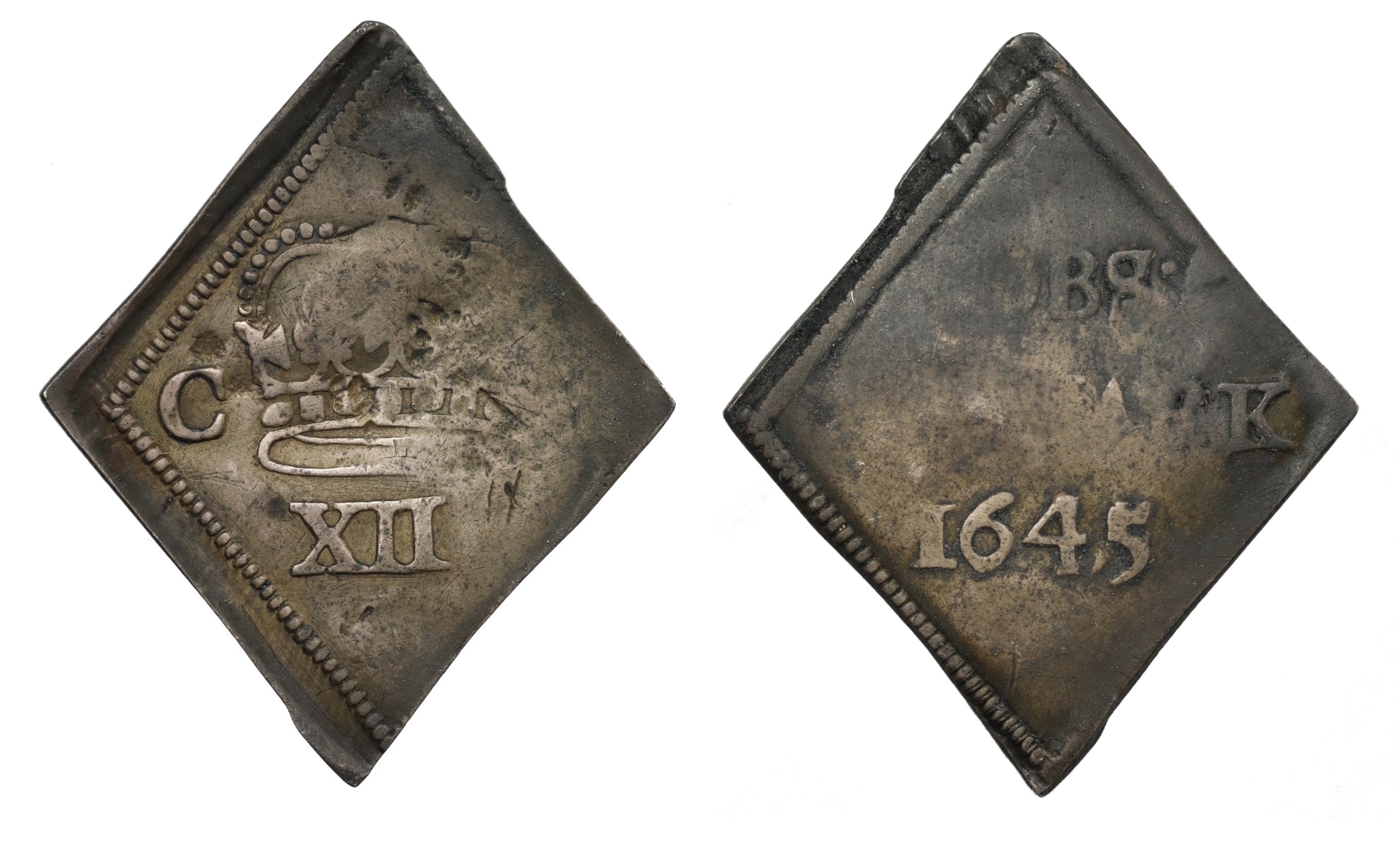 † Charles I (1625-49), silver obsidional Newark Shilling, struck on a lighter weight Ninepence flan, 1645, Royal crown, C to left, R to right, denomination below in Roman numerals, beaded border both sides, rev. three-line inscription and date, OBS: / NEWARK / 1645, 4.58g (Brooker 1225; N.2640; S.3143). With a degree of wear to the upper portion and some punch marks on value side, otherwise about very fine and seemingly an early example of a mint error from a siege town under duress.
