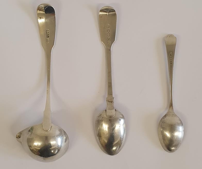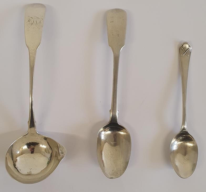 Hallmarked Irish Silver - Georgian Sauce Ladle c.1813 by John Power; a Victorian Spoon and a later spoon. Total c.65grams