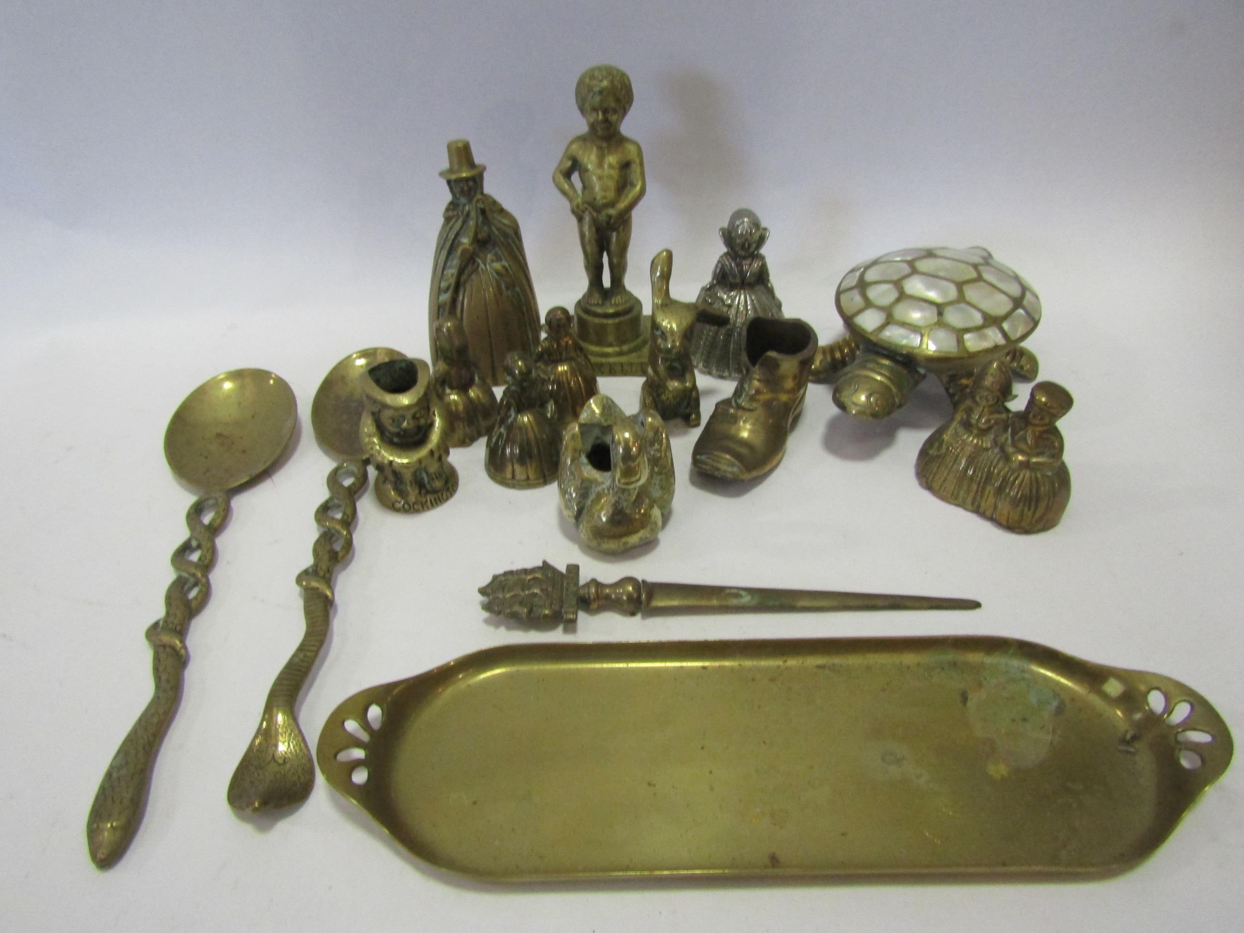 A quantity of brass miniatures including bells, mother-of-pearl tortoise ashtray, bunny, letter opener etc
