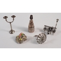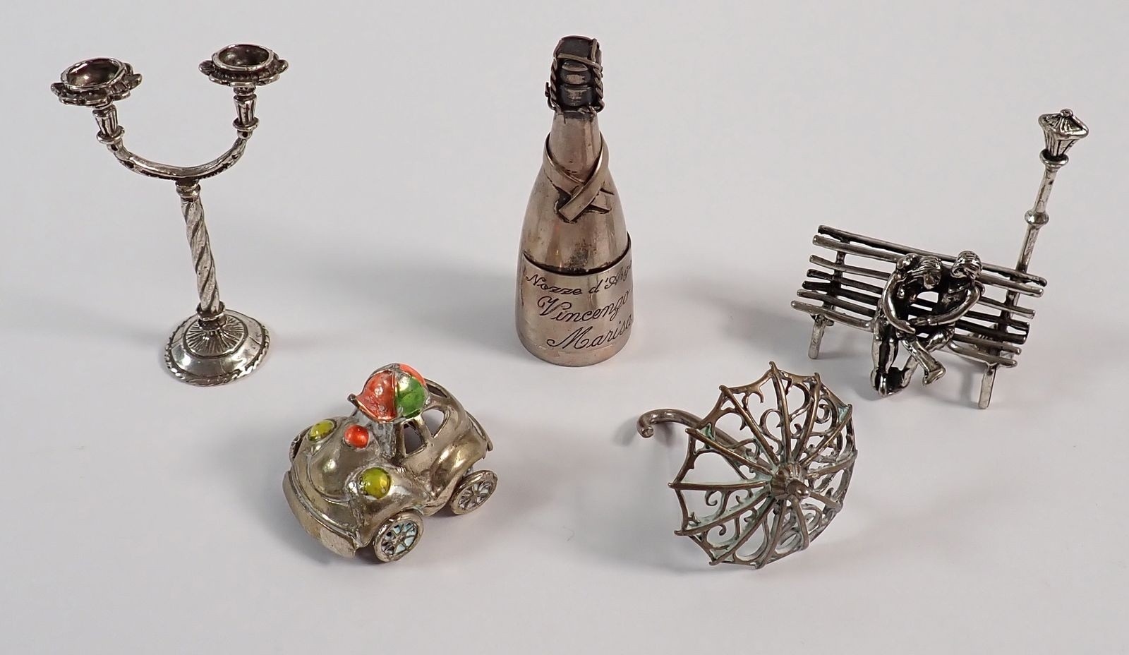 Five Italian silver miniatures including a Champagne Bottle, Lovers on Bench etc, total weight 75g