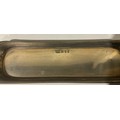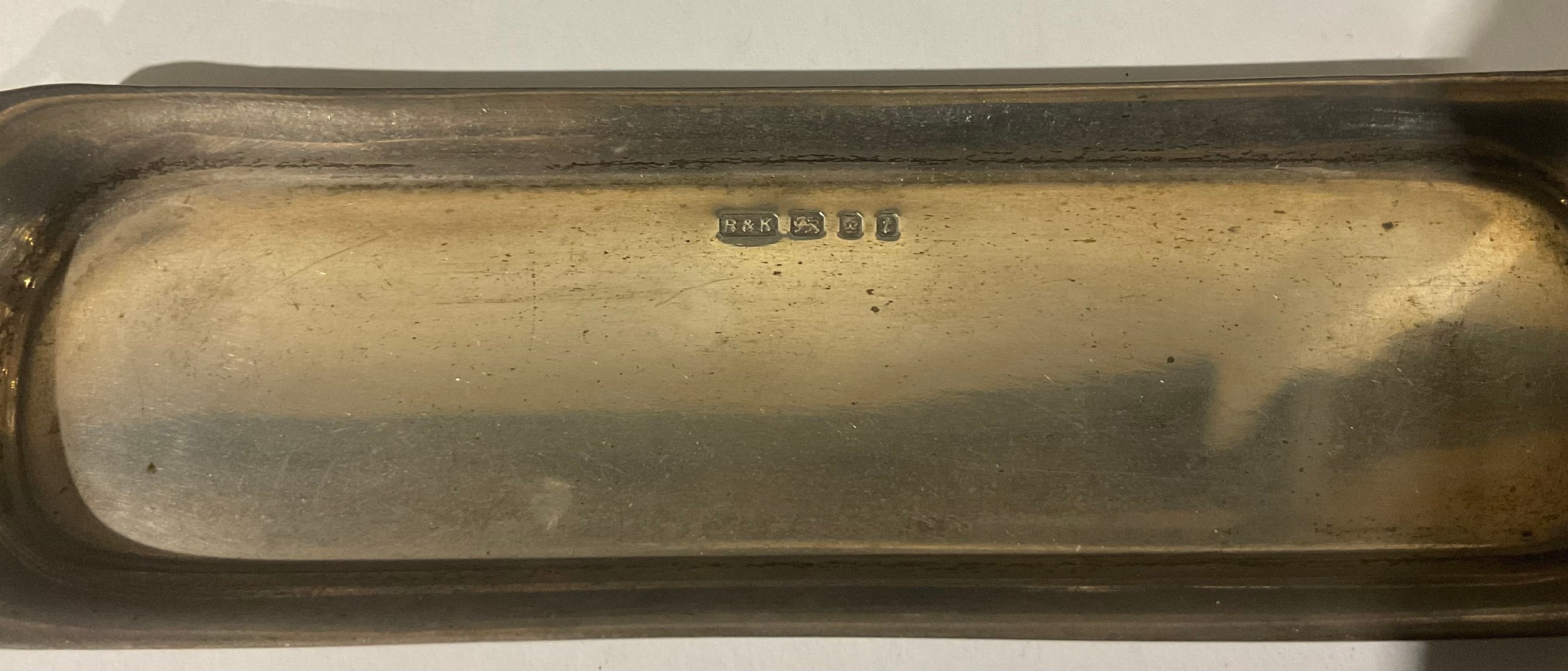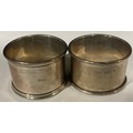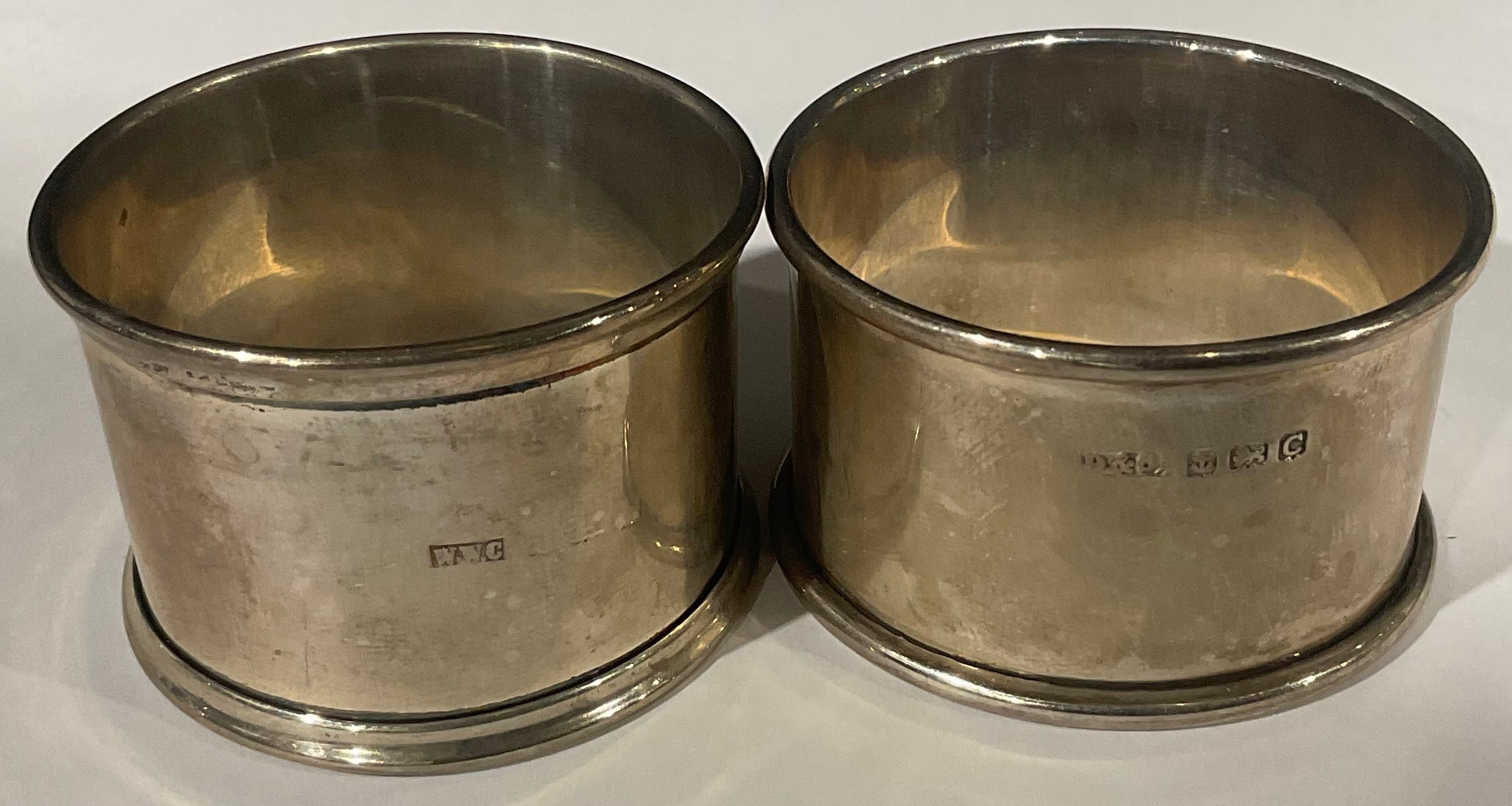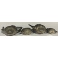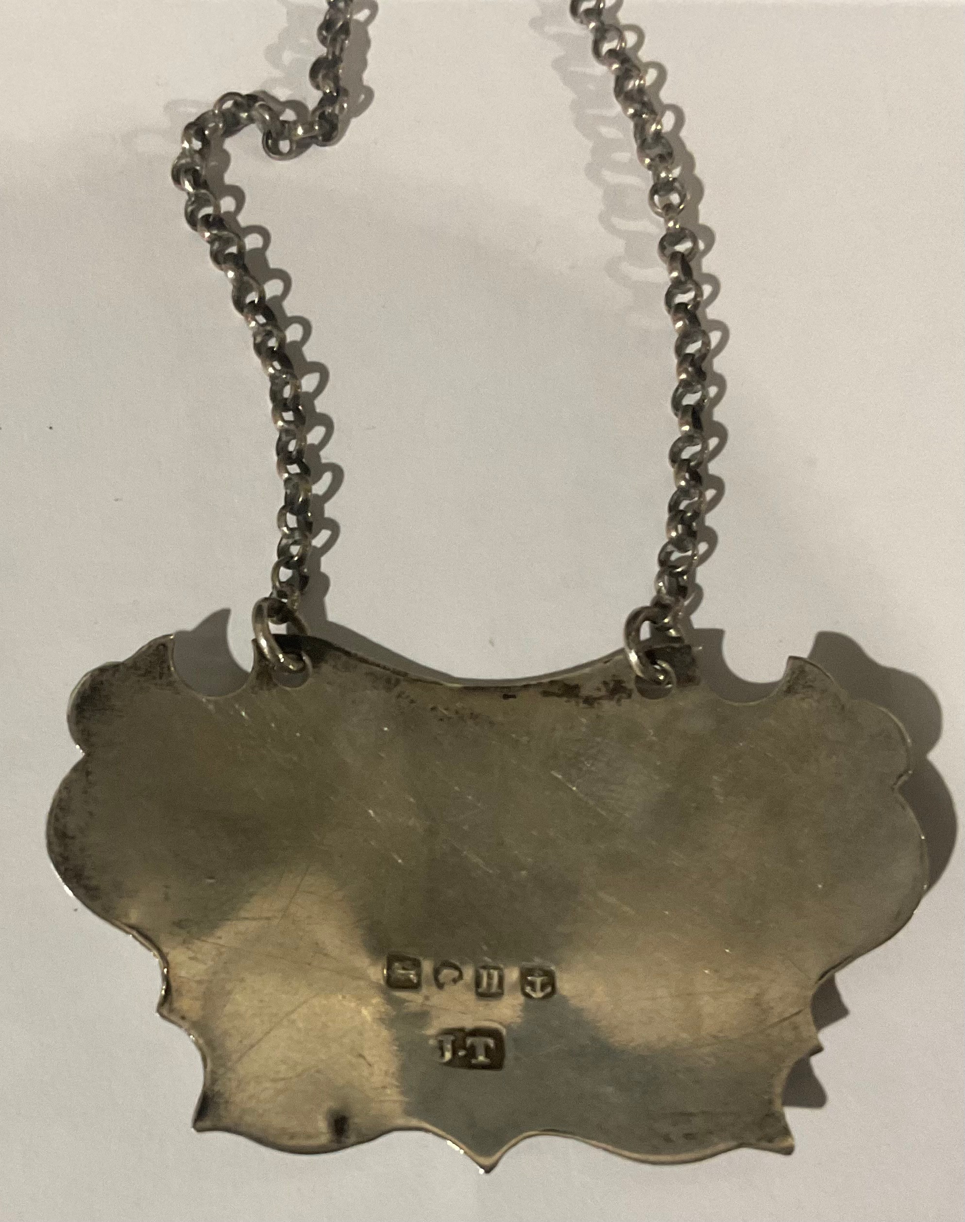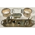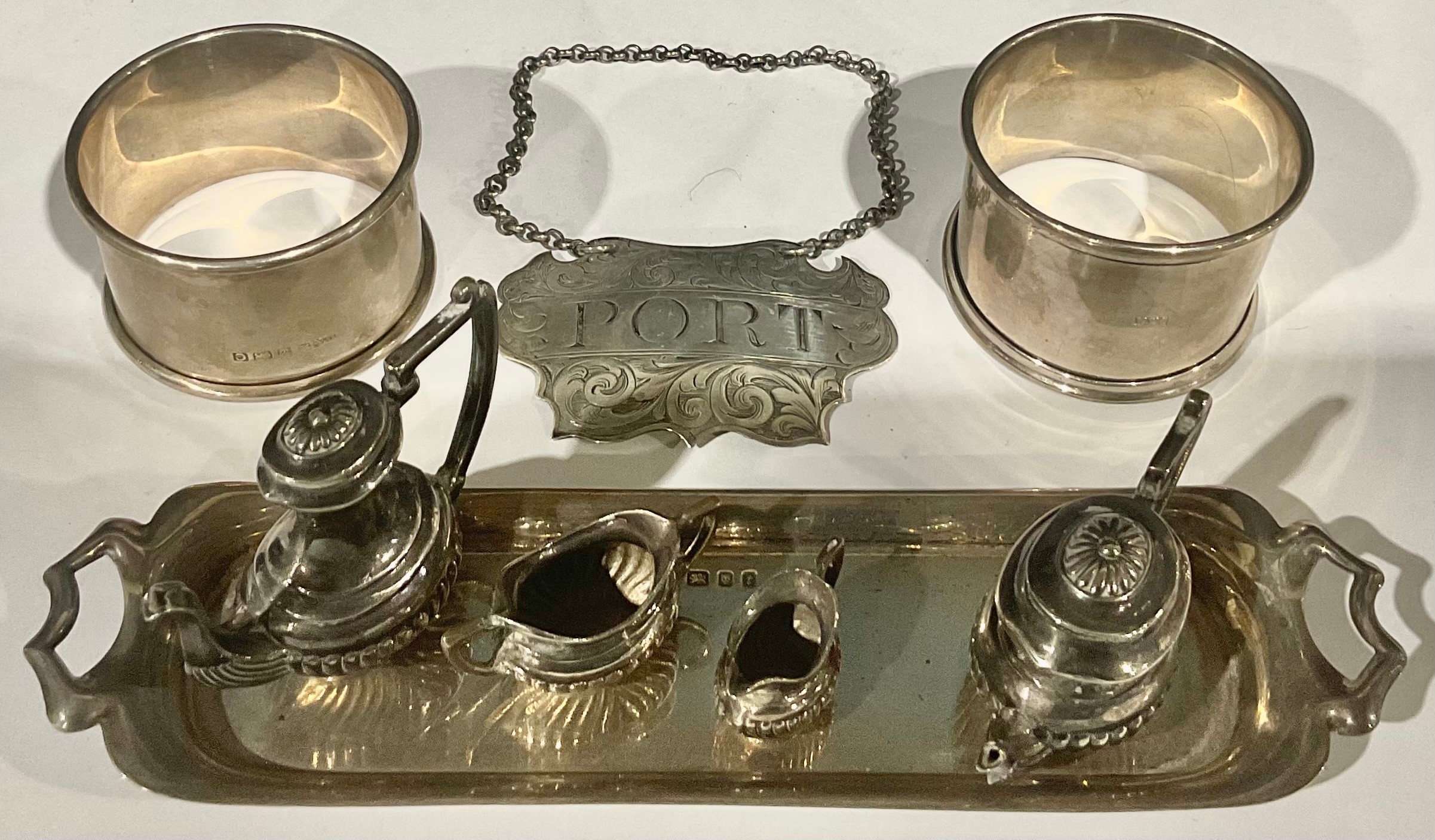 A miniature silver four piece tea set on tray, Richards & Knight, London 1974; Victorian silver bottle label, Port, John Tongue, Birmingham 1856, two silver napkin ring, 103.2g gross