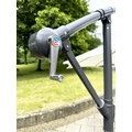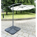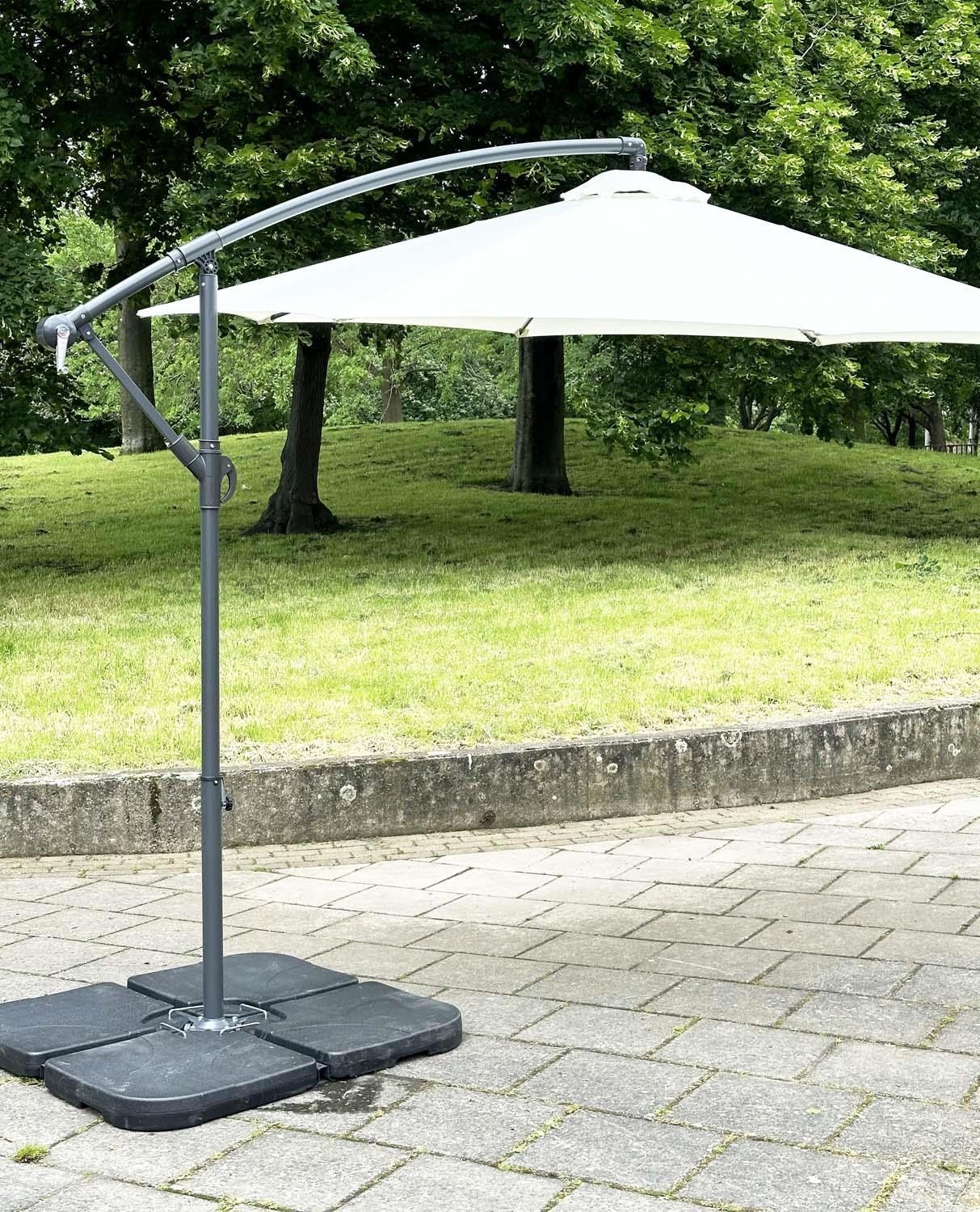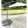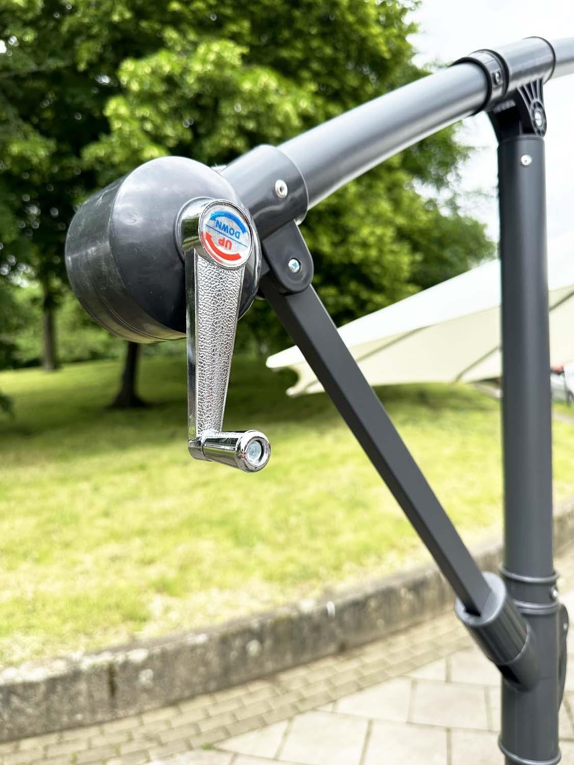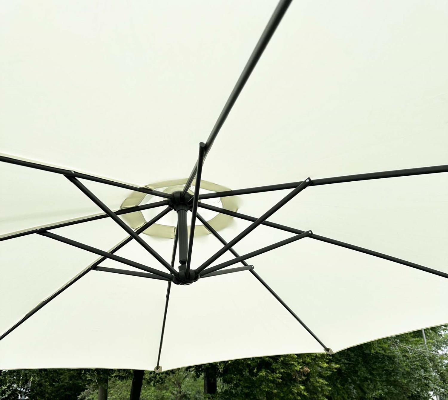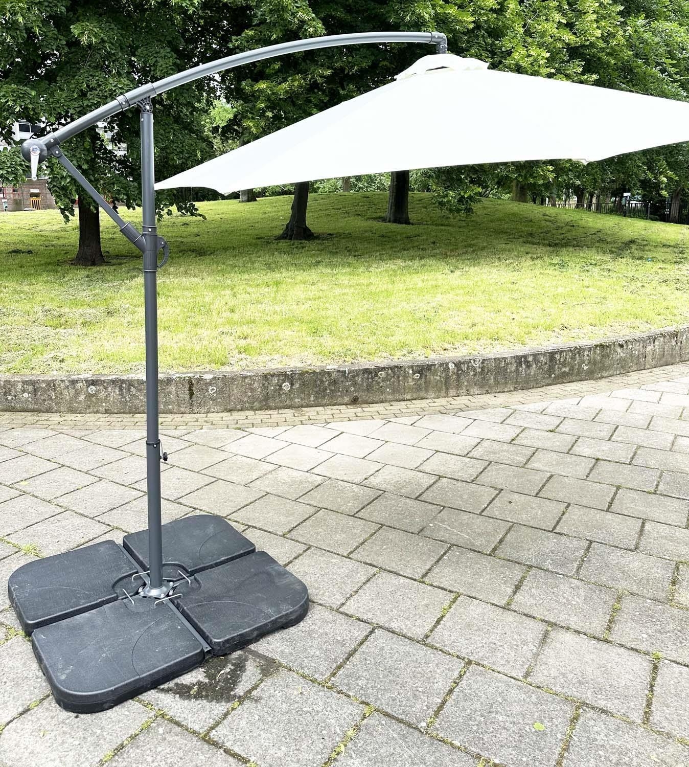 SUN UMBRELLA, circular retractable with cantilever wind up support and weighted (water) bases.