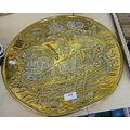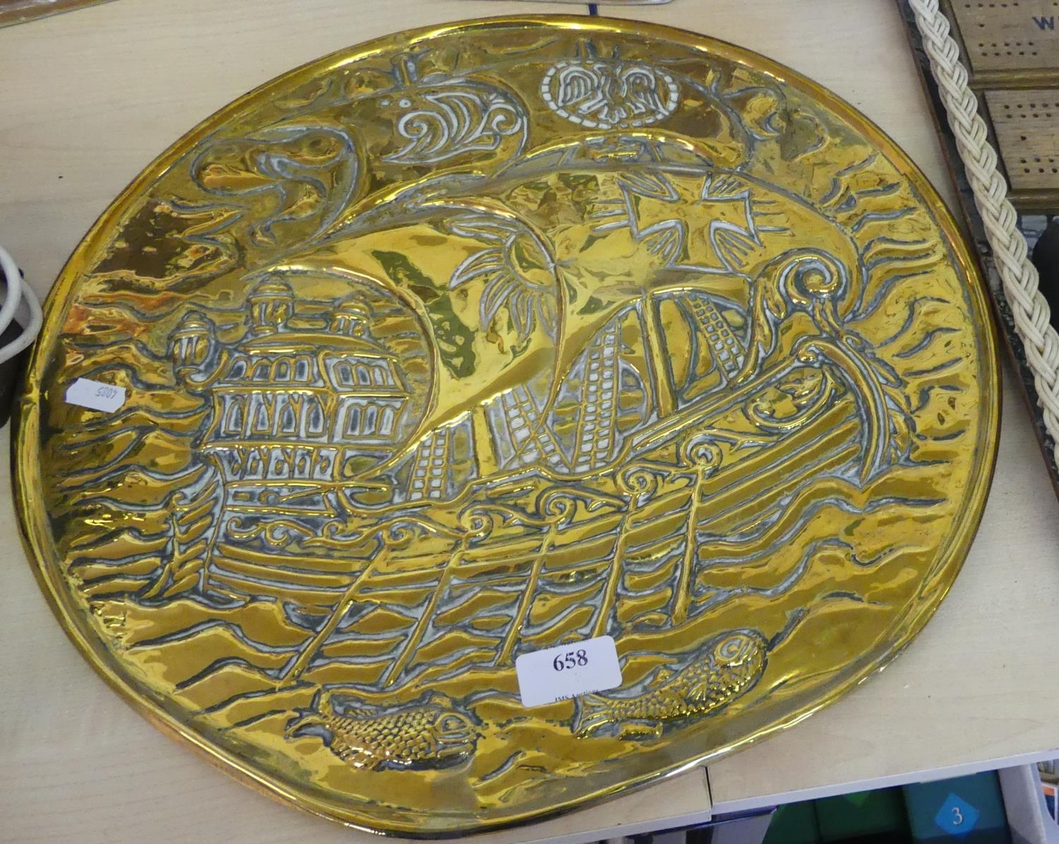 Arts & Crafts Embossed Brass Wall Plaque - Stylised Galleon & Fish.