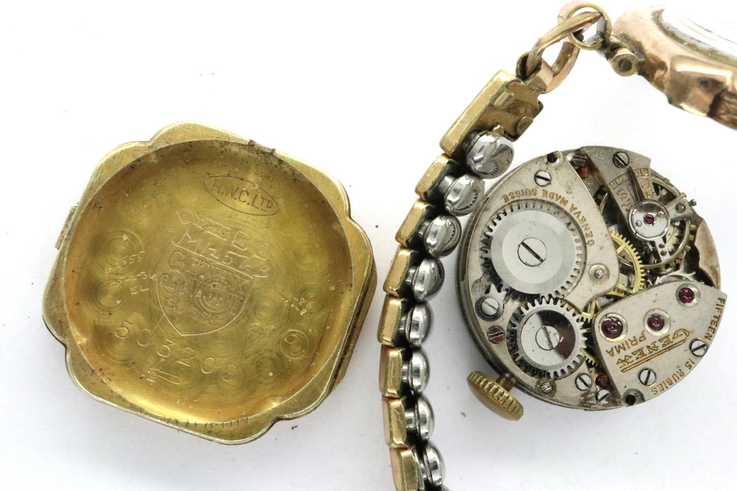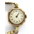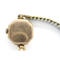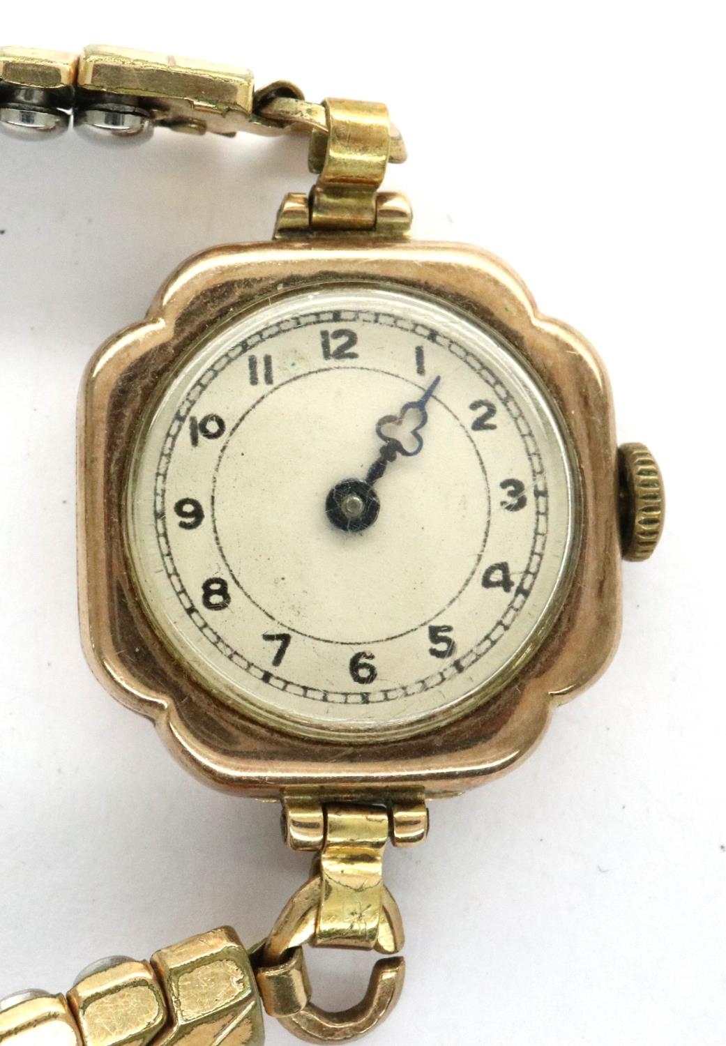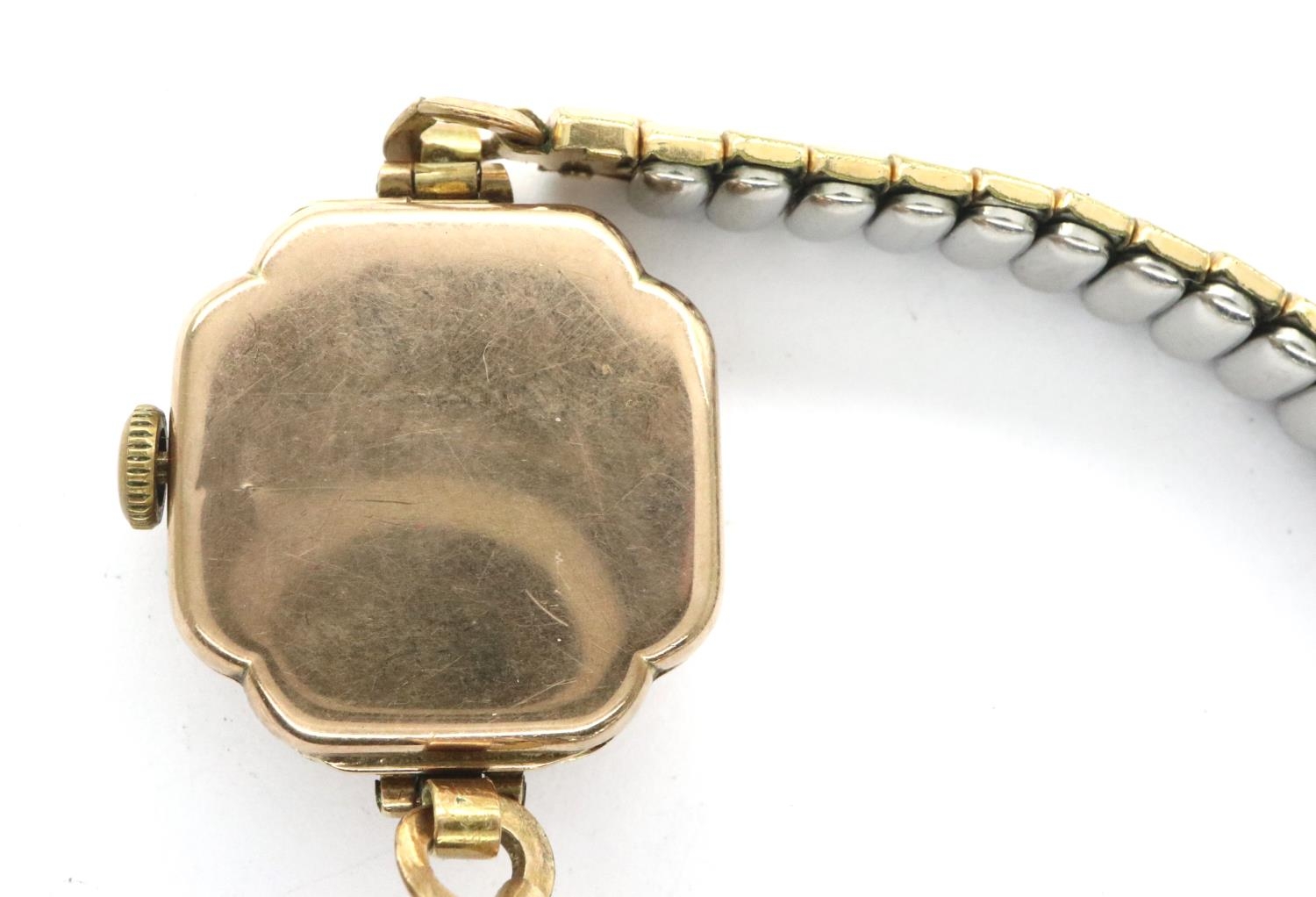 Ladies 9ct gold wristwatch on a plated strap, not working at lotting. P&P Group 1 (£14+VAT for the first lot and £1+VAT for subsequent lots)