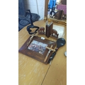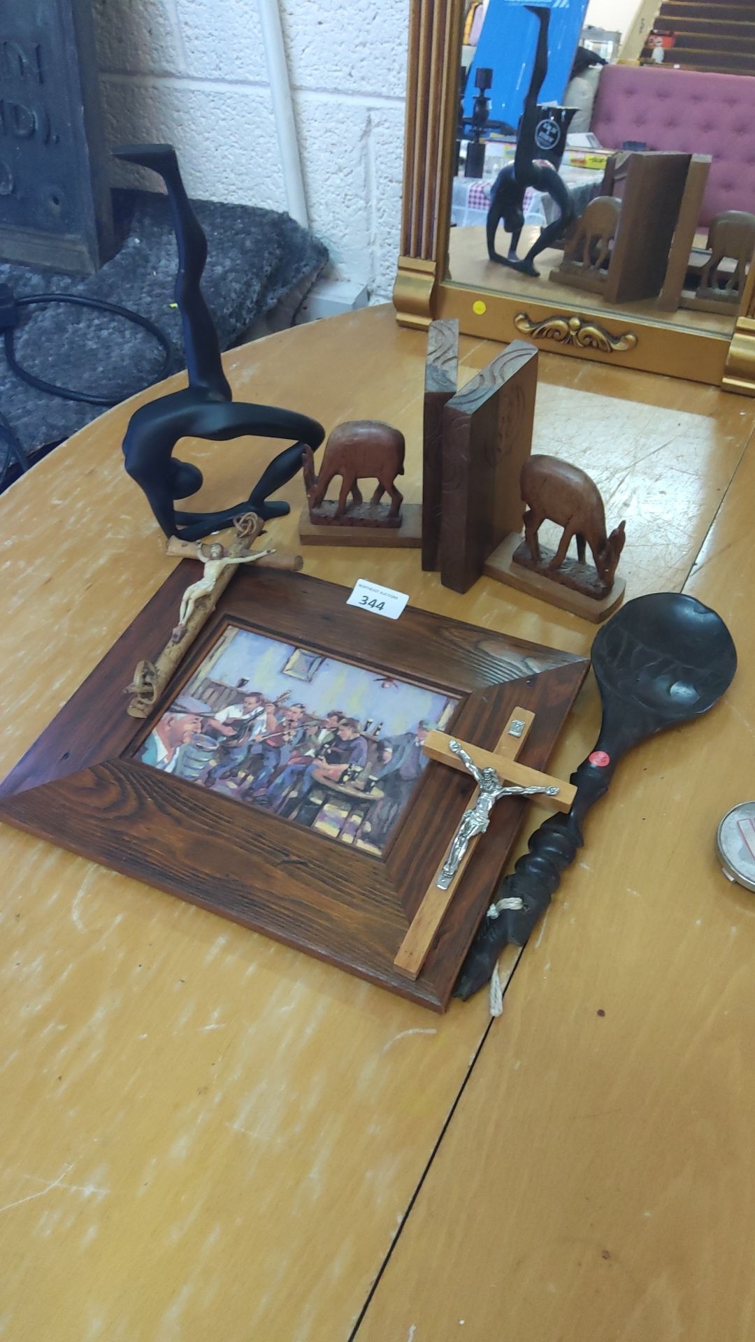 Mixed lot of decorative items including a framed painting, wooden carvings, crucifix, and abstract black figurine.
