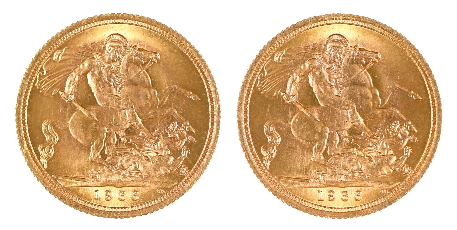 Coins. Elizabeth II gold Sovereigns, 1966, almost BU (2)