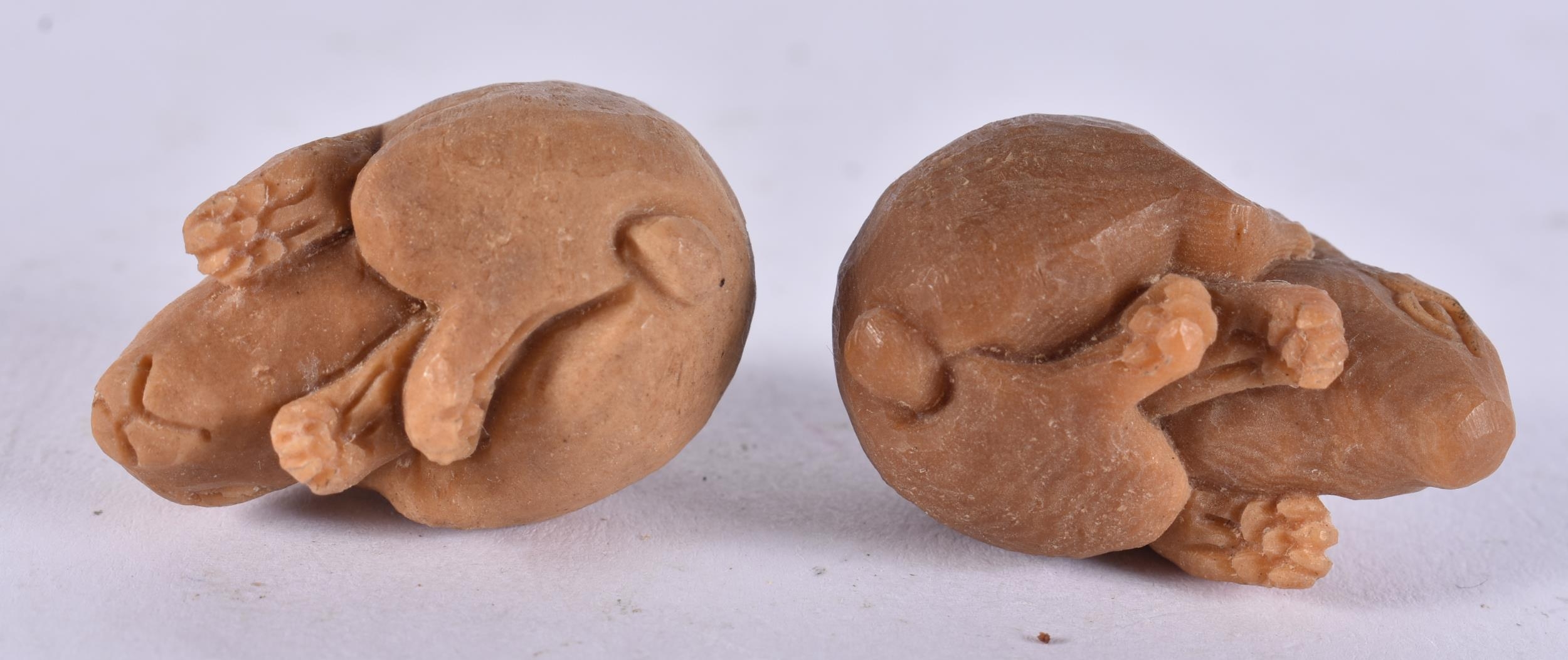 TWO JAPANESE TAGUA NUT RABBITS. 18 grams. 2.25 cm x 3.25 cm. (2)