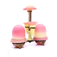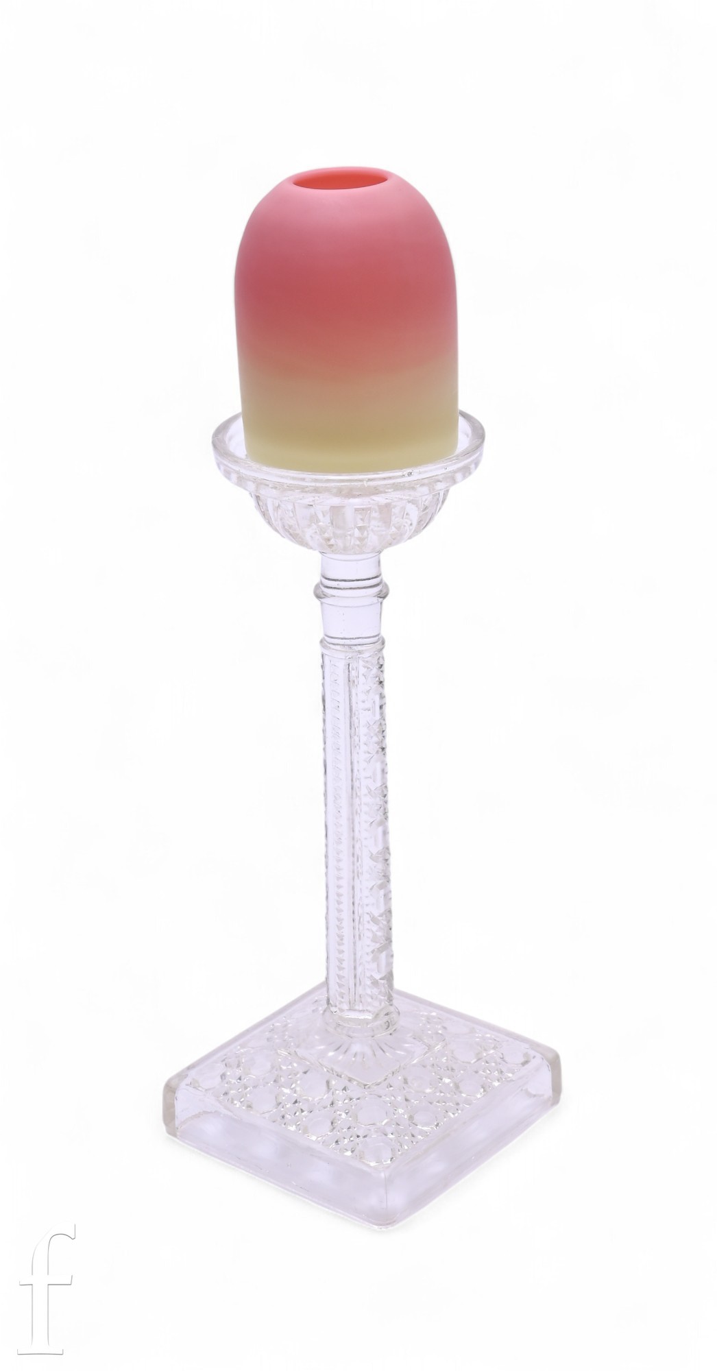 A late 19th Century Thomas Webb and Sons Queens Burmese Pyramid night light in a graduated pale pink to yellow, raised to a pressed flint glass base with upper cup, facet and diamond stem and square base, height 30cm.