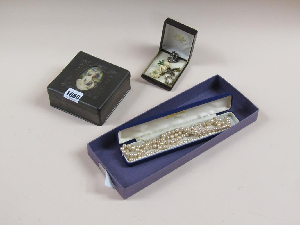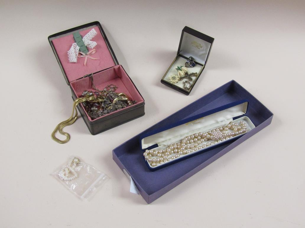 BOX OF GILT AND WHITE METAL COSTUME JEWELLERY; STRING OF PEARL BEADS
