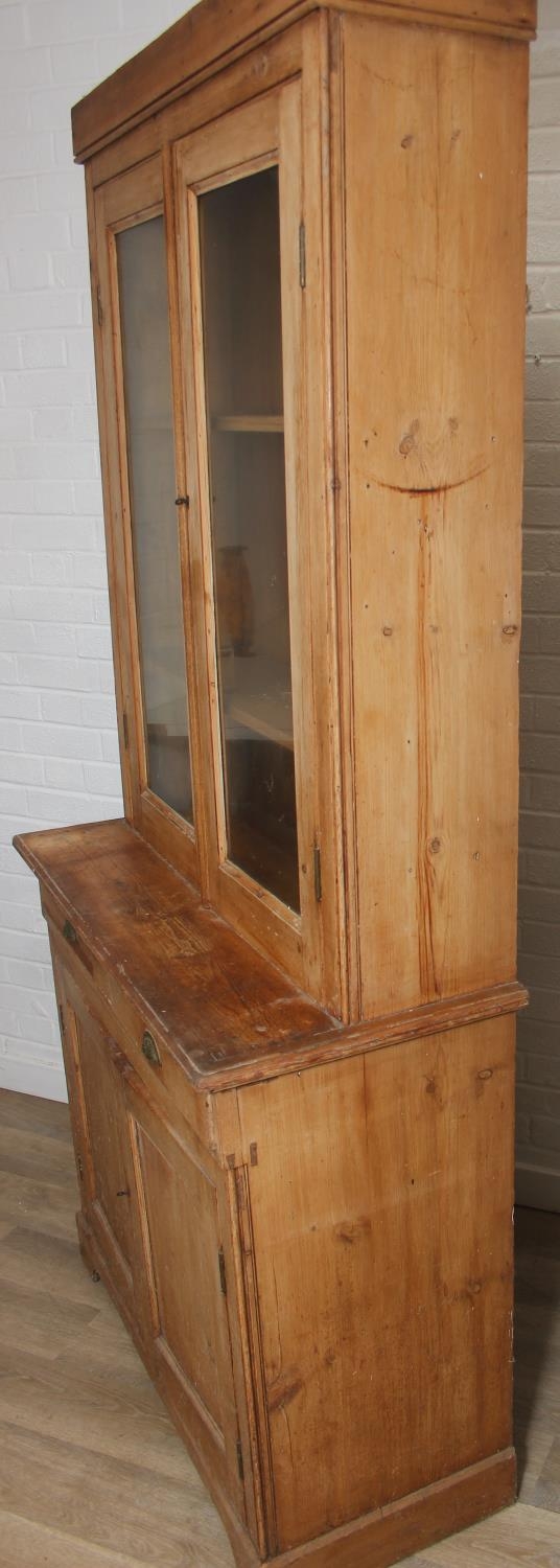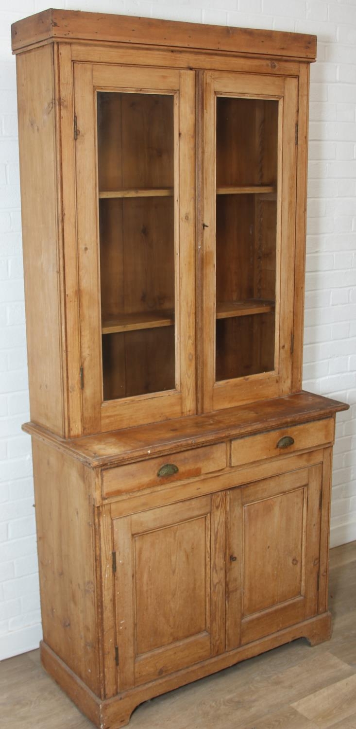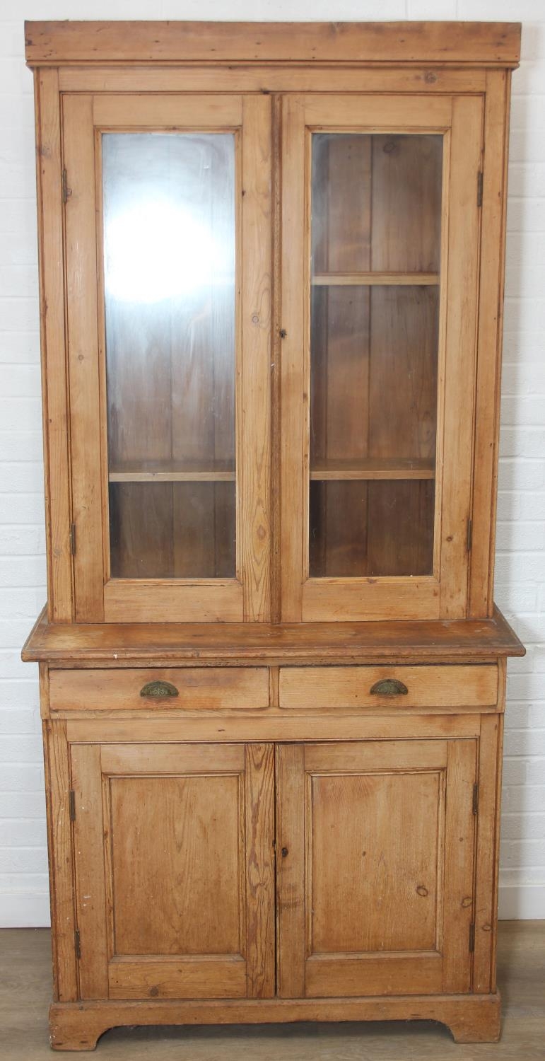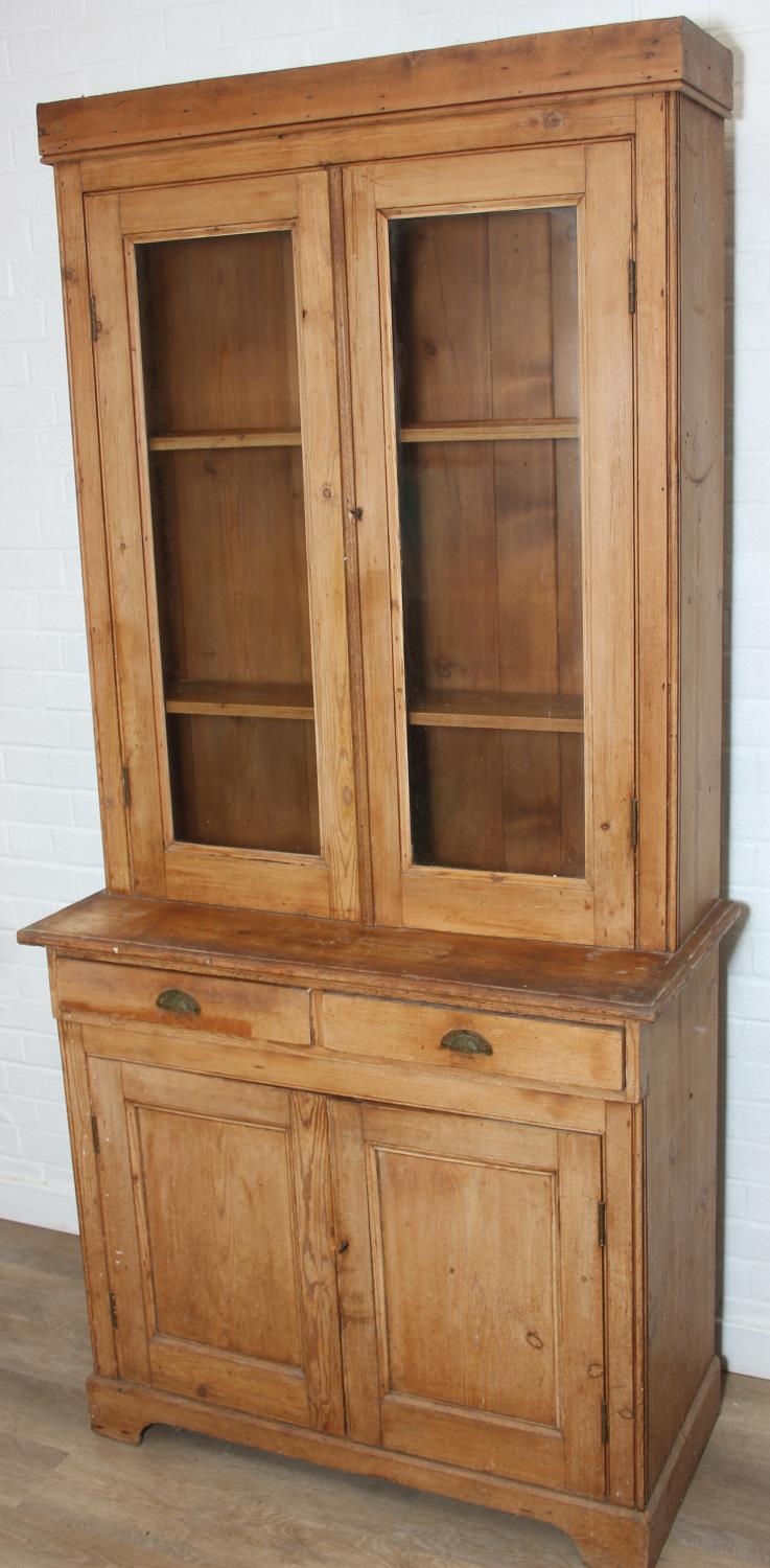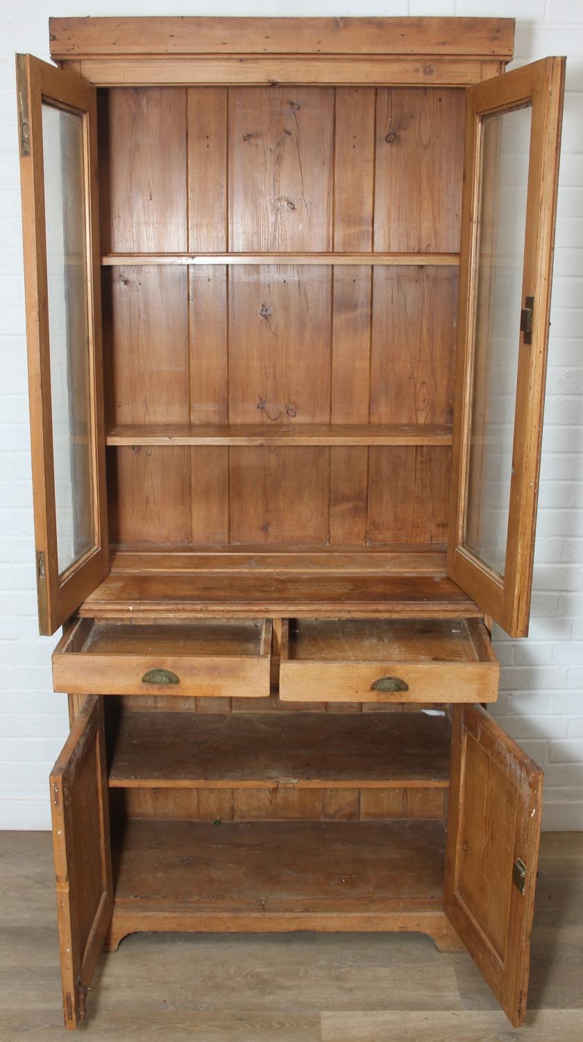 An antique pine bookcase, two glazed doors over two drawers over a double cupboard, the drawers with iron cup handles, 102cm x 46cm x 215cm