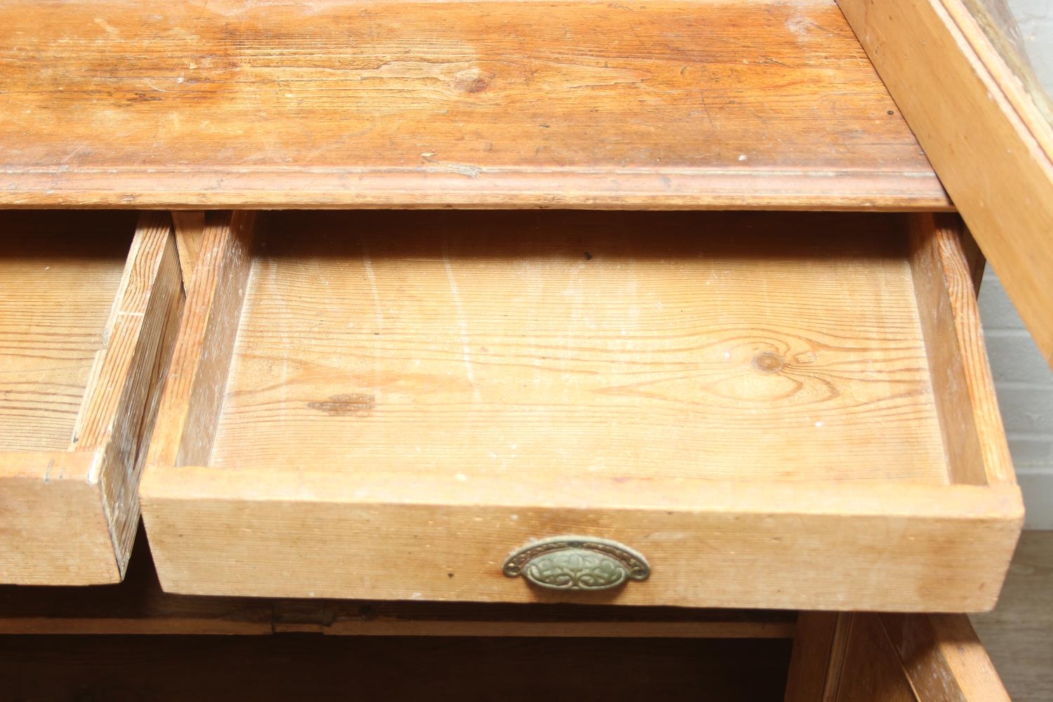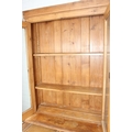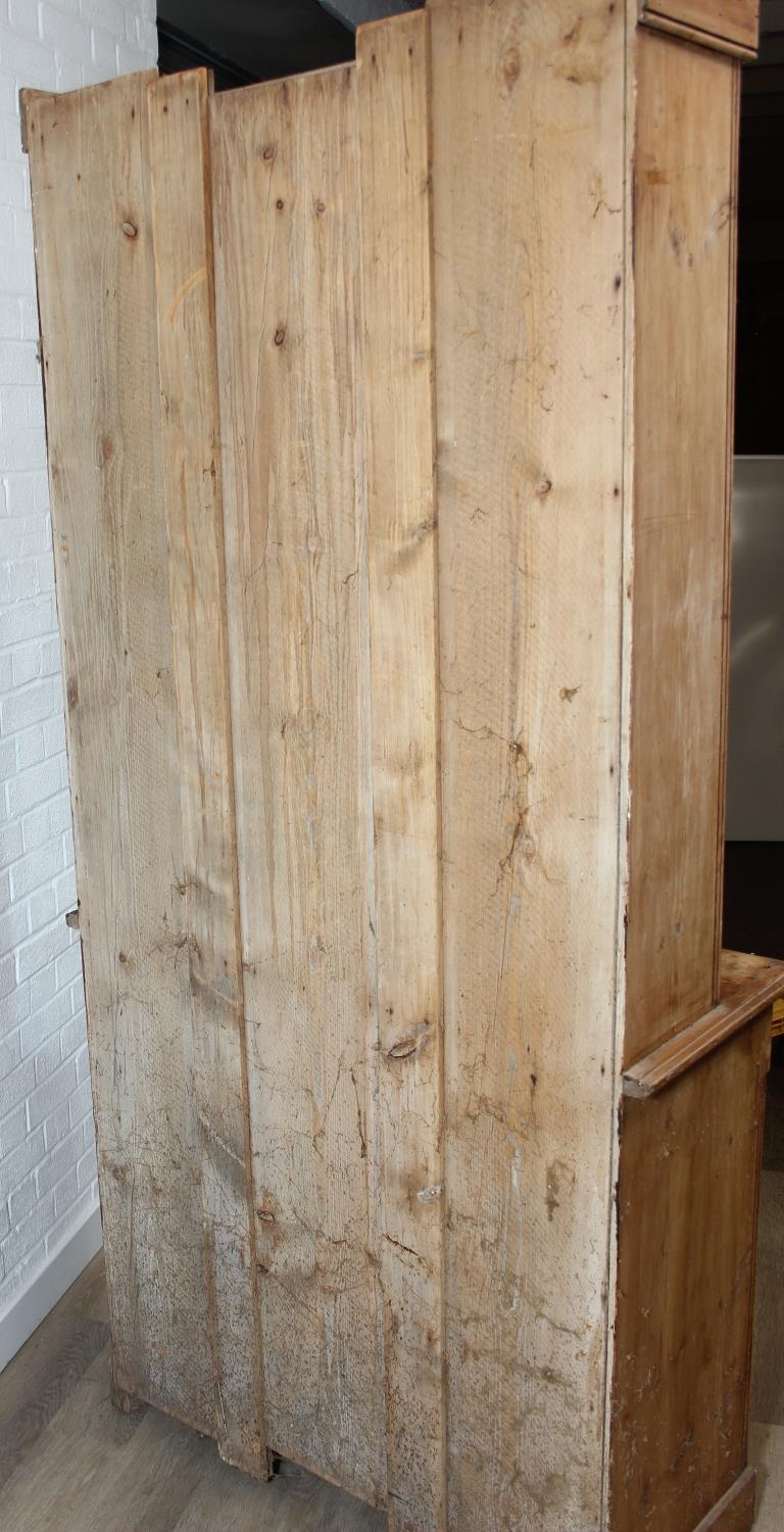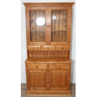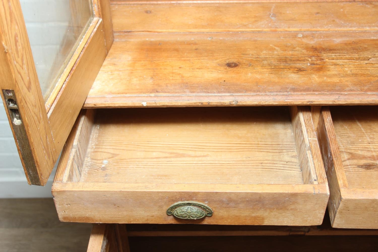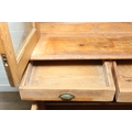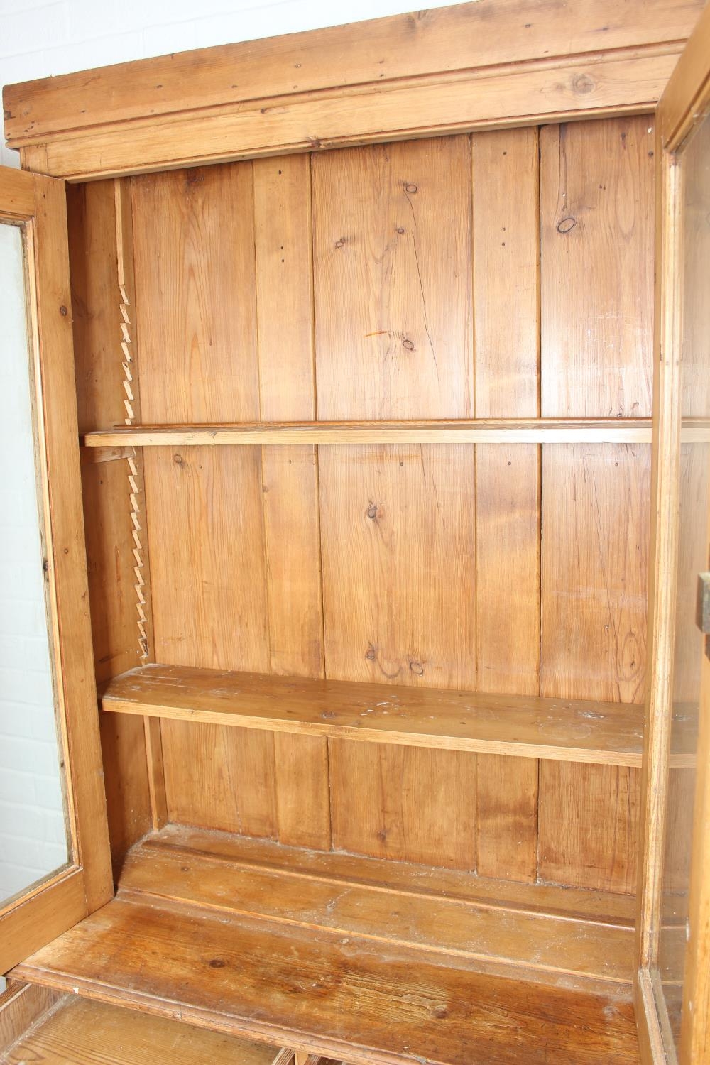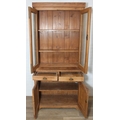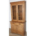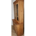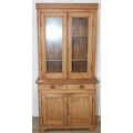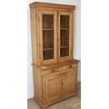 An antique pine bookcase, two glazed doors over two drawers over a double cupboard, the drawers with iron cup handles, 102cm x 46cm x 215cm