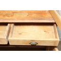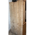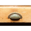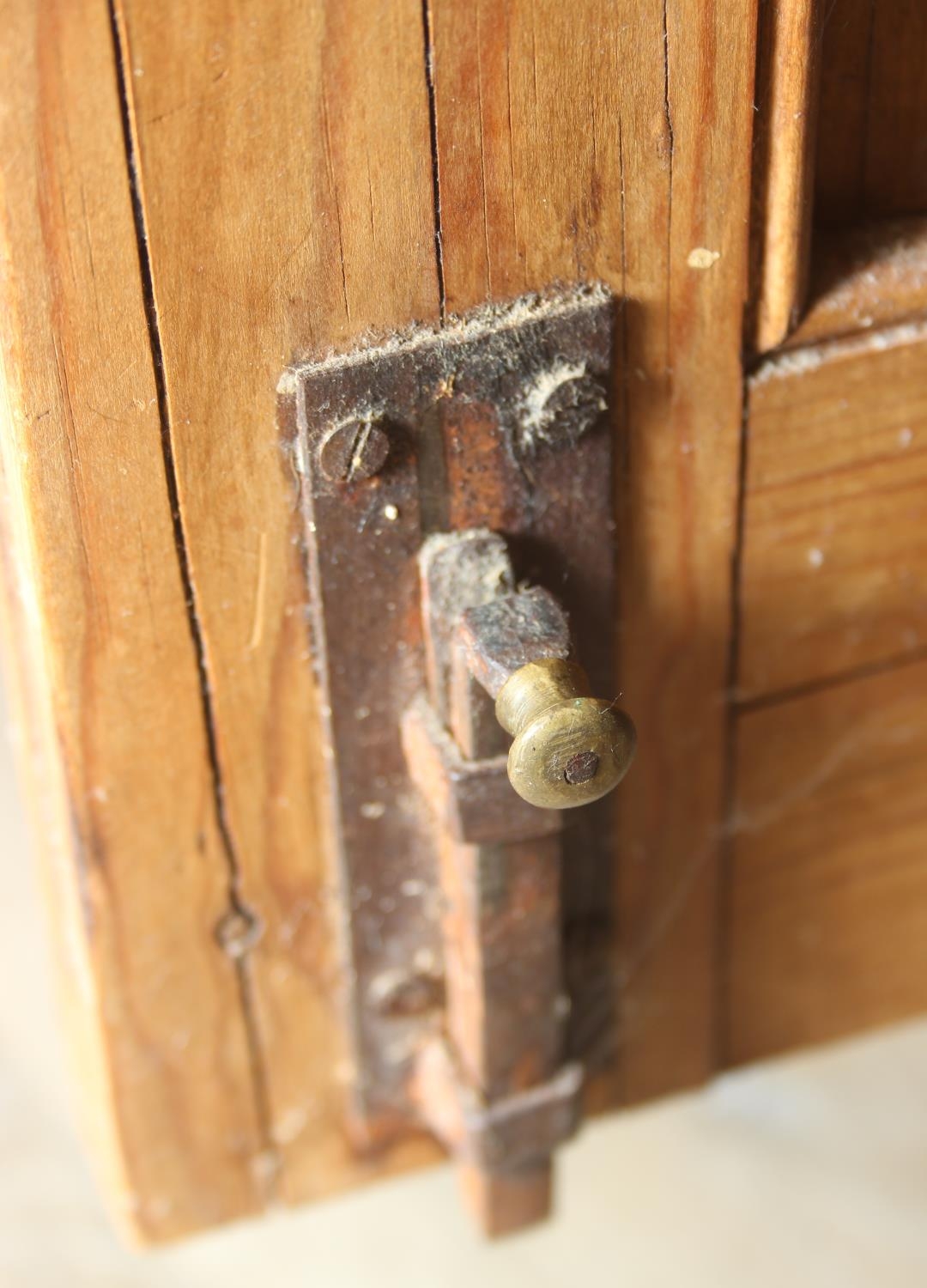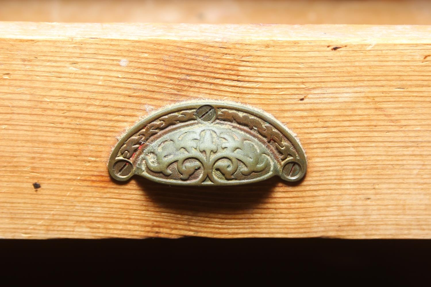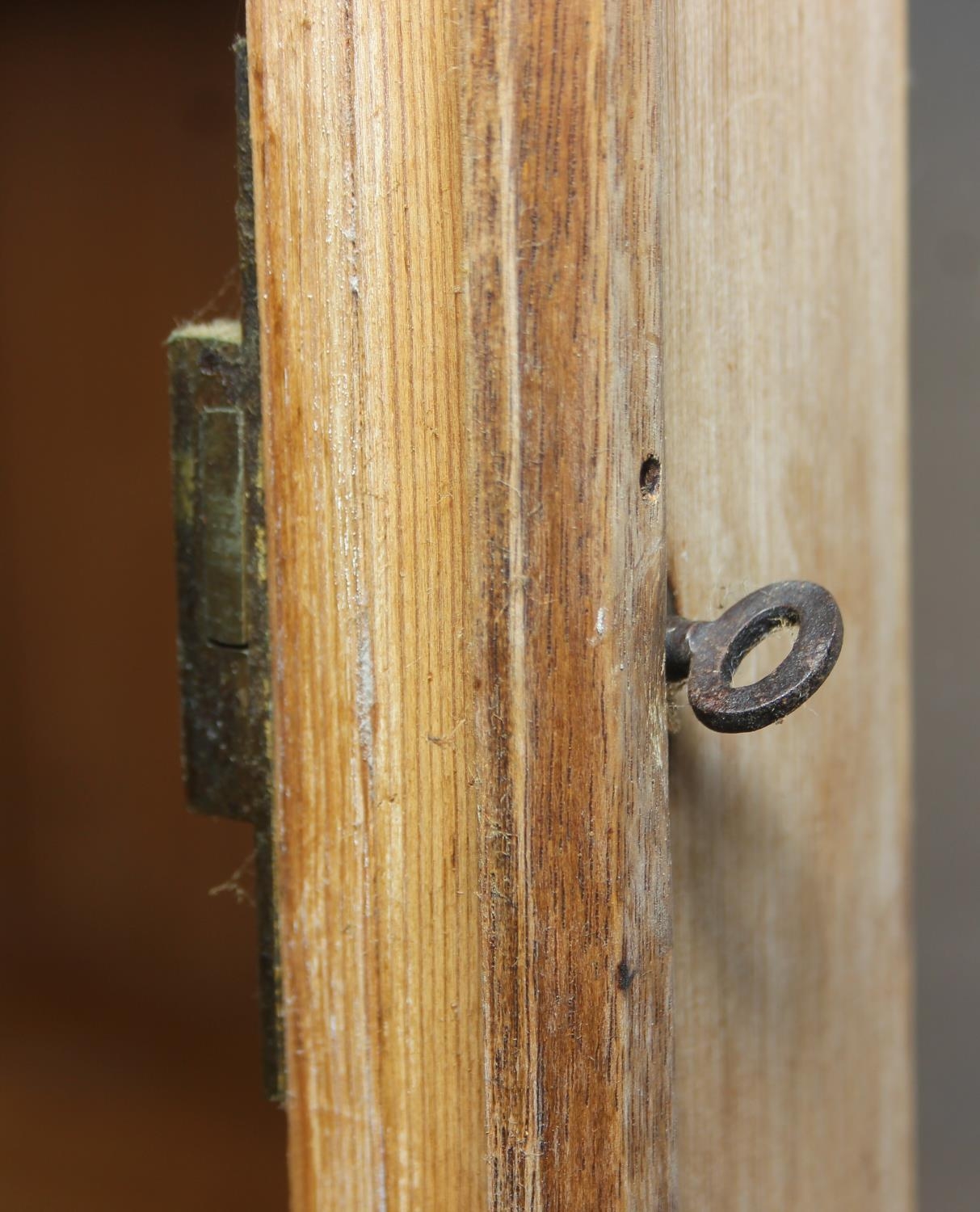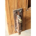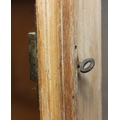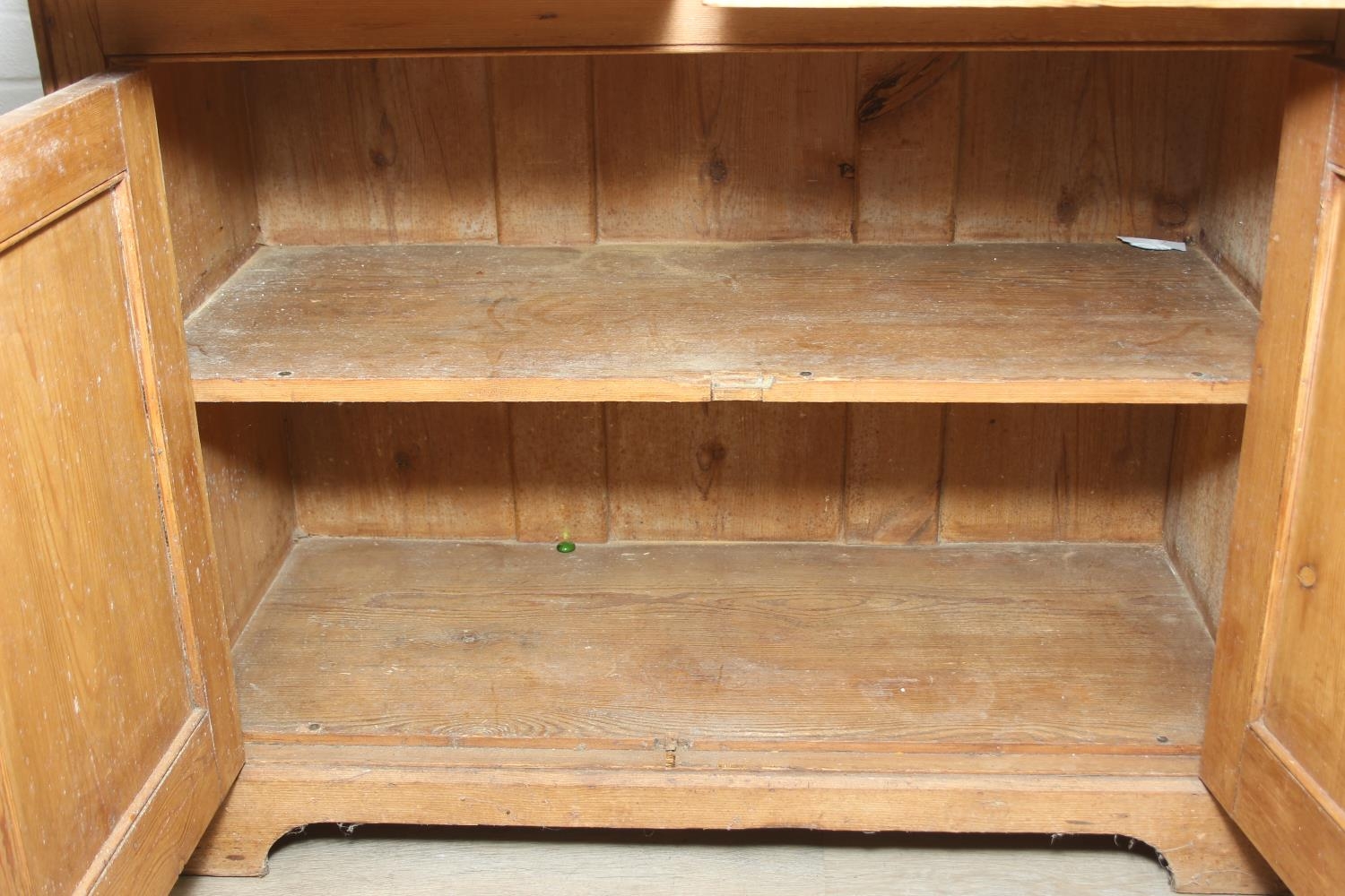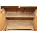 An antique pine bookcase, two glazed doors over two drawers over a double cupboard, the drawers with iron cup handles, 102cm x 46cm x 215cm