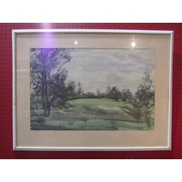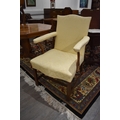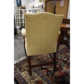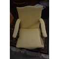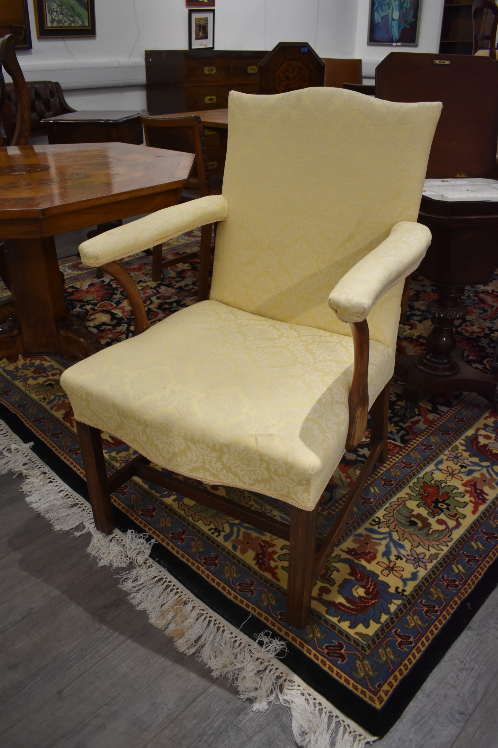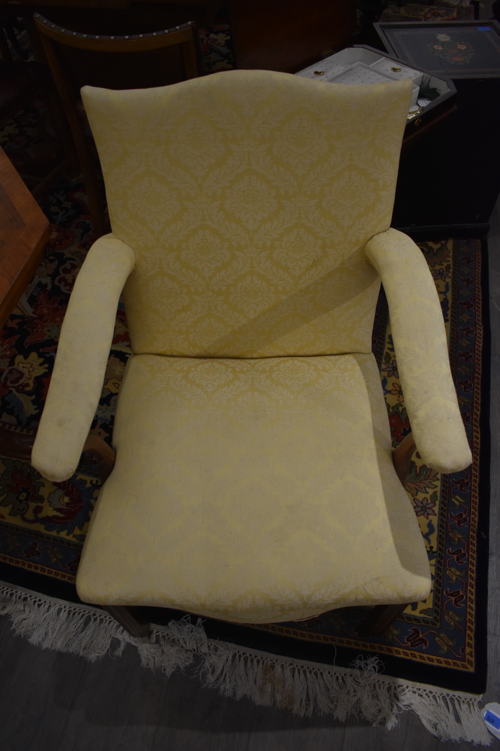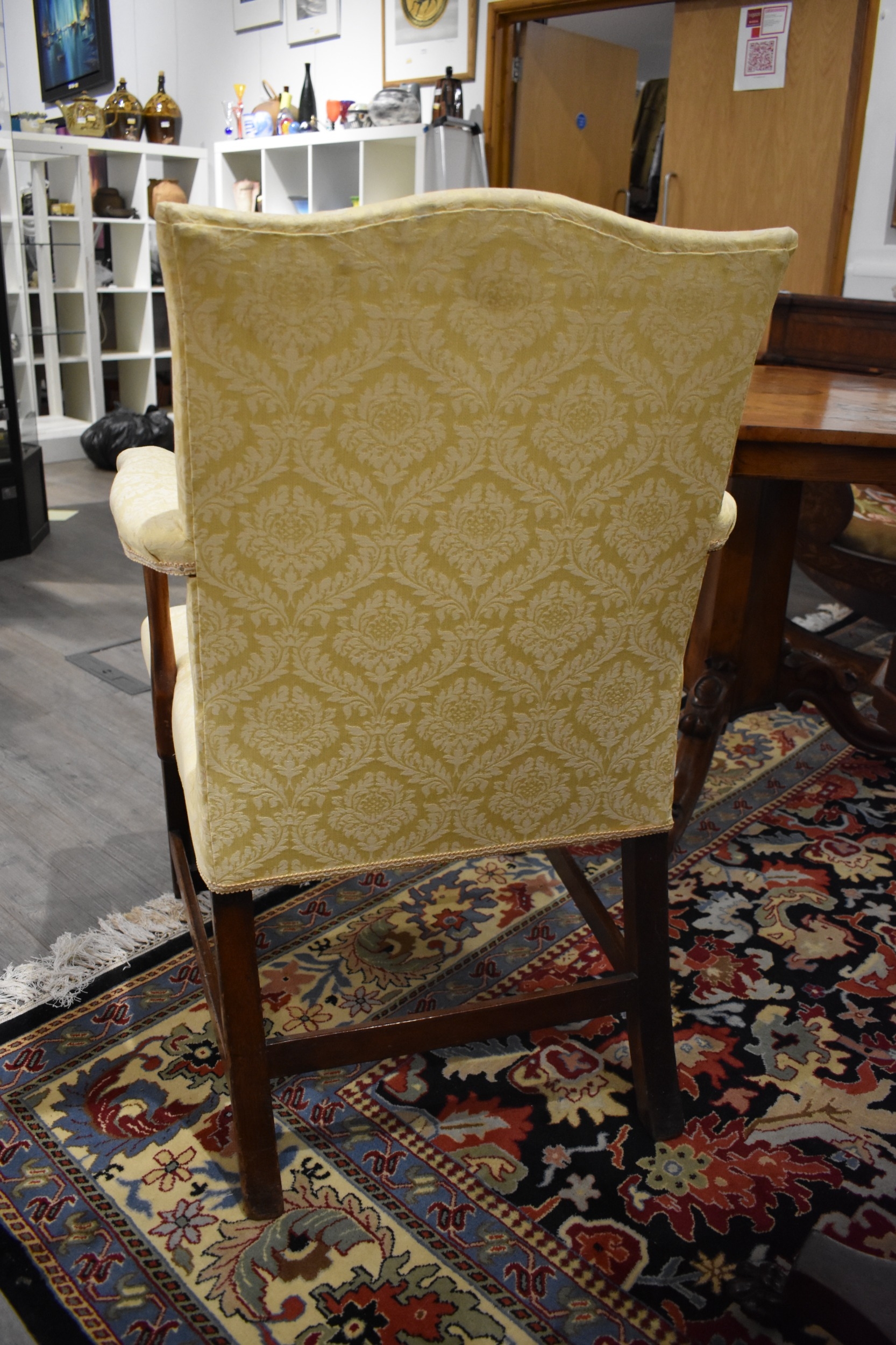 A Gainsborough style chair with yellow silk upholstery, curved arms, square legs, seat is 58cm wide