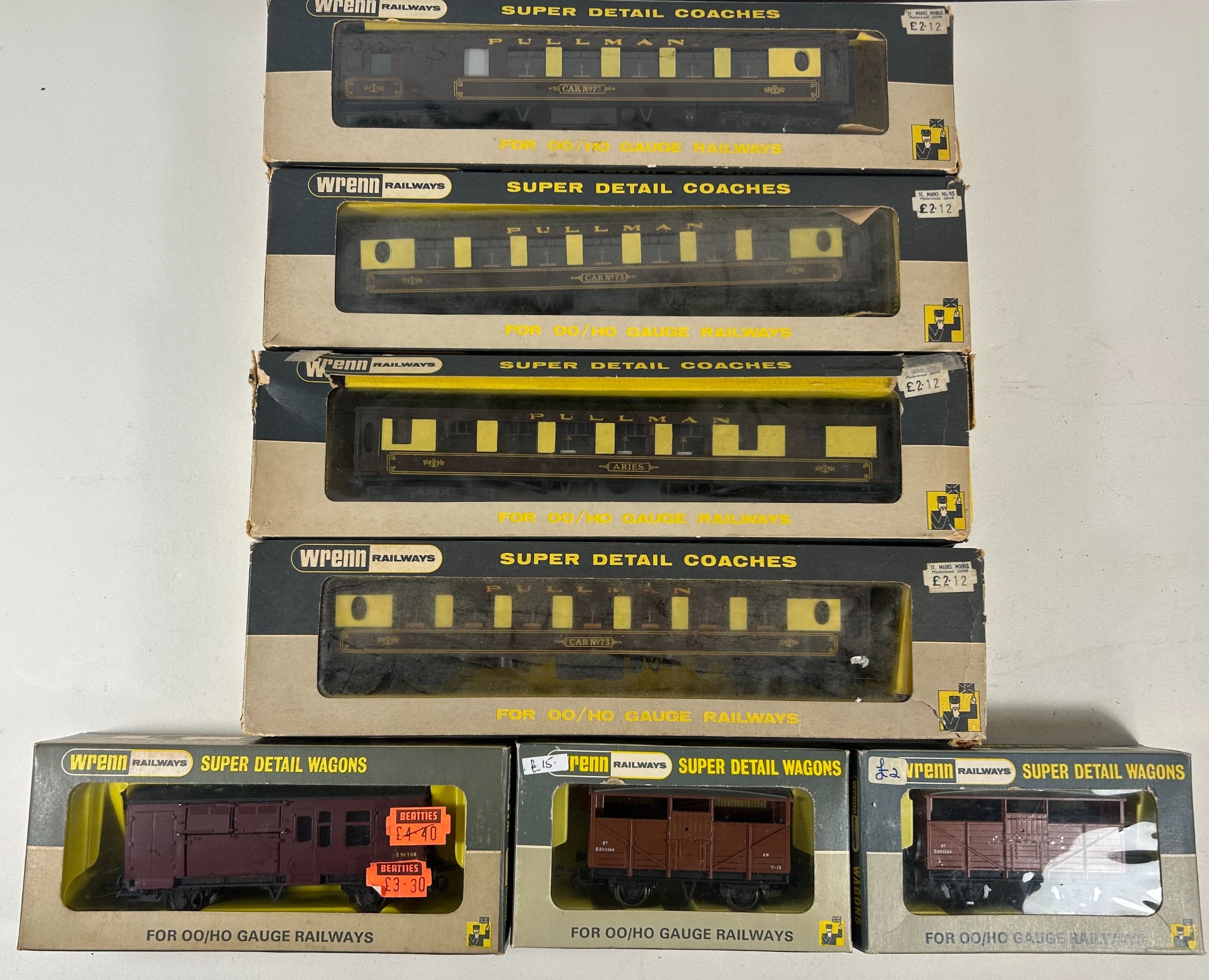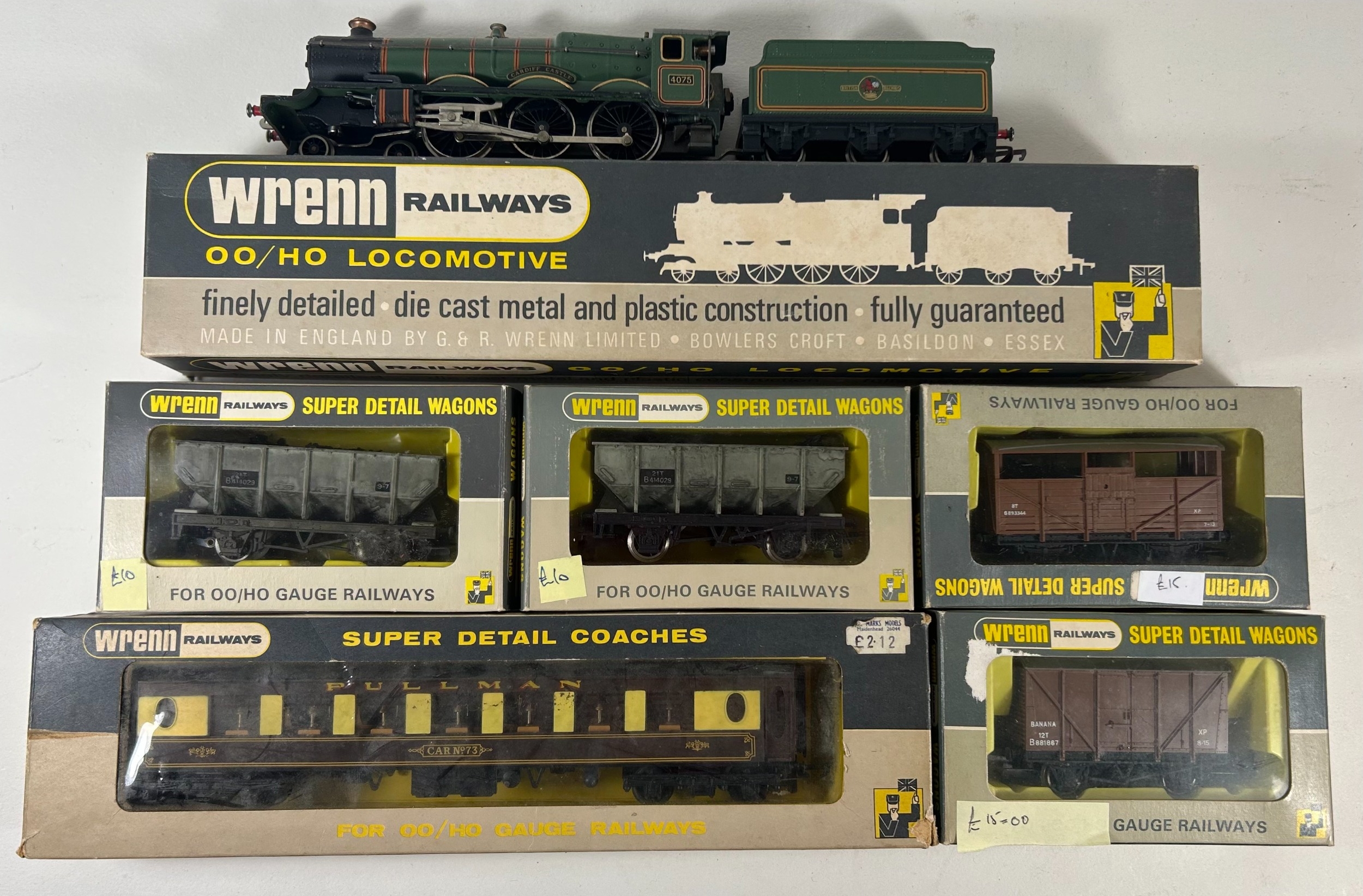 A small quantity of Wrenn Railways. A BR Castle Class 4-6-0 Tender Locomotive 4075 'Cardiff Castle' (W2221). Together with 5 PULLMAN CARS -ARIES, CAR NO.7 and 3x CAR No.73. Plus 7 freight wagons including a Horse Box and 3x Cattle Wagons. All boxed, worn/damaged. Contents GC-VGC.