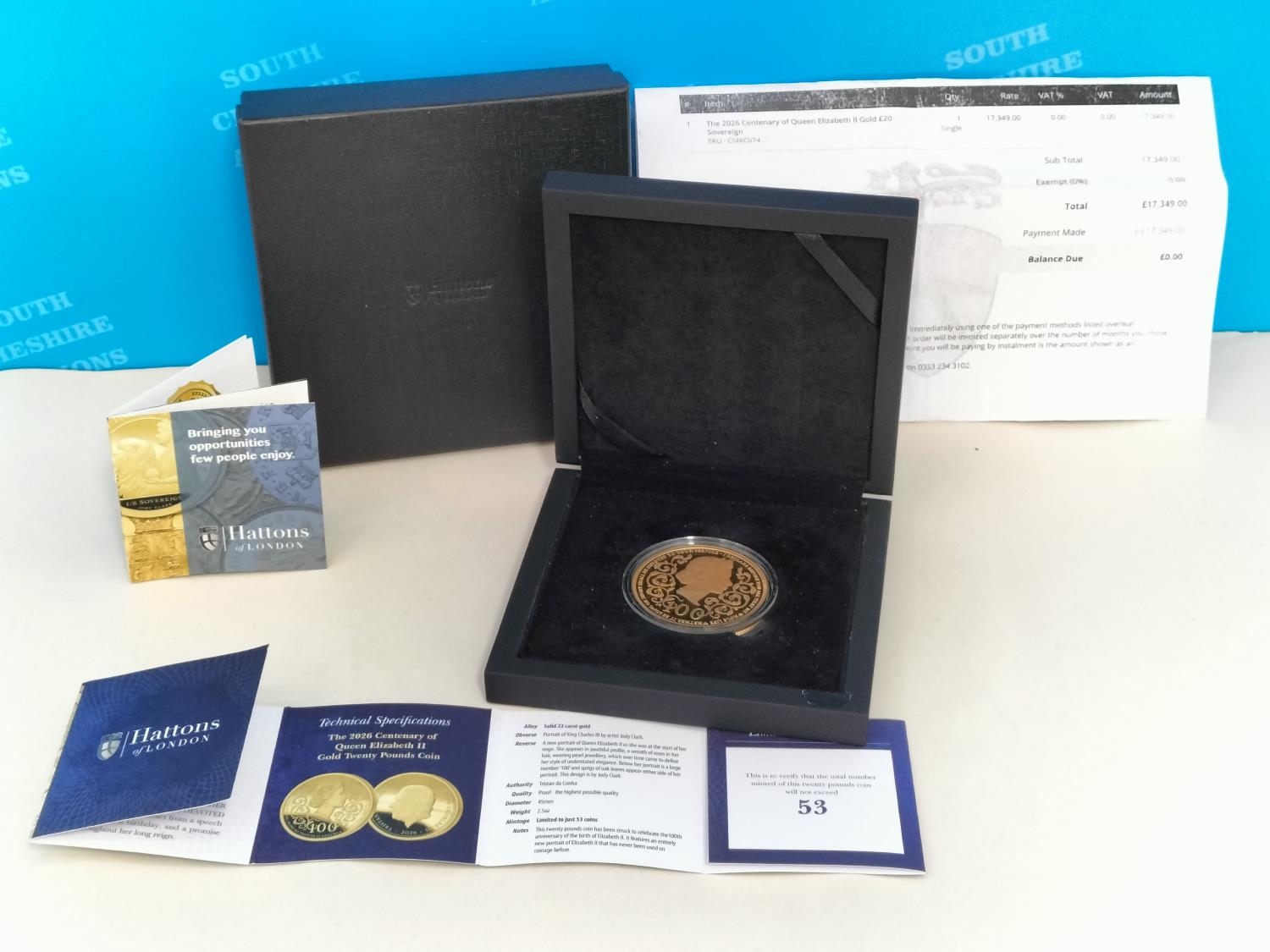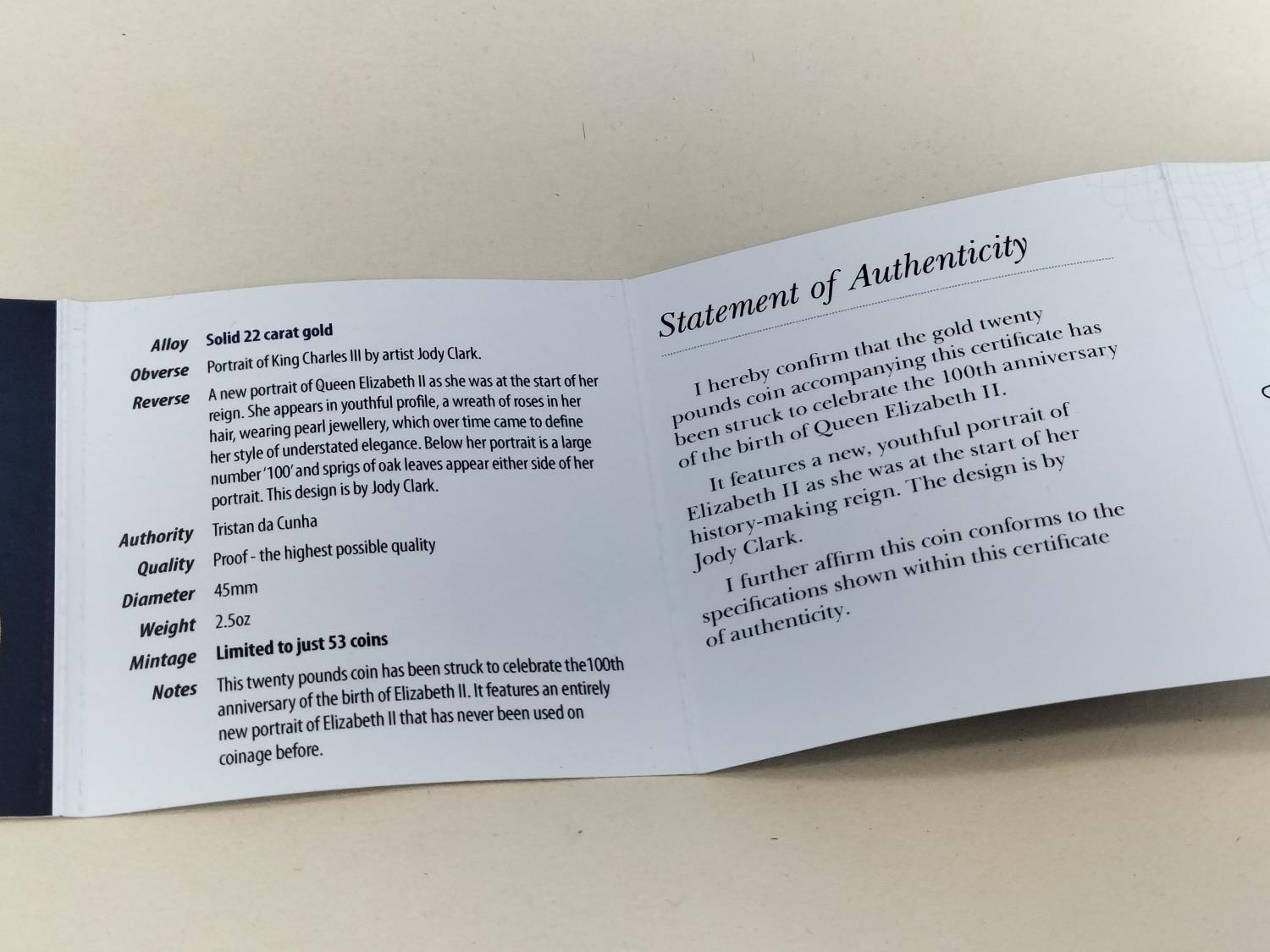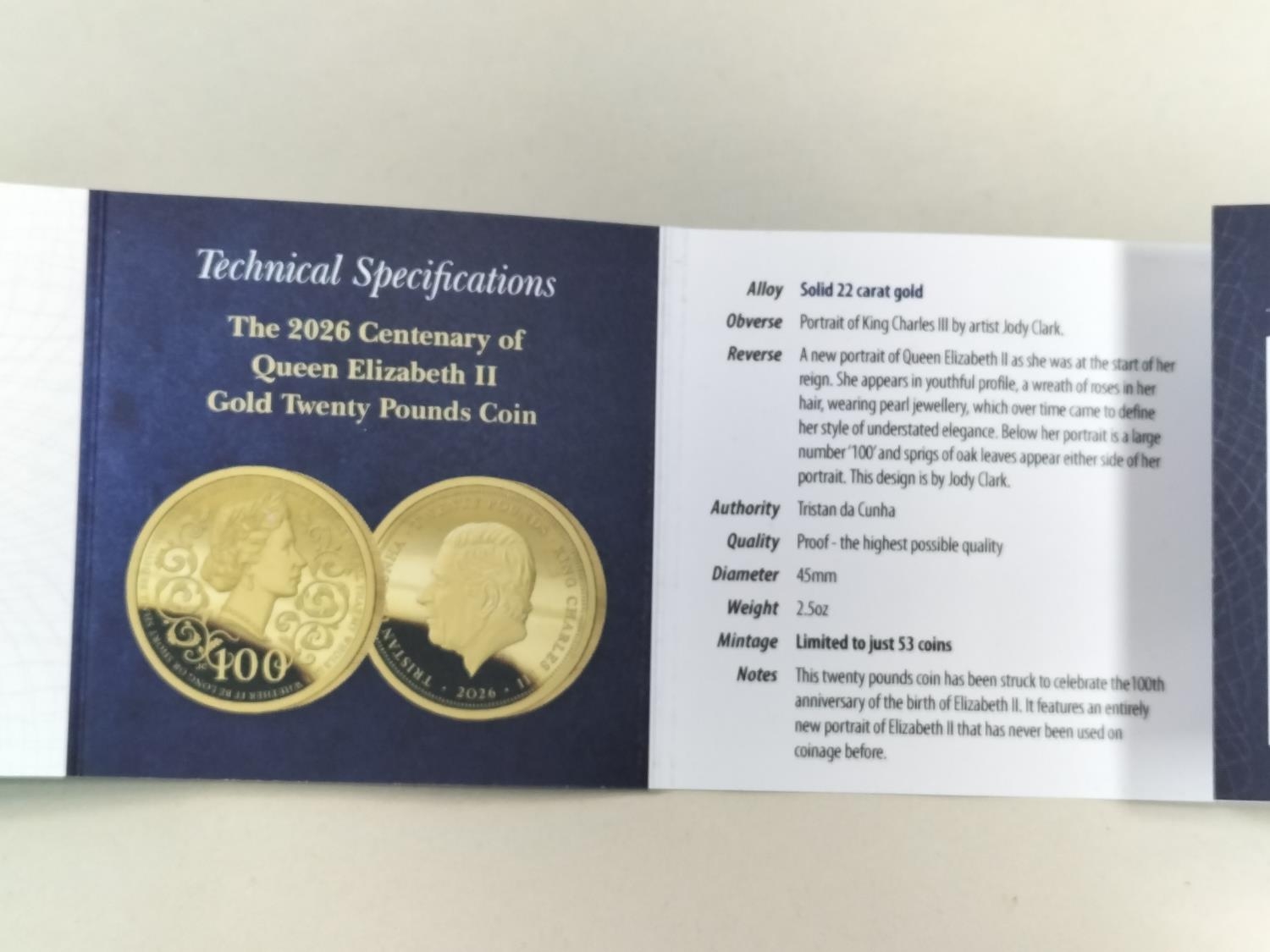 Rare Hatton's of London 2026 King Charles III Tristan Da Cunha 22ct Gold Twenty Pound Coin '100th Anniversary of the Birth of Queen Elizabeth II'. Limited Mint of 53 Worldwide. Weight 2.5oz (70.8 Grams), Cased.