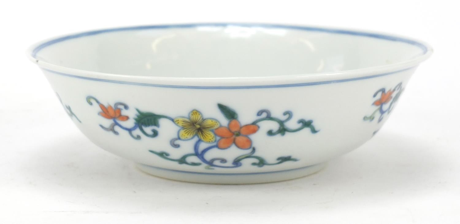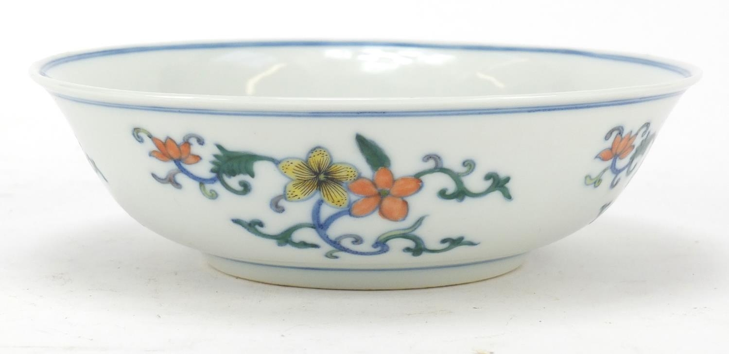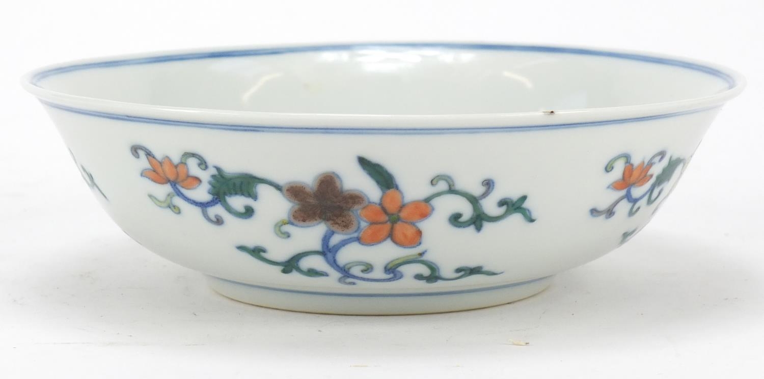Chinese doucai porcelain shallow bowl hand painted with flowers, six figure character marks to the base, 17.5cm in diameter