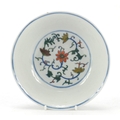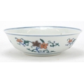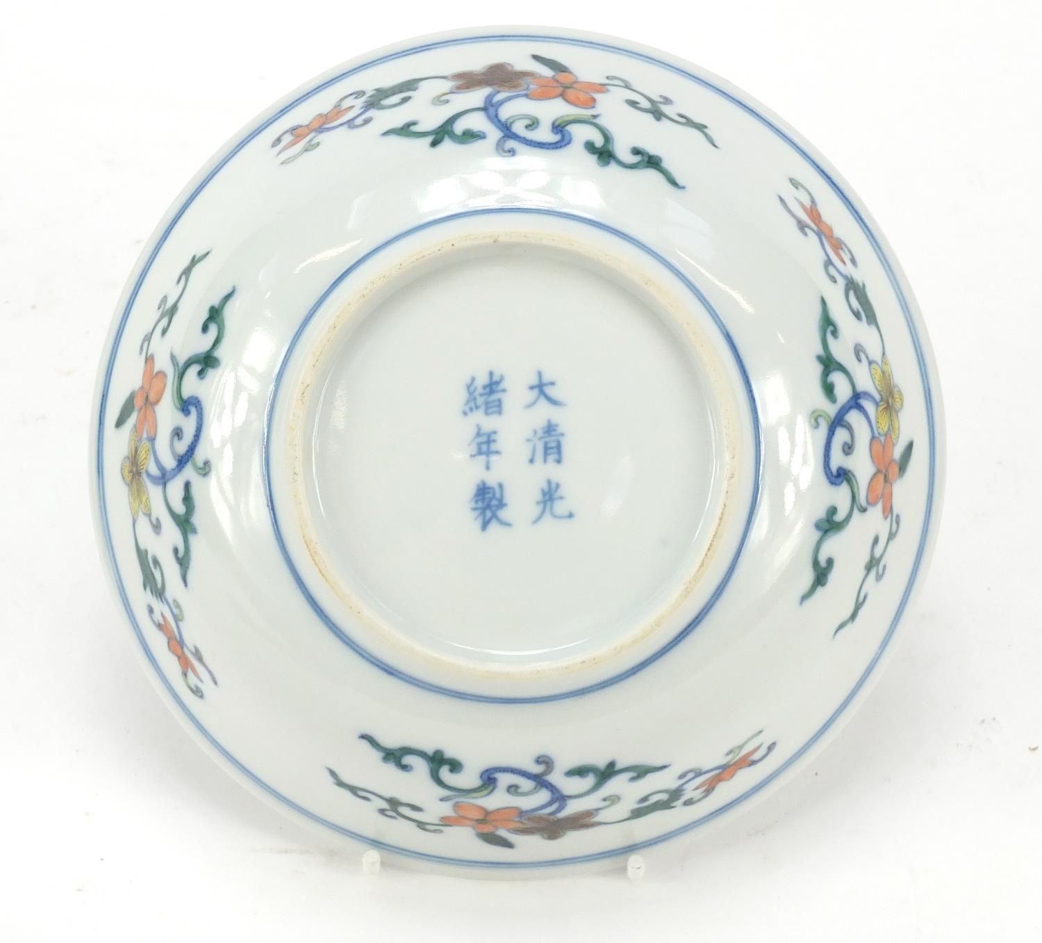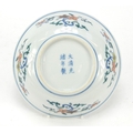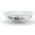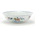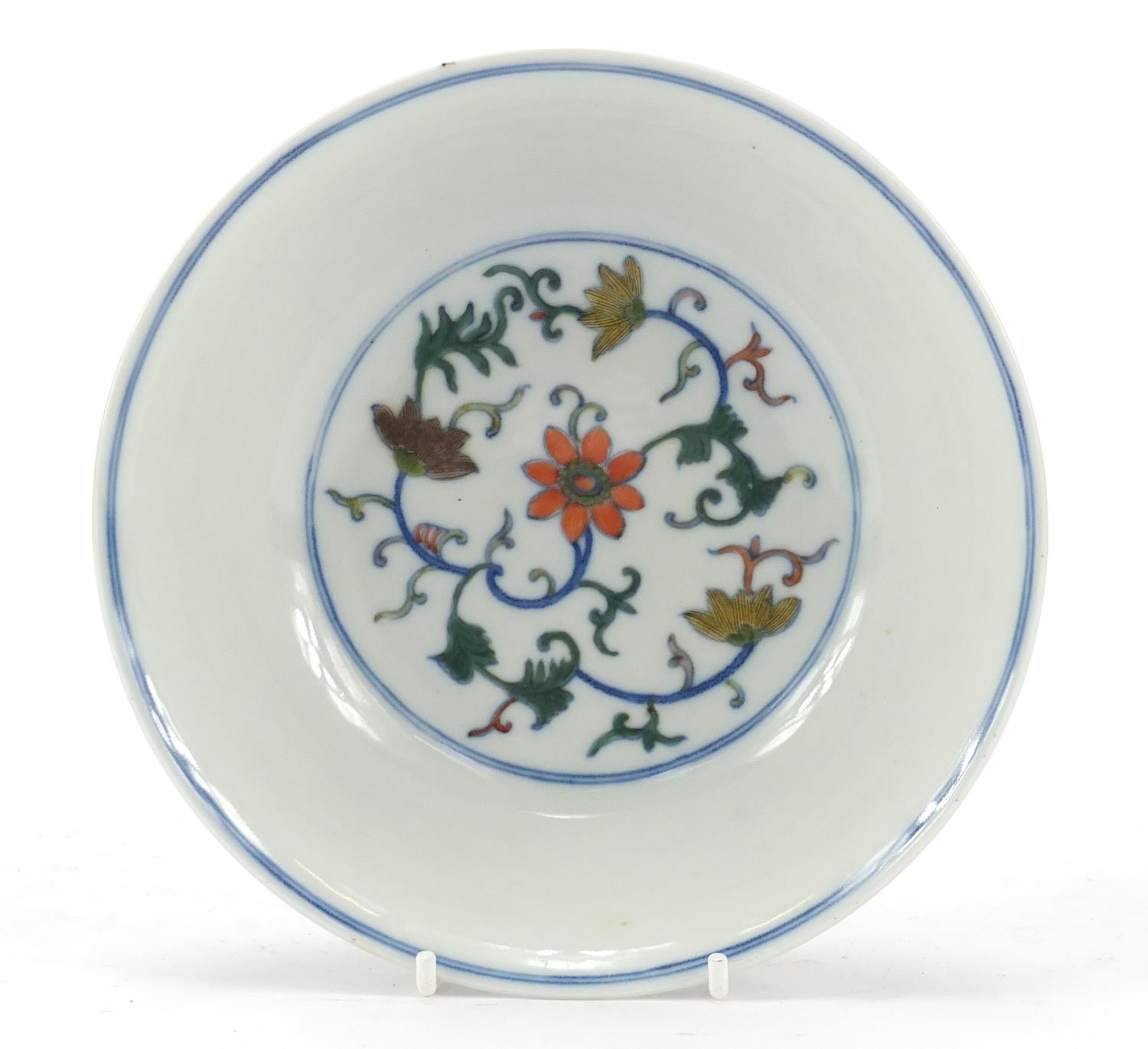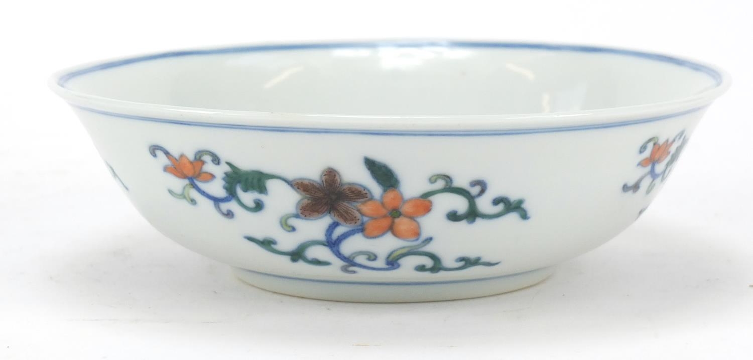 Chinese doucai porcelain shallow bowl hand painted with flowers, six figure character marks to the base, 17.5cm in diameter