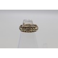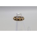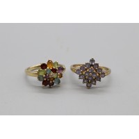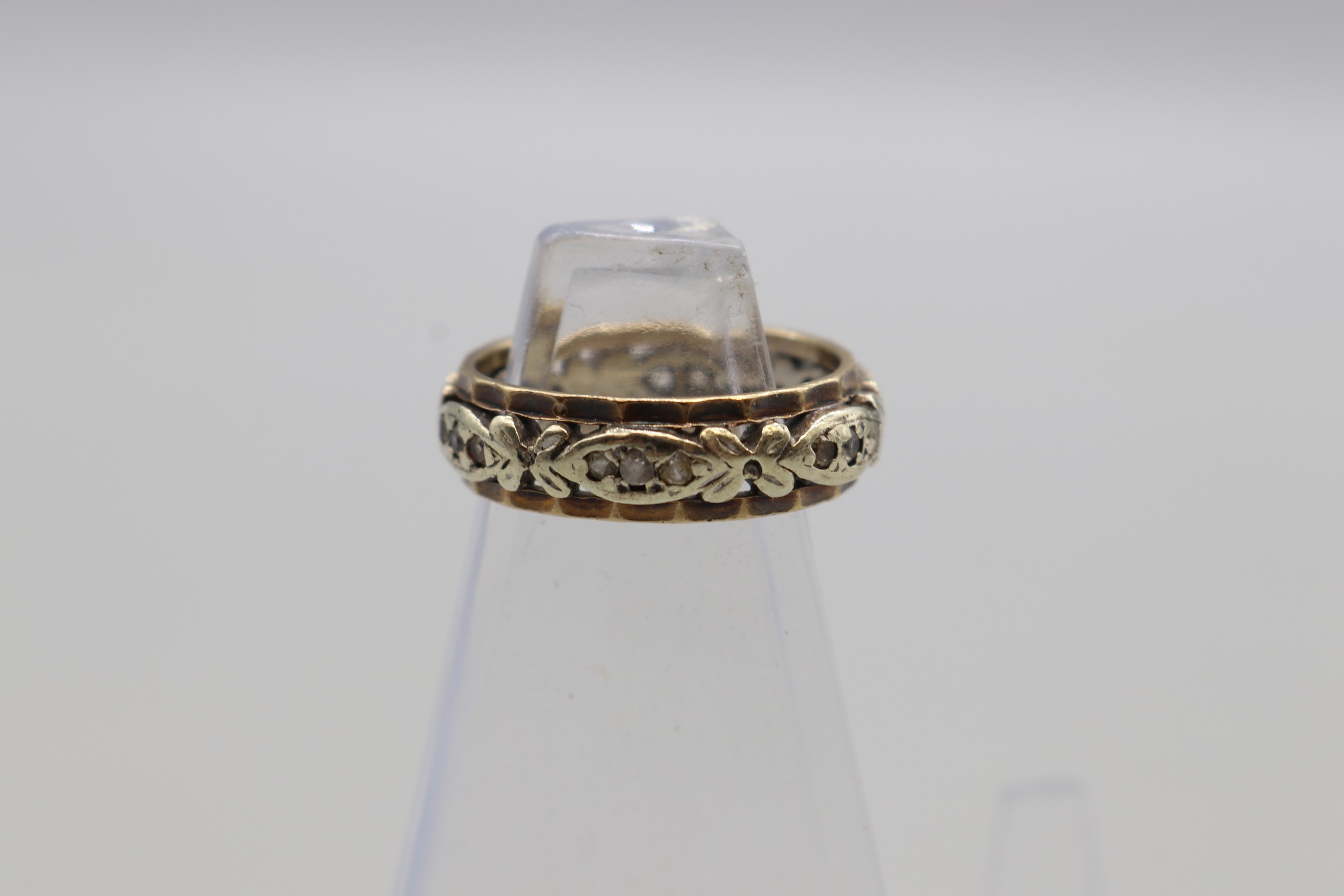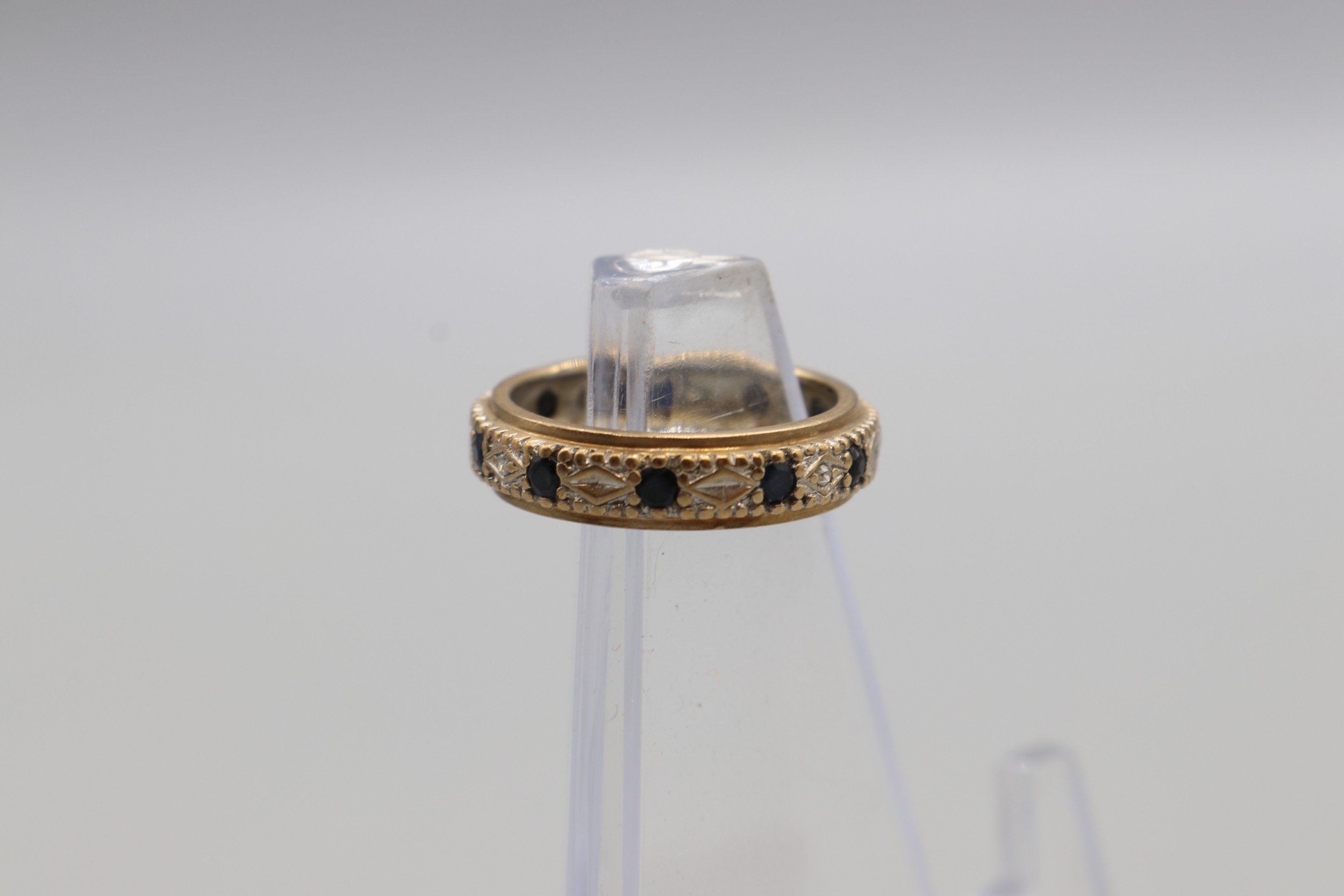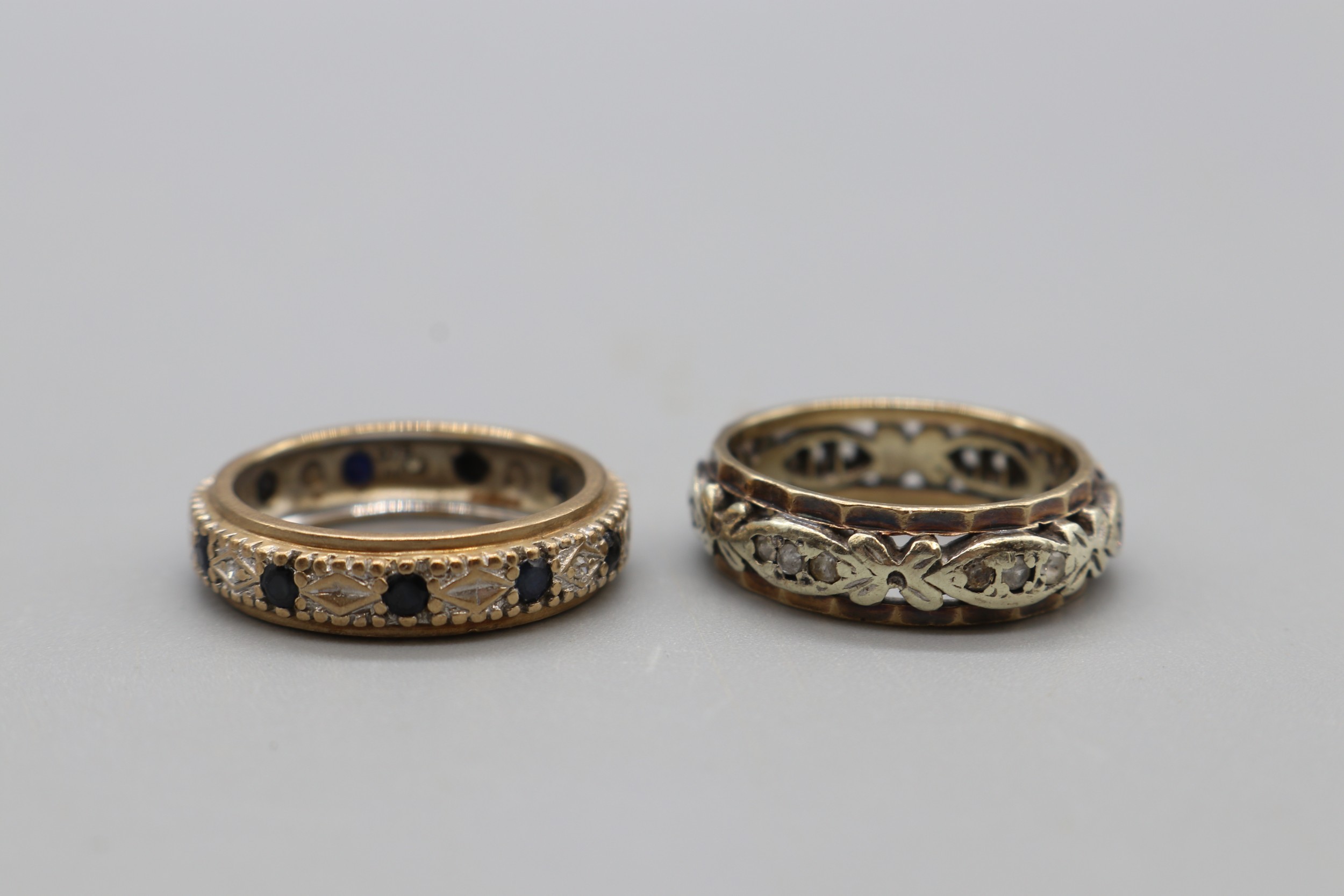 Two stone-set full band rings, comprising a stamped 9ct sapphire and diamond full eternity ring with millgrain and diamond-shaped engravings, size K.5, weight 2.77g; and a marked 9ct two-tone yellow gold band ring with pavé-set cubic zirconia, weight 4.55g, size K.5
