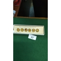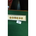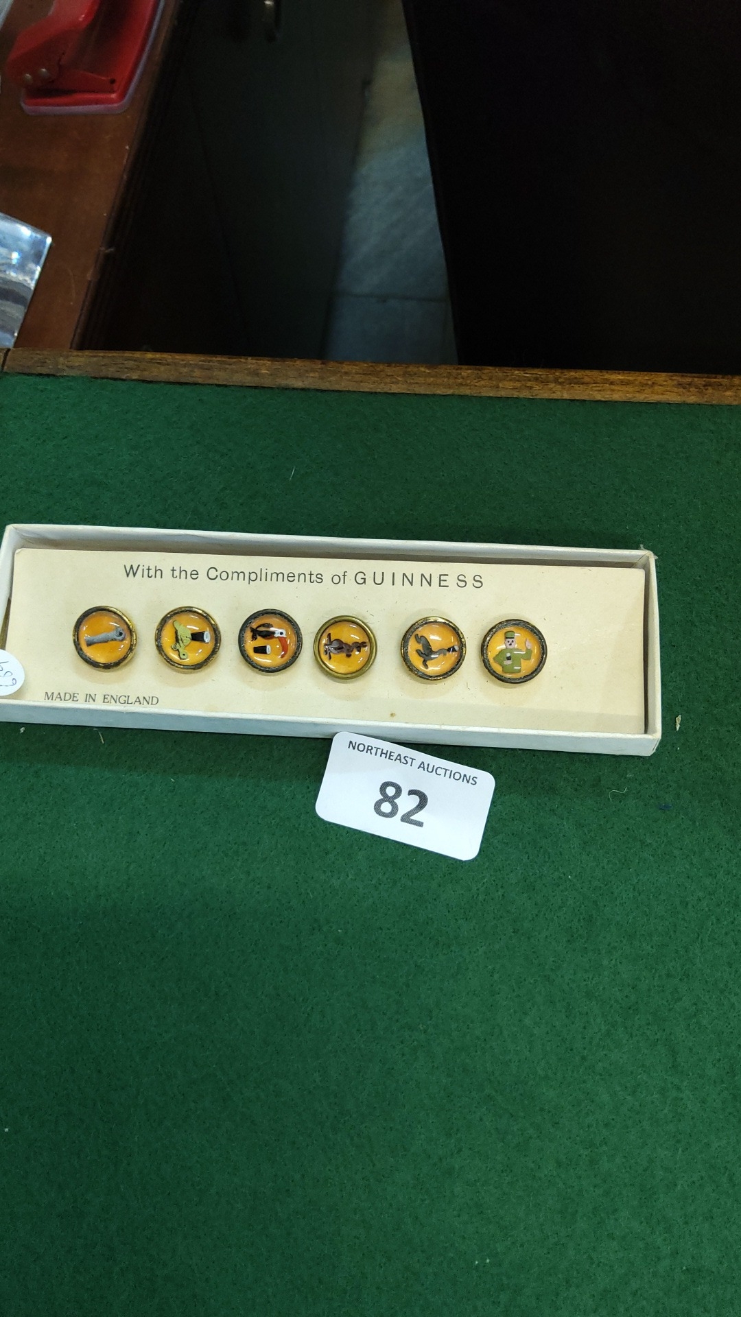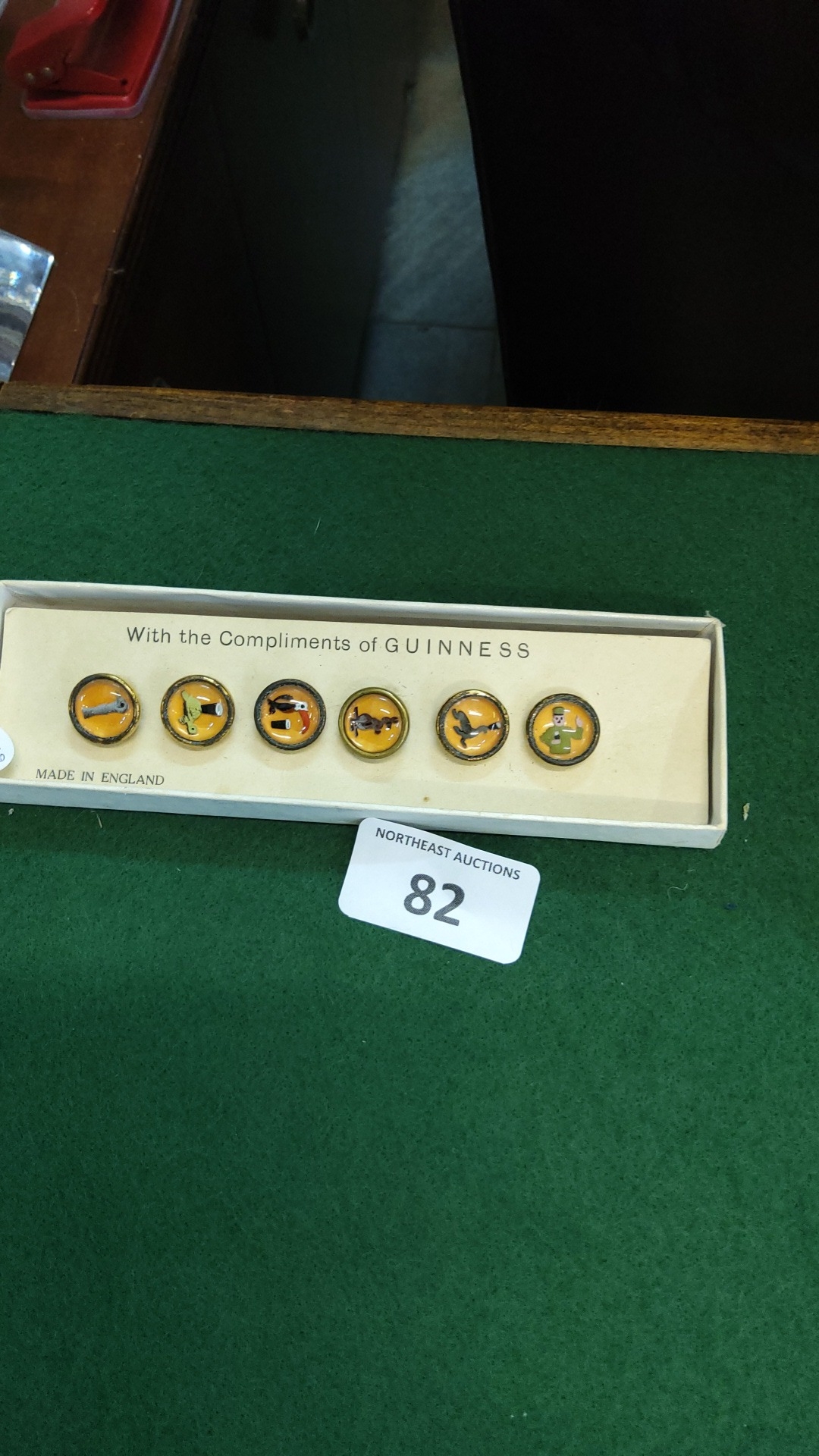 Guinness promotional set of six novelty waistcoat buttons in the original presentation box, each with a domed cabochon top depicting Guinness advertising motifs.