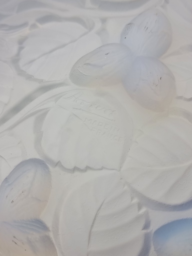 An Arrers opalescent glass dish, moulded with hazelnuts, 24cm diameter.
