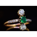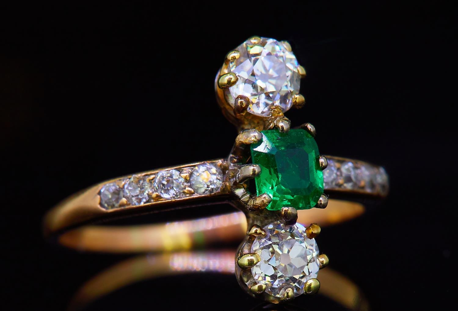 EMERALD AND DIAMOND DRESS RING, set with a central emerald of approx. 0.26 ct. flanked with diamonds on the sides and shoulders totalling approx. 0.66 ct. Size L. 2.3 grams.