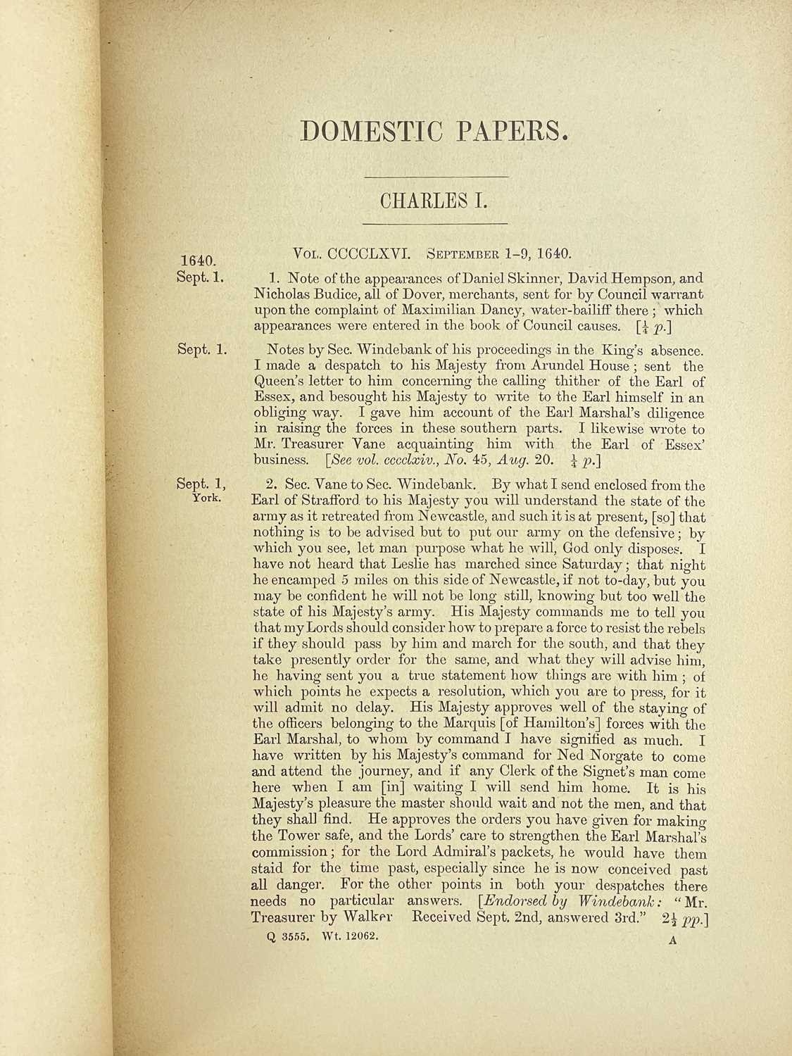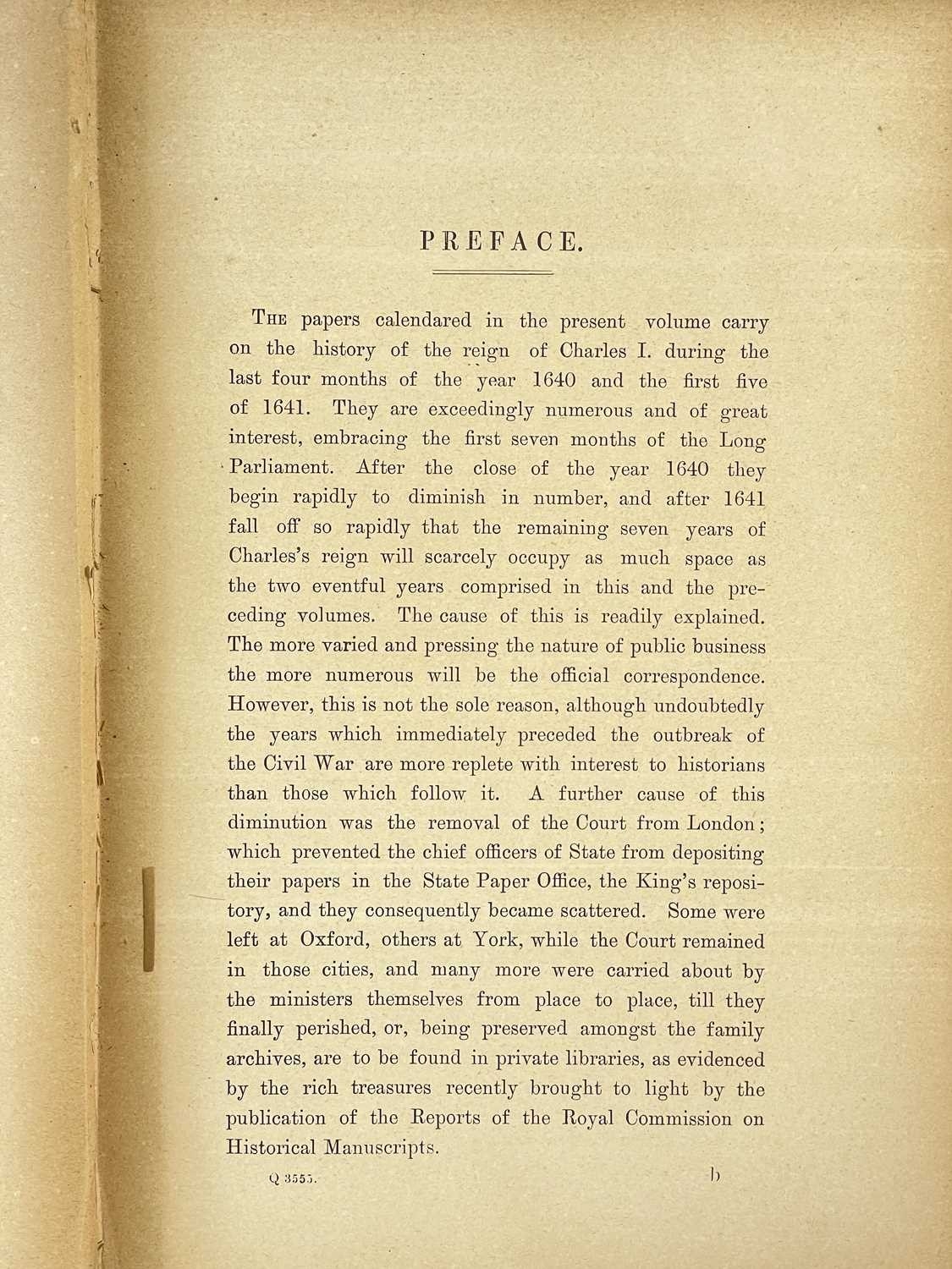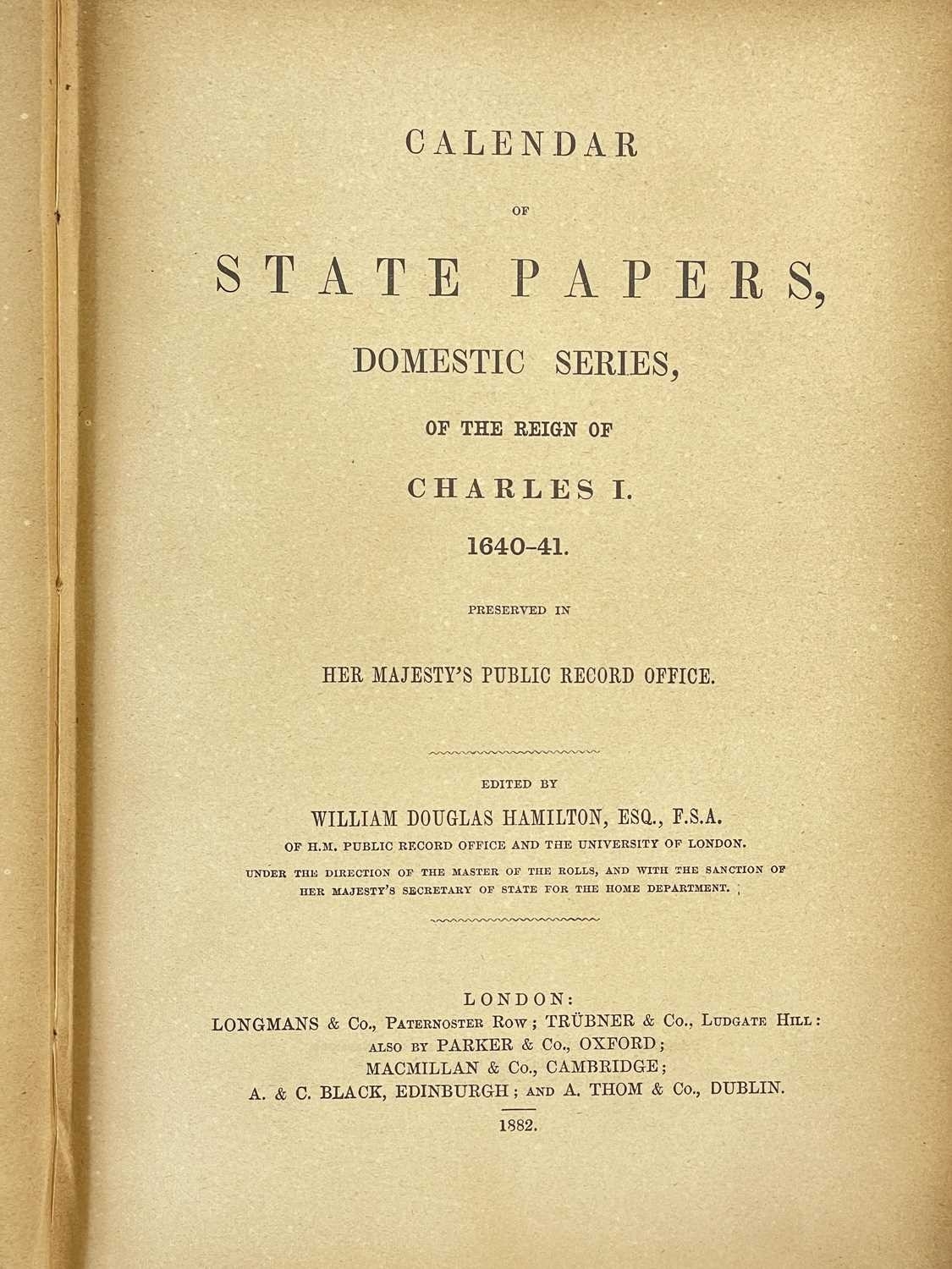 Calendar of State Papers Domestic Fourteen volumes, all in original publisher's embossed cloth, slightly grubby, some perished gutta-percha, internally good, Longman Brown, Green, Longman's & Roberts, London 1856-1857; plus one other work. (15) Years of volumes: 1547-80, 1603-10,1611-18, 1619-23,1623-25, 1623-26, 1627-28, 1628-29, 1629-31, 1637, 1639-40, 1640, 1640-41, 1641-43.