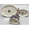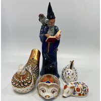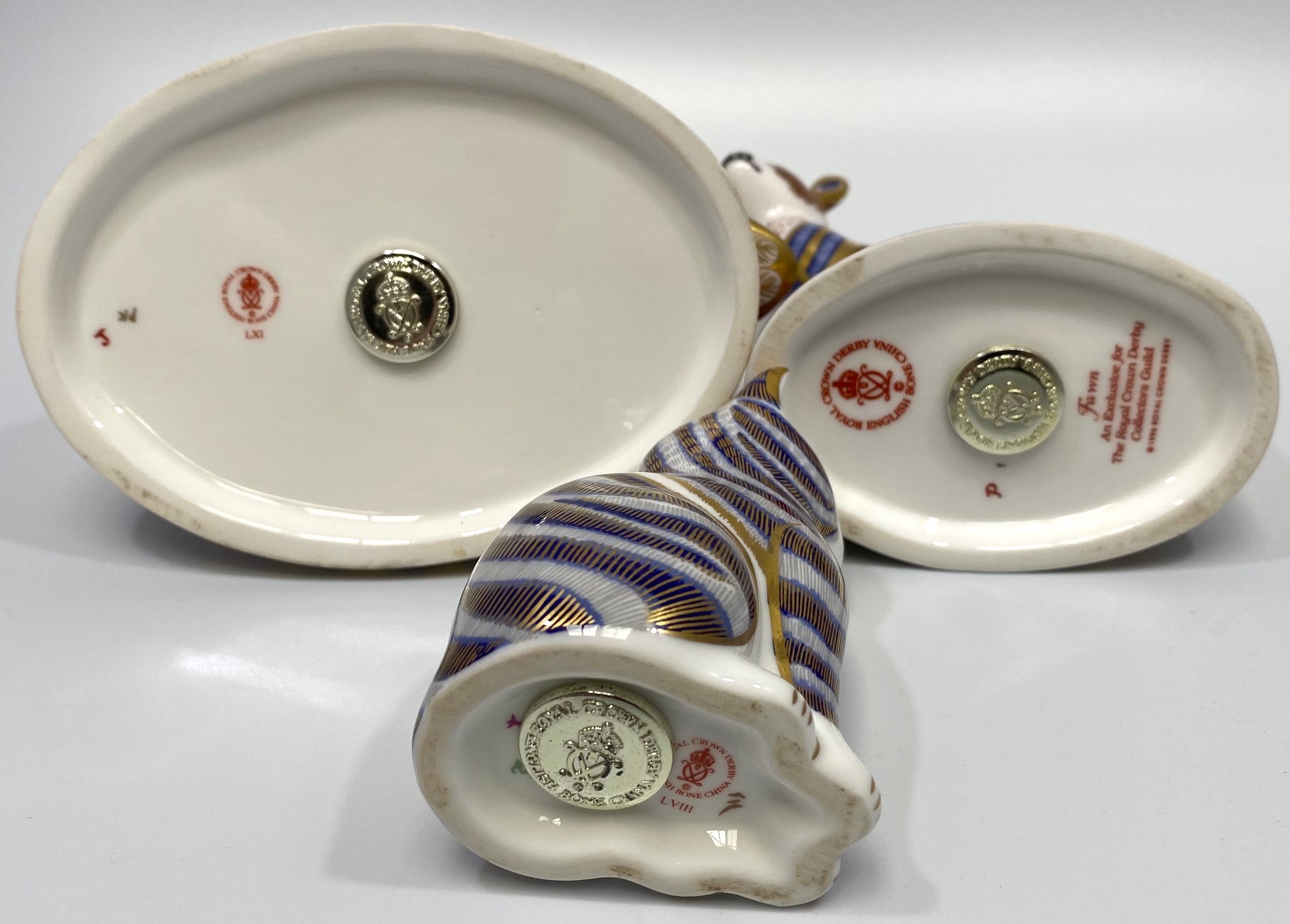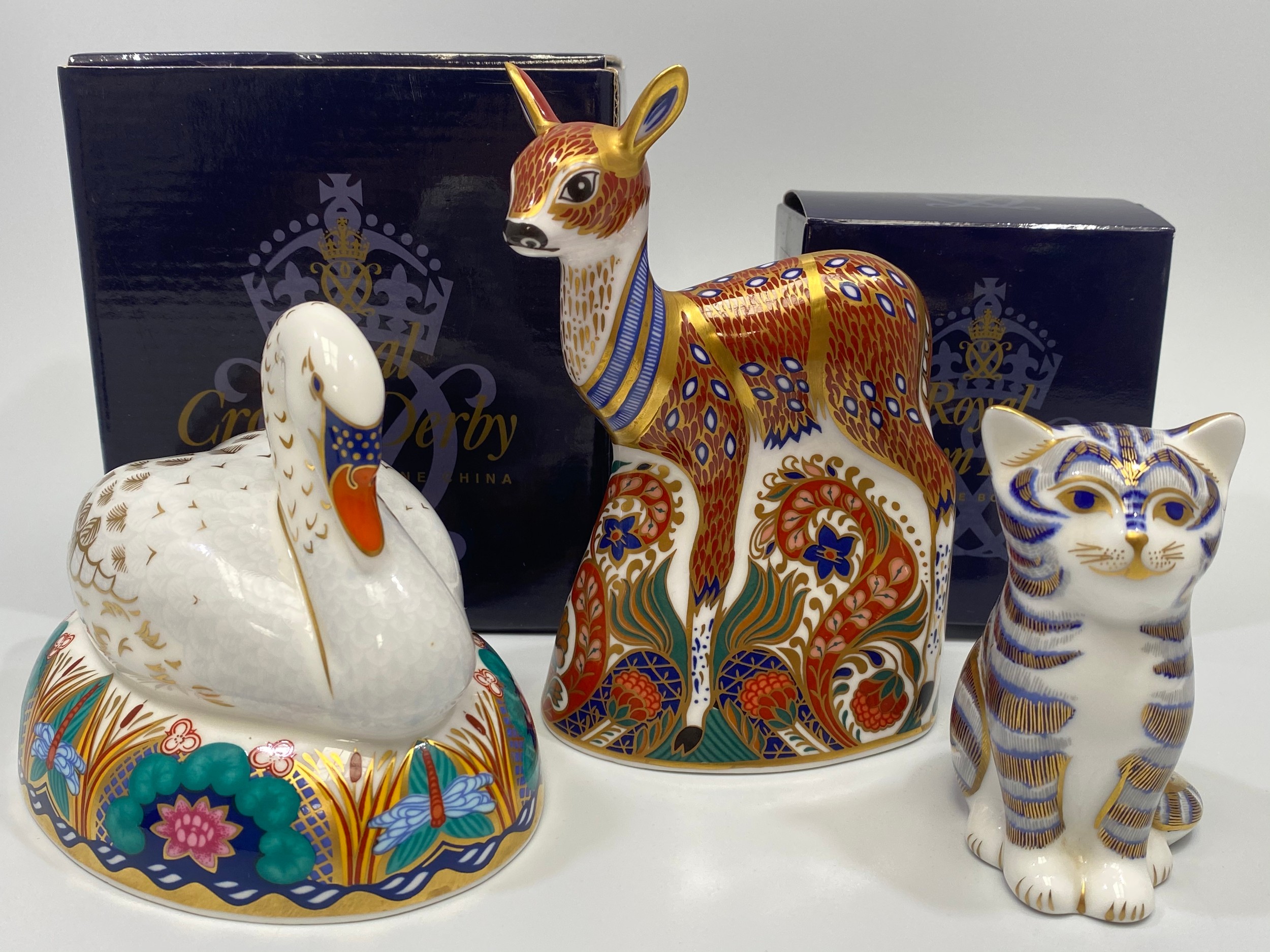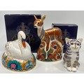 Three various Royal Crown Derby porcelain paperweights including a blue and gold Cat, 8cm high (boxed), a Fawn (no box) and a Swan (af) boxed, all with iron red printed marks to base and gold stoppers (3)