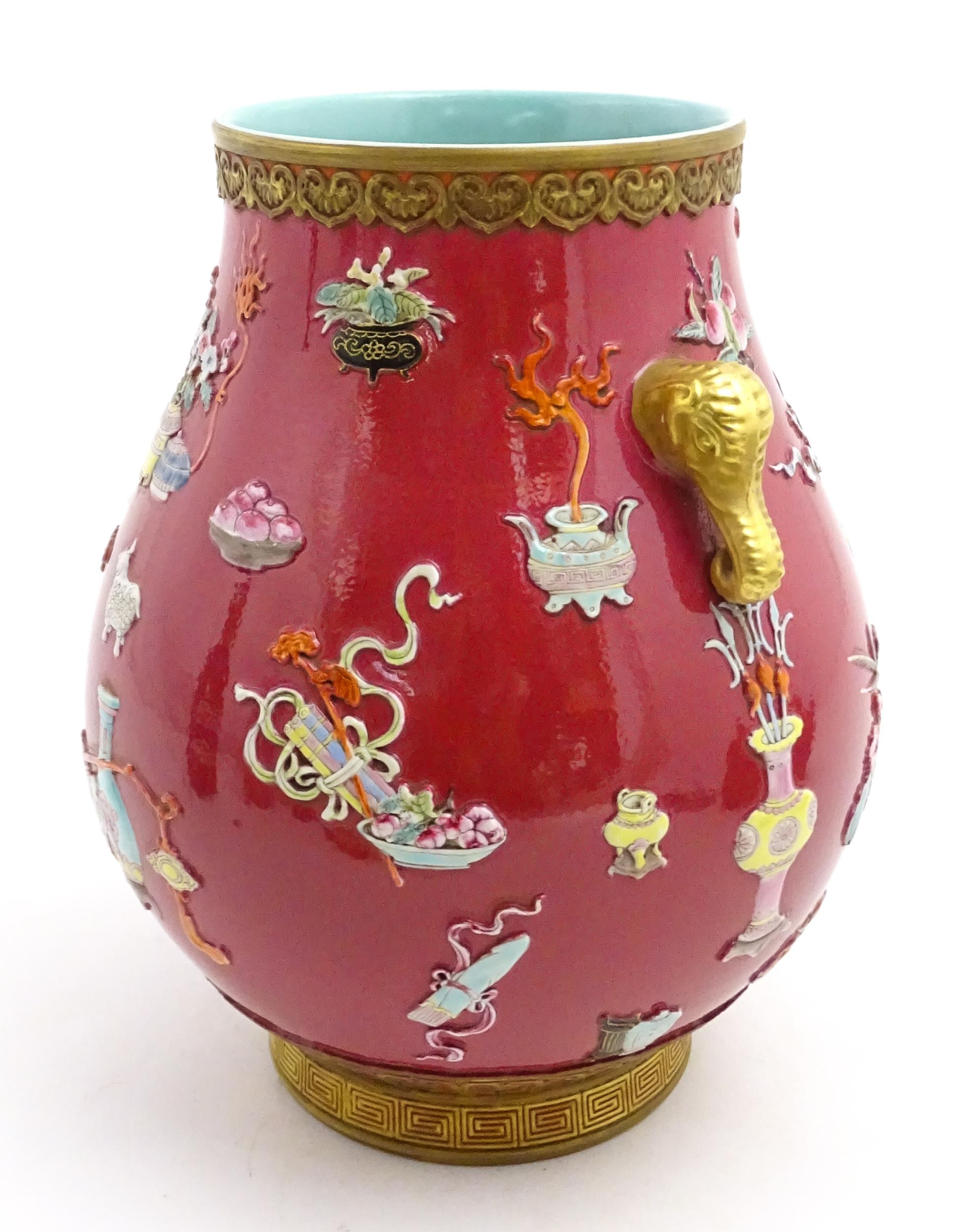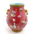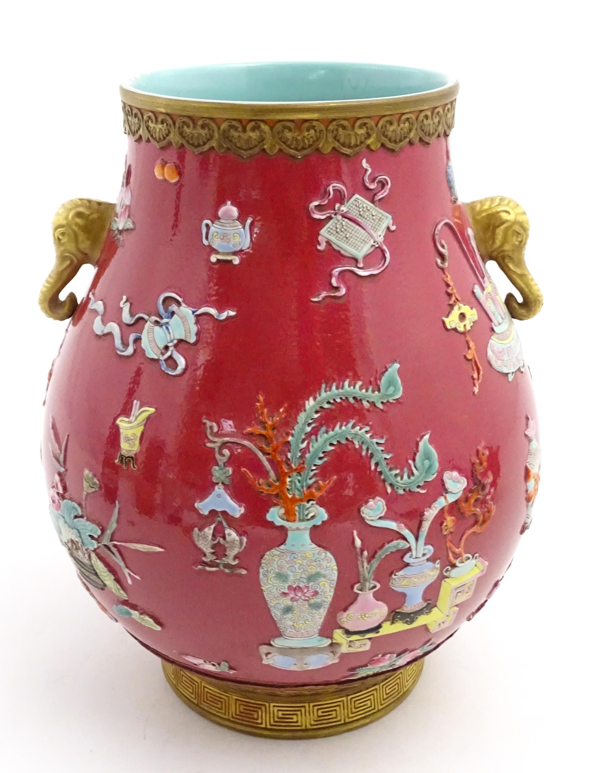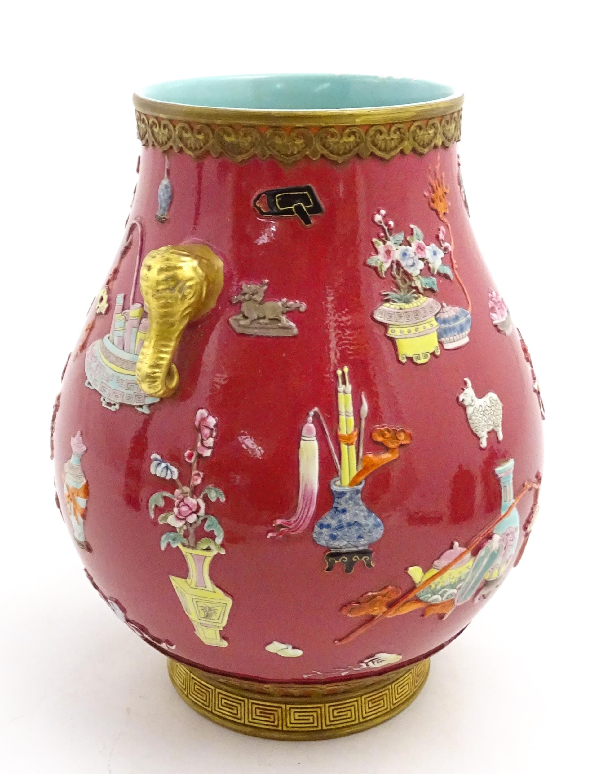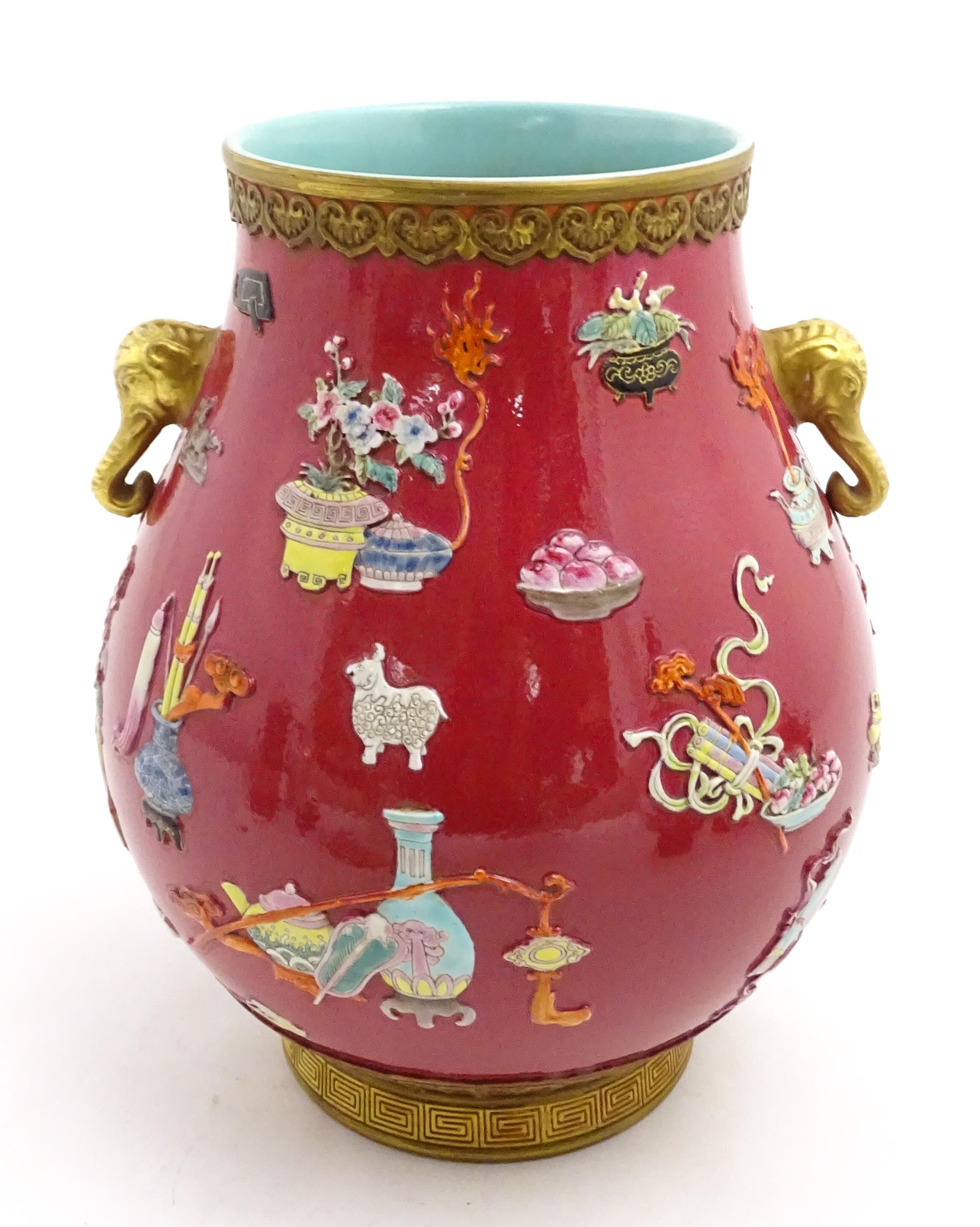 A Chinese famille rose vase with twin elephant mask handles decorated in relief with vases, flowers and auspicious symbols. Character marks under. Approx. 10" high