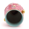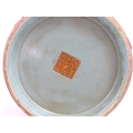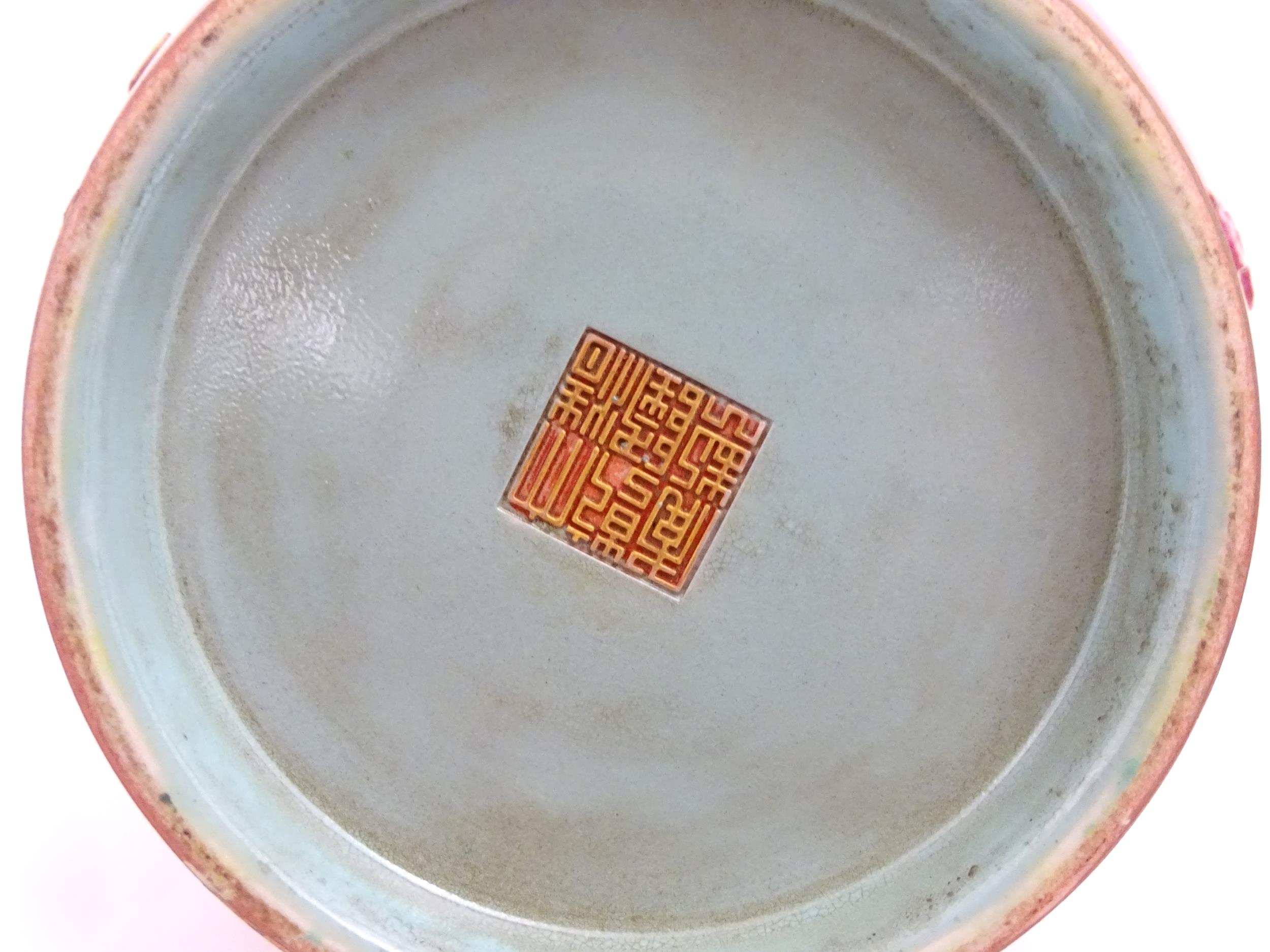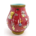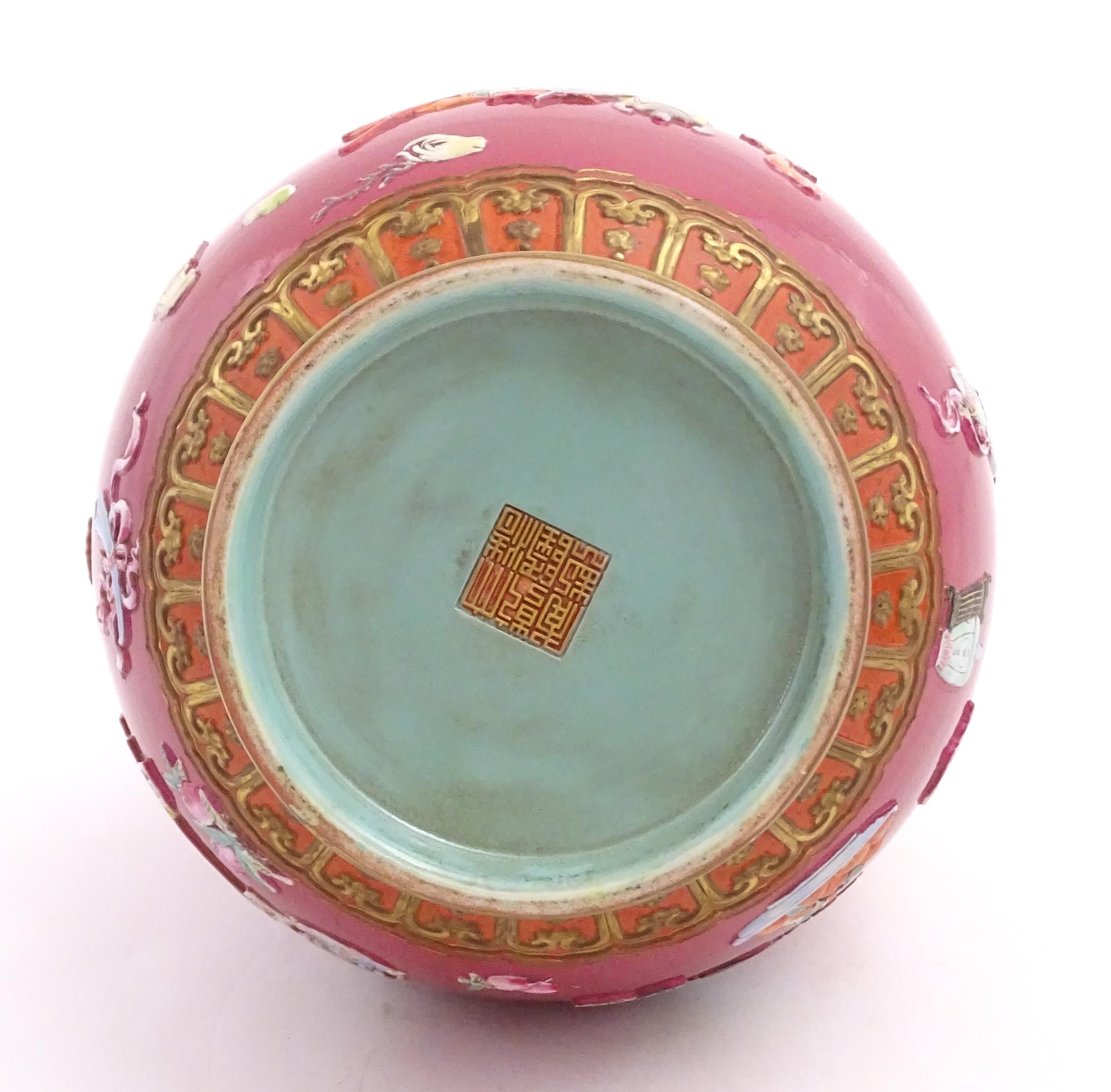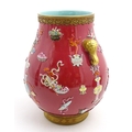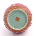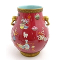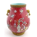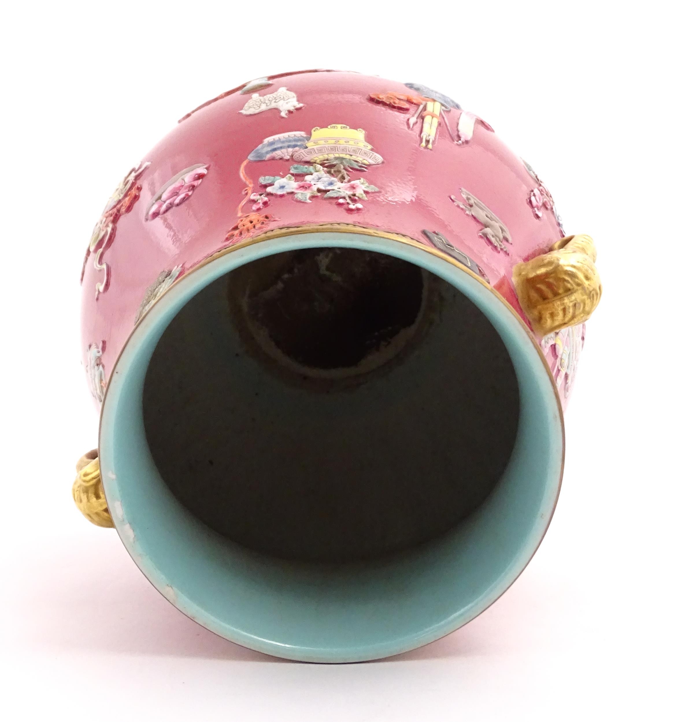 A Chinese famille rose vase with twin elephant mask handles decorated in relief with vases, flowers and auspicious symbols. Character marks under. Approx. 10" high