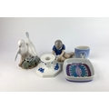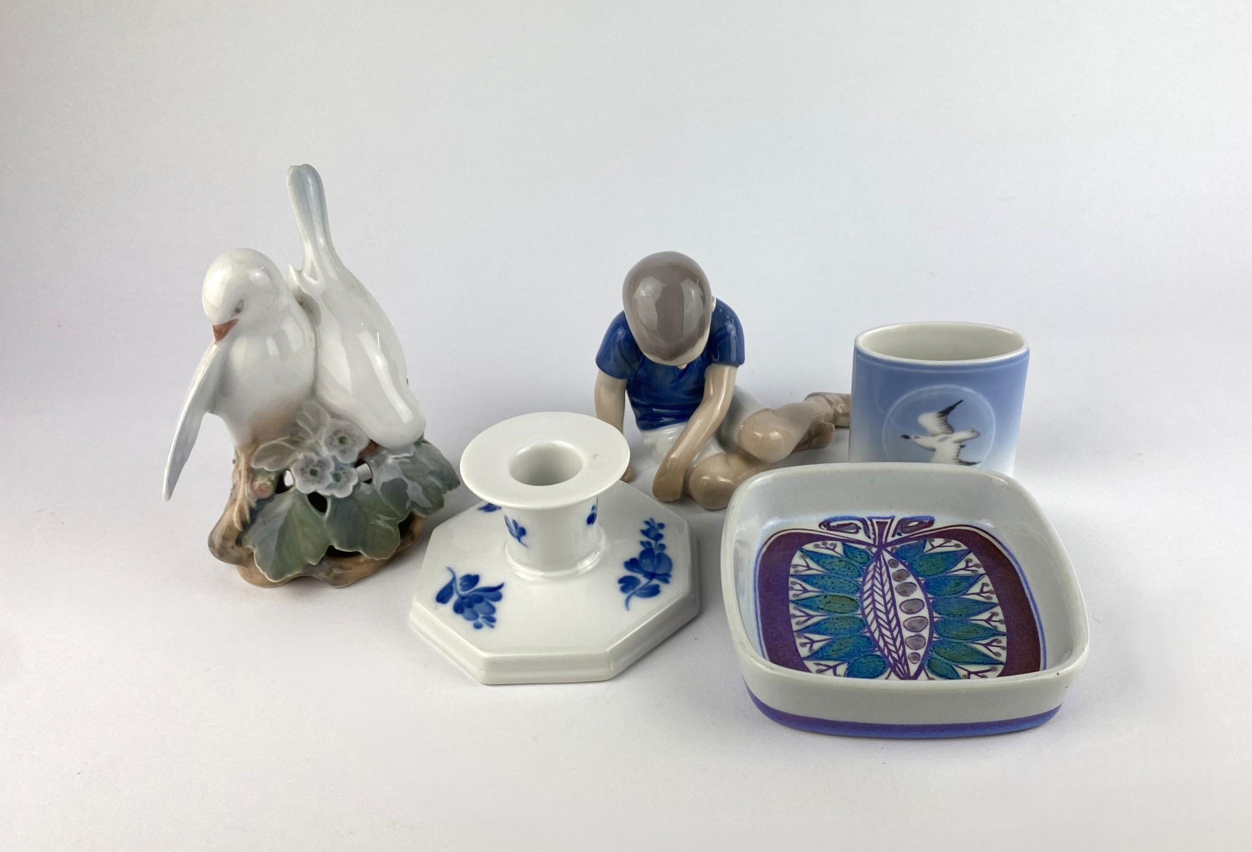 A Royal Copenhagen Tenera faience small dish 11cm, a Royal Copenhagen model of two birds 13.5cm, and a small candlestick, together with a Bing & Grondhal model of a boy and a small vase decorated with a seagull (5)
