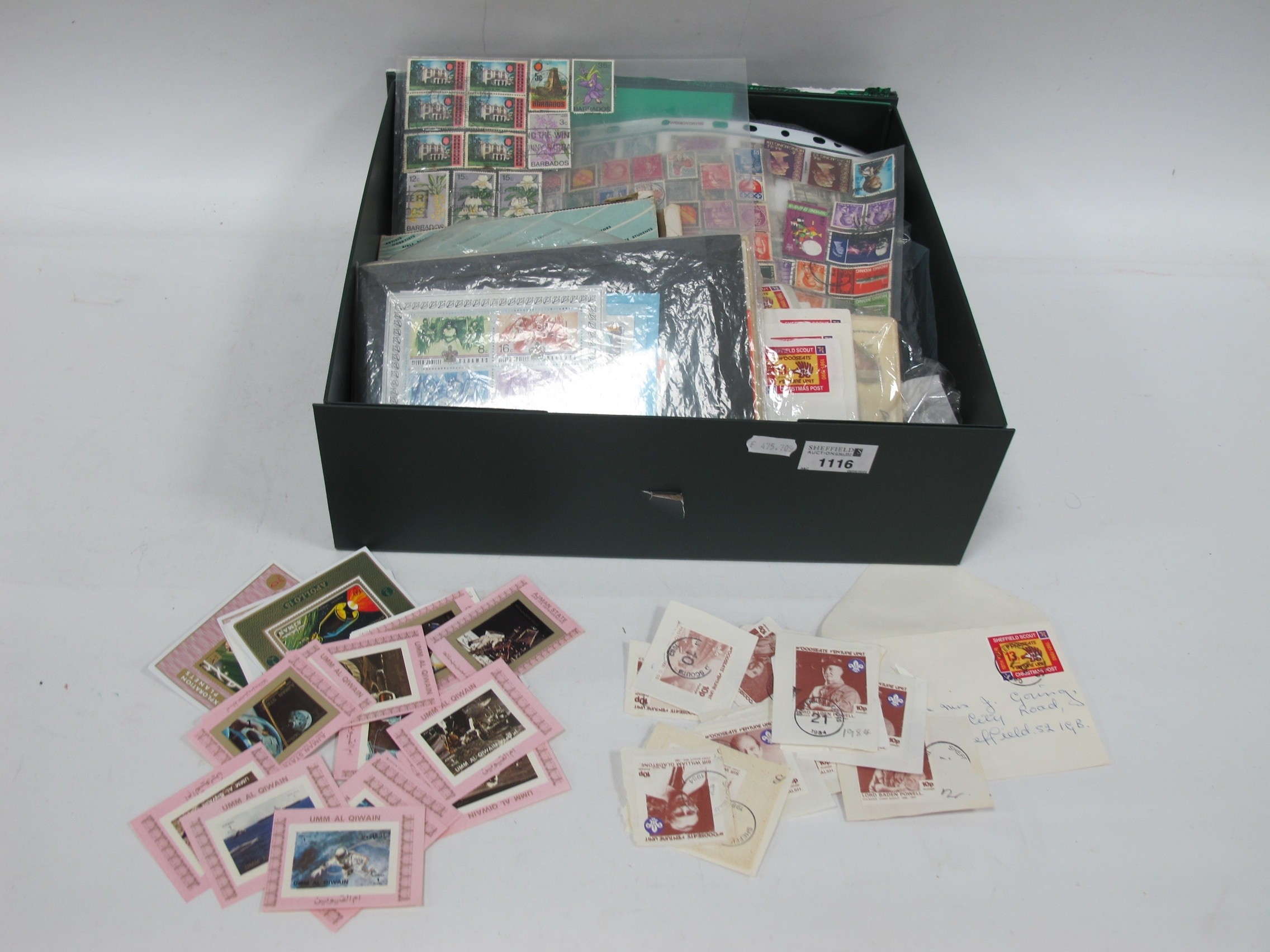 Stamps - large quantity, Isle of Man, G.B, World, Sheffield Scout post, etc, reading glass.