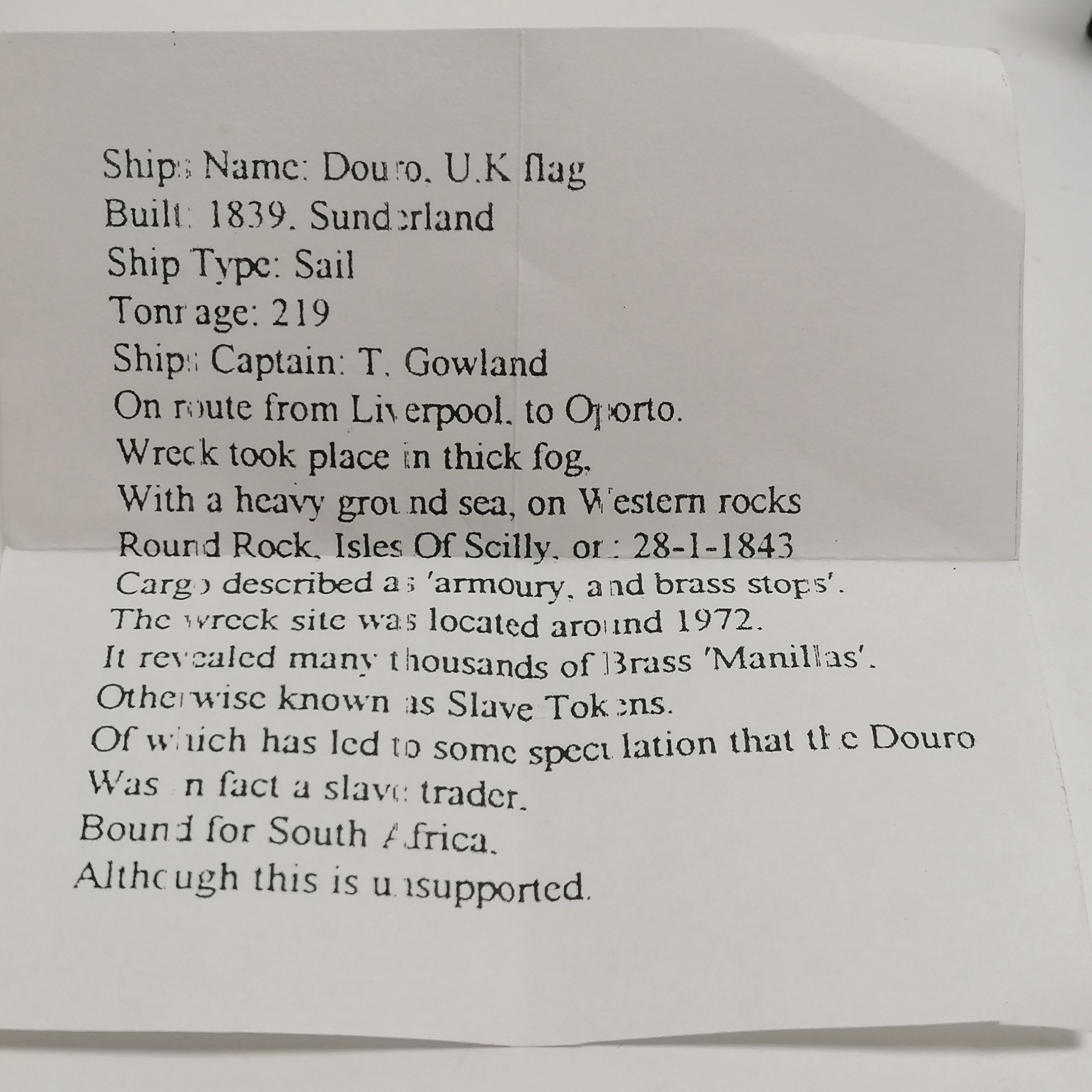 2 x antique trade bangles recovered from shipwreck (with annotated details from 1843 Douro)