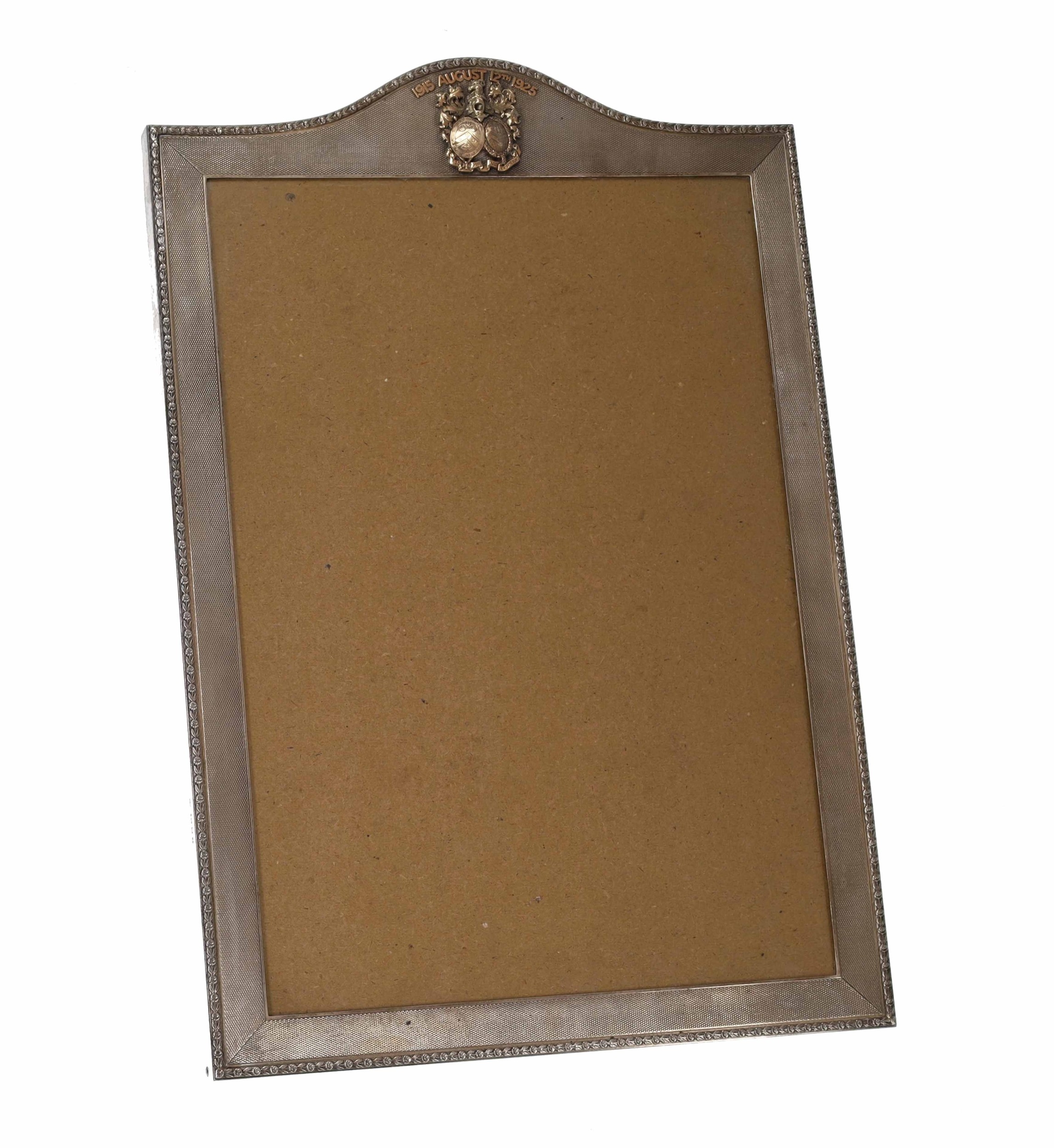 George V silver photograph frame, the engine turned frame with an arched top having an applied gilt commemorative crest, maker CD, London 1924, aperture 9" x 13", 11" wide 16" high overall
