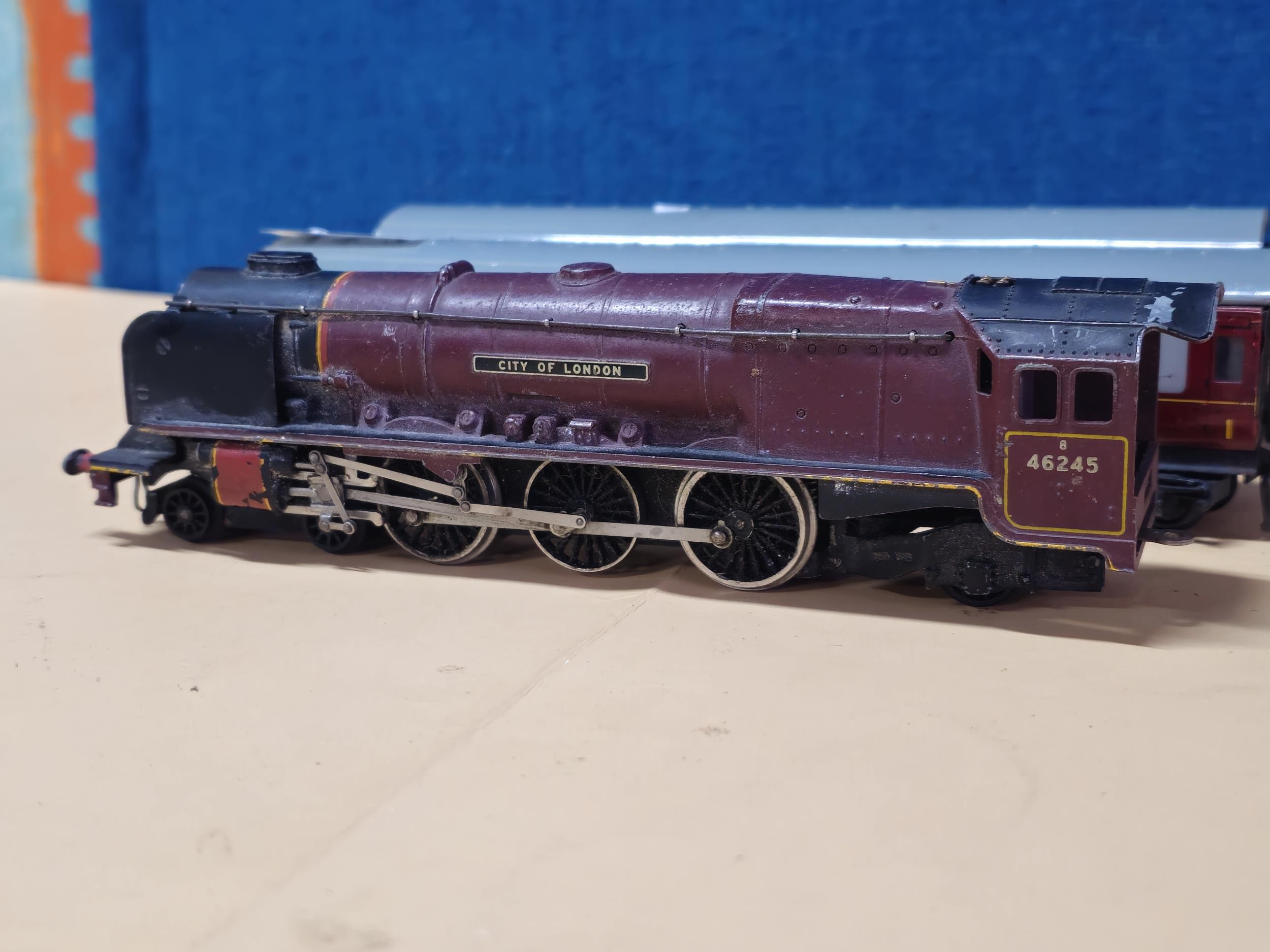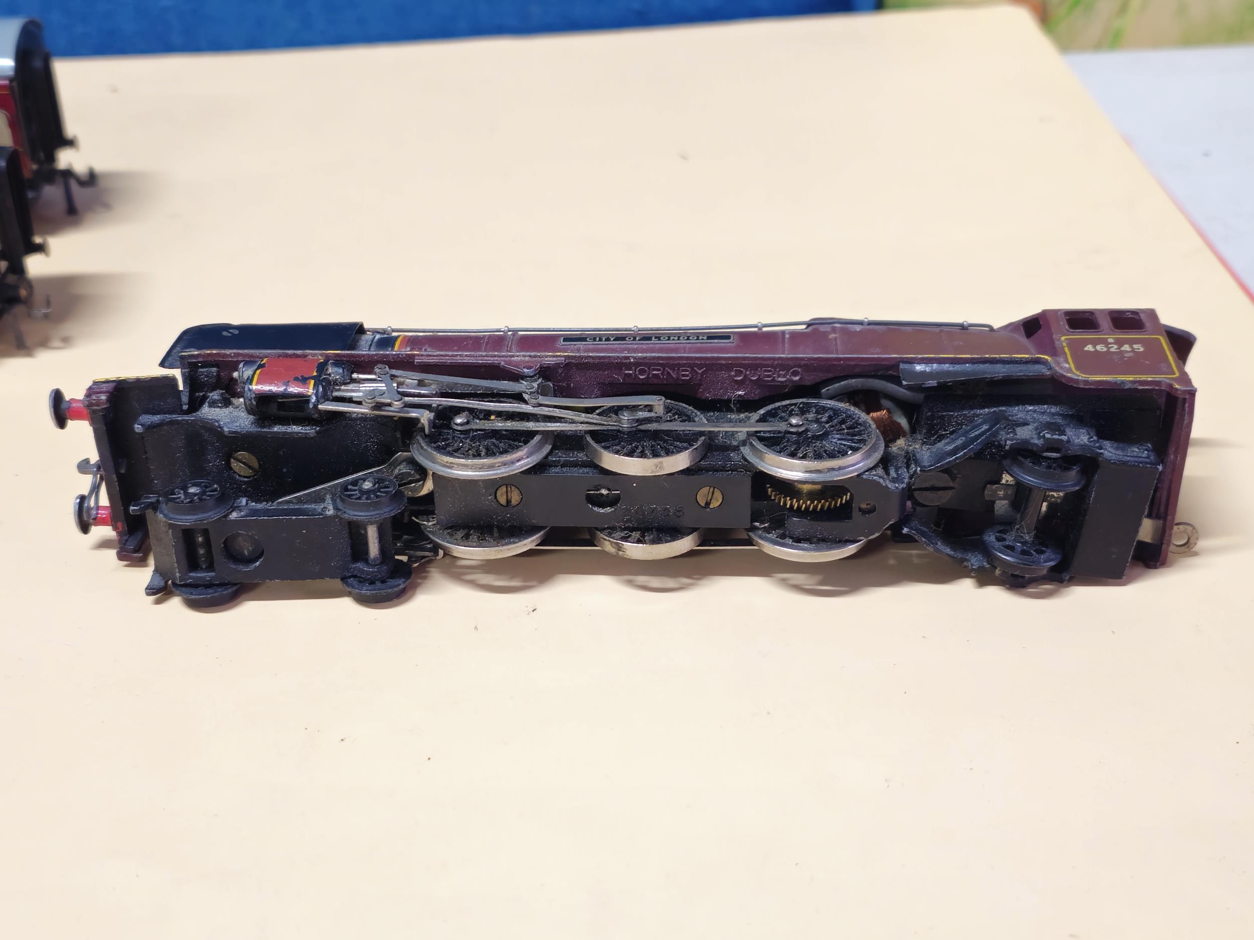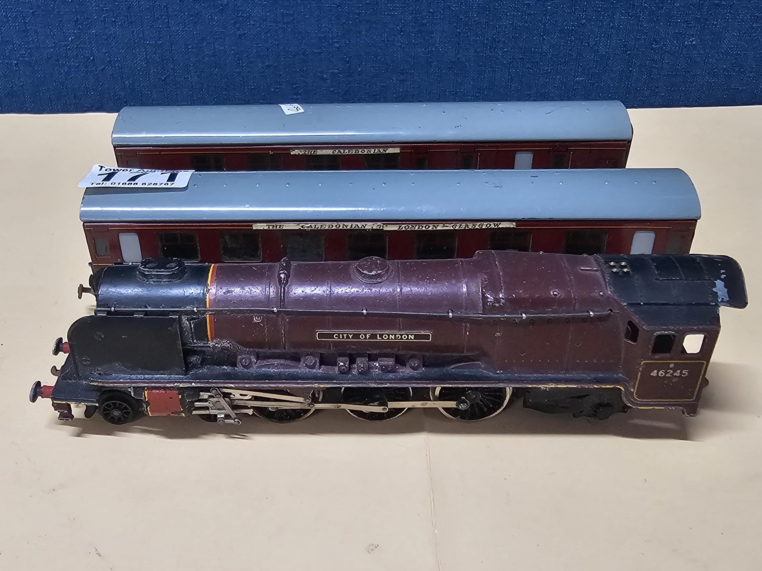 A OO gauge City of London locomotive with the running number 46245, in need of attention along with 2x The Caledonian metal carriages by Dubelo. which appear to be in good overall condition