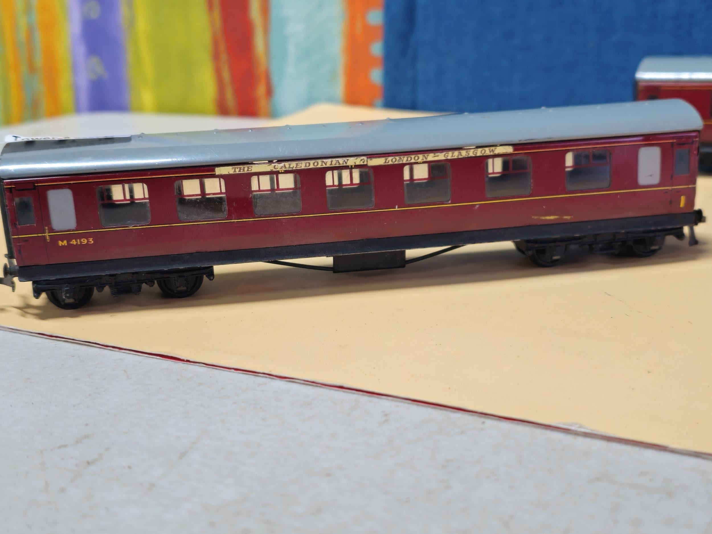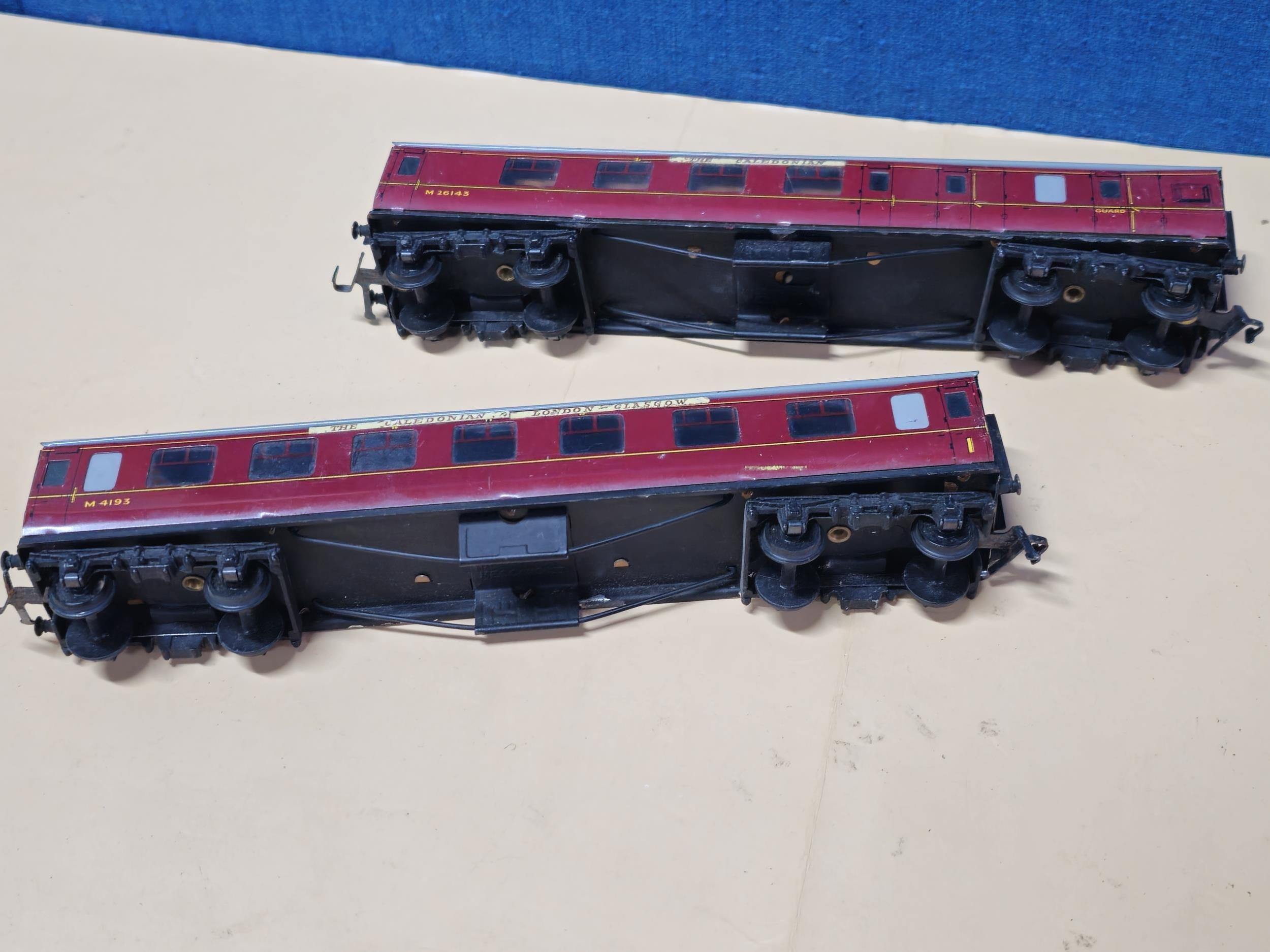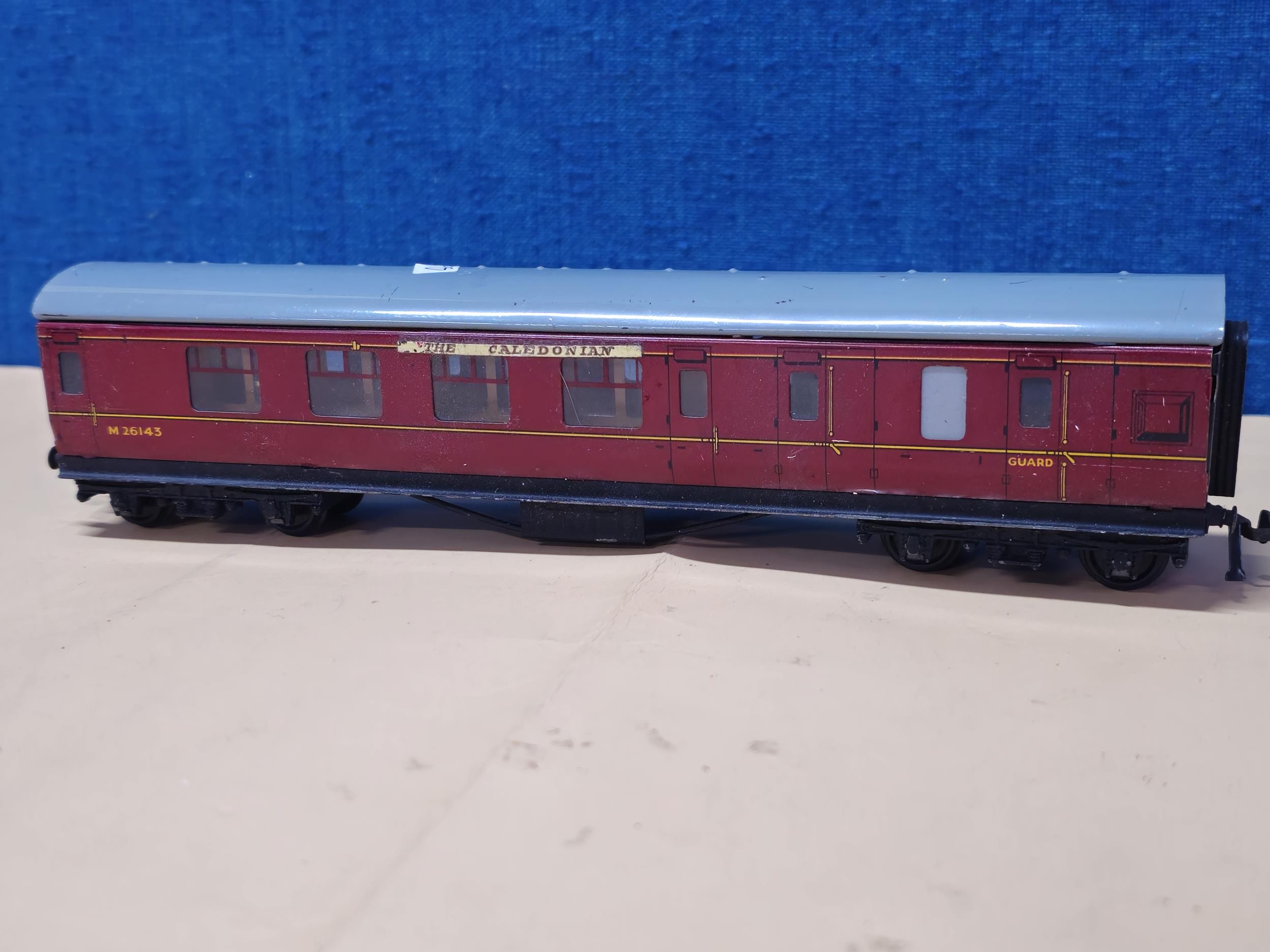 A OO gauge City of London locomotive with the running number 46245, in need of attention along with 2x The Caledonian metal carriages by Dubelo. which appear to be in good overall condition