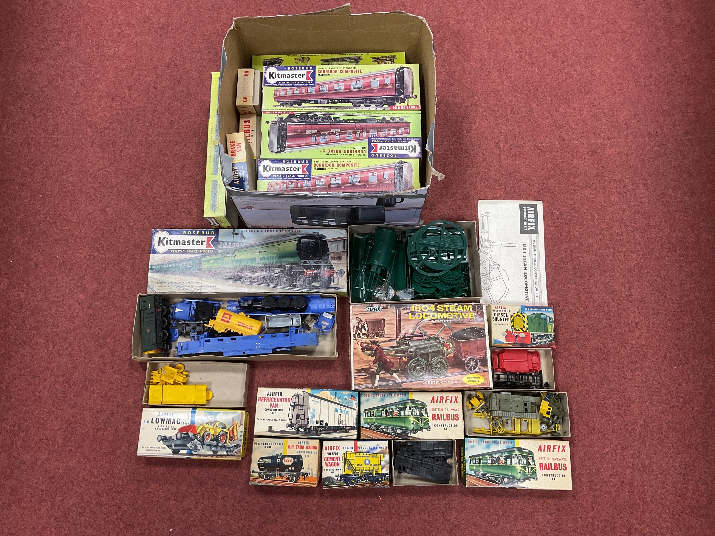 A quantity of Airfix and Kitmaster 00 gauge plastic kits, including a Bulleid Pacific, shunters, wagons and coaches, some kits part-constructed, some boxes containing mixes of parts from different kits, original boxes in fair condition.