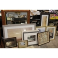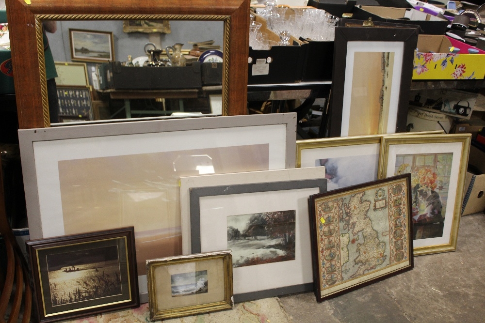 A QUANTITY OF ASSORTED PICTURES AND PRINTS TO INCLUDE MAPS, MIRRORS ETC