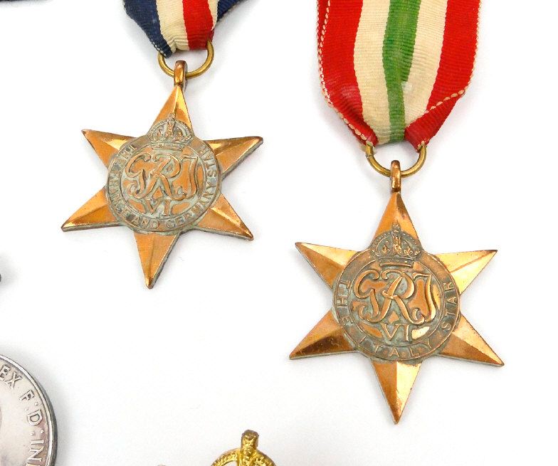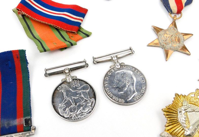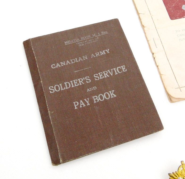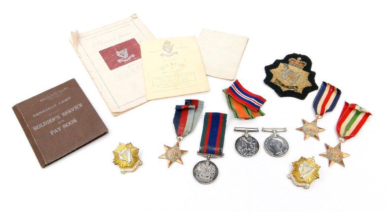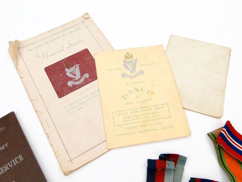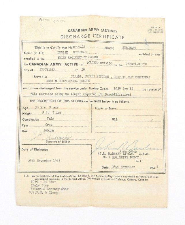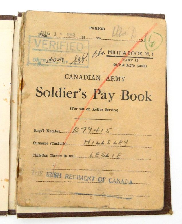 World War II British/Canadian military medal group comprising 1939-45 War medal, 1939-45 Star, Defence medal, France and Germany Star, Italy Star, Canada 1939 Volunteer Service medal, two cap badges and a selection of printed ephemera including a soldier's pay book, the paperwork for B.79415 SGT.L.HILLSLEY Irish Regiment of Canada