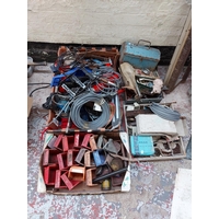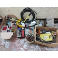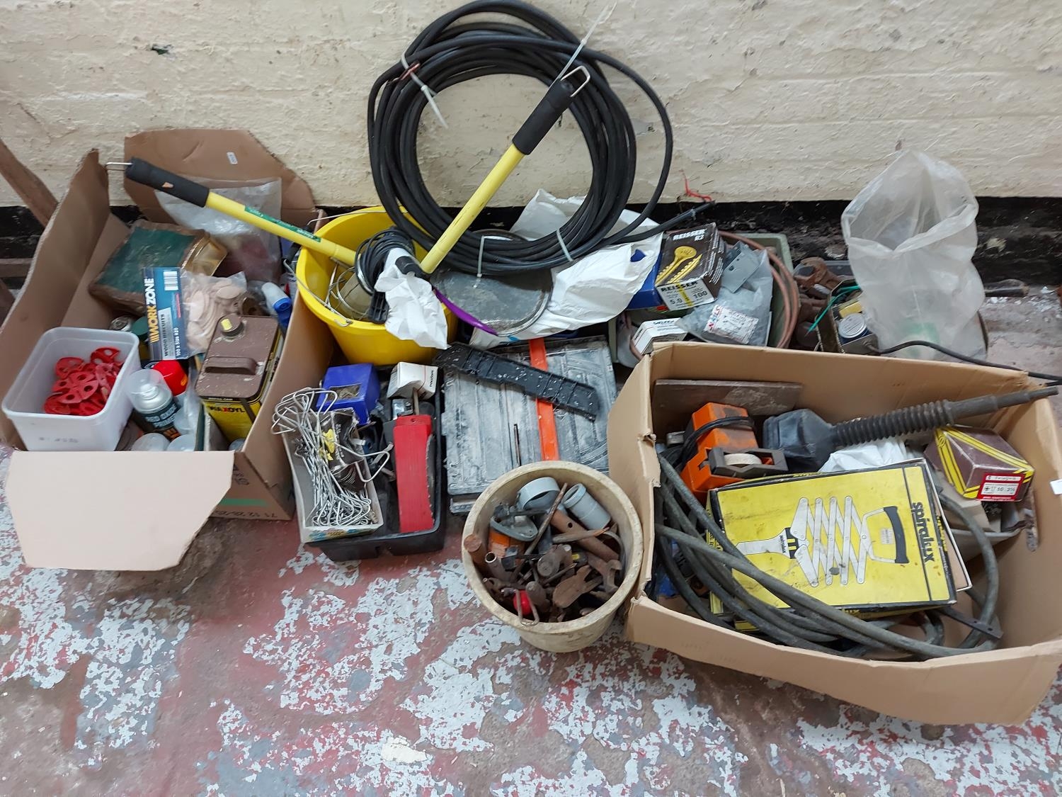A large mixed lot to include electric tile cutter, various paints, electric work light, pop rivet gun etc.