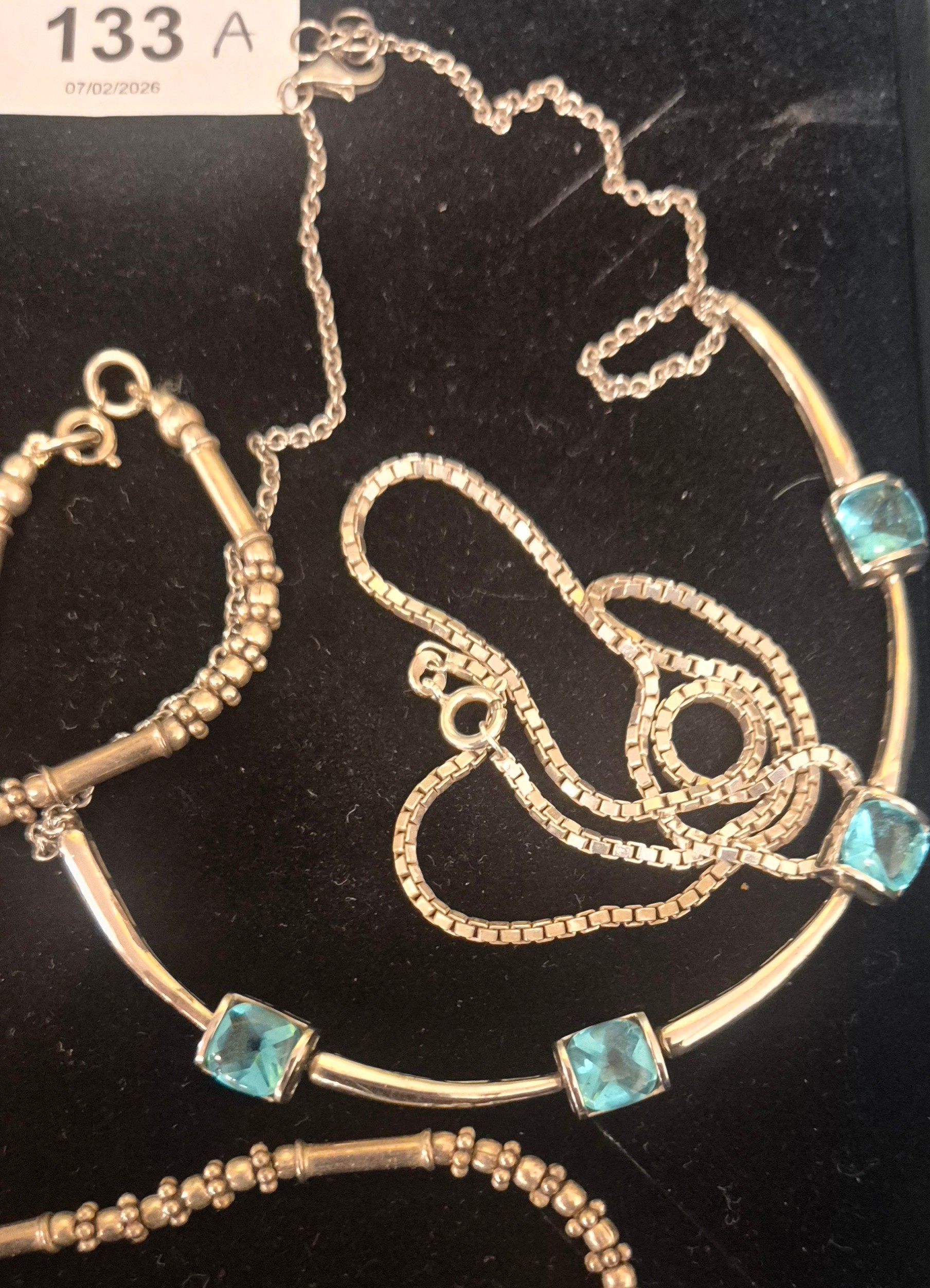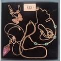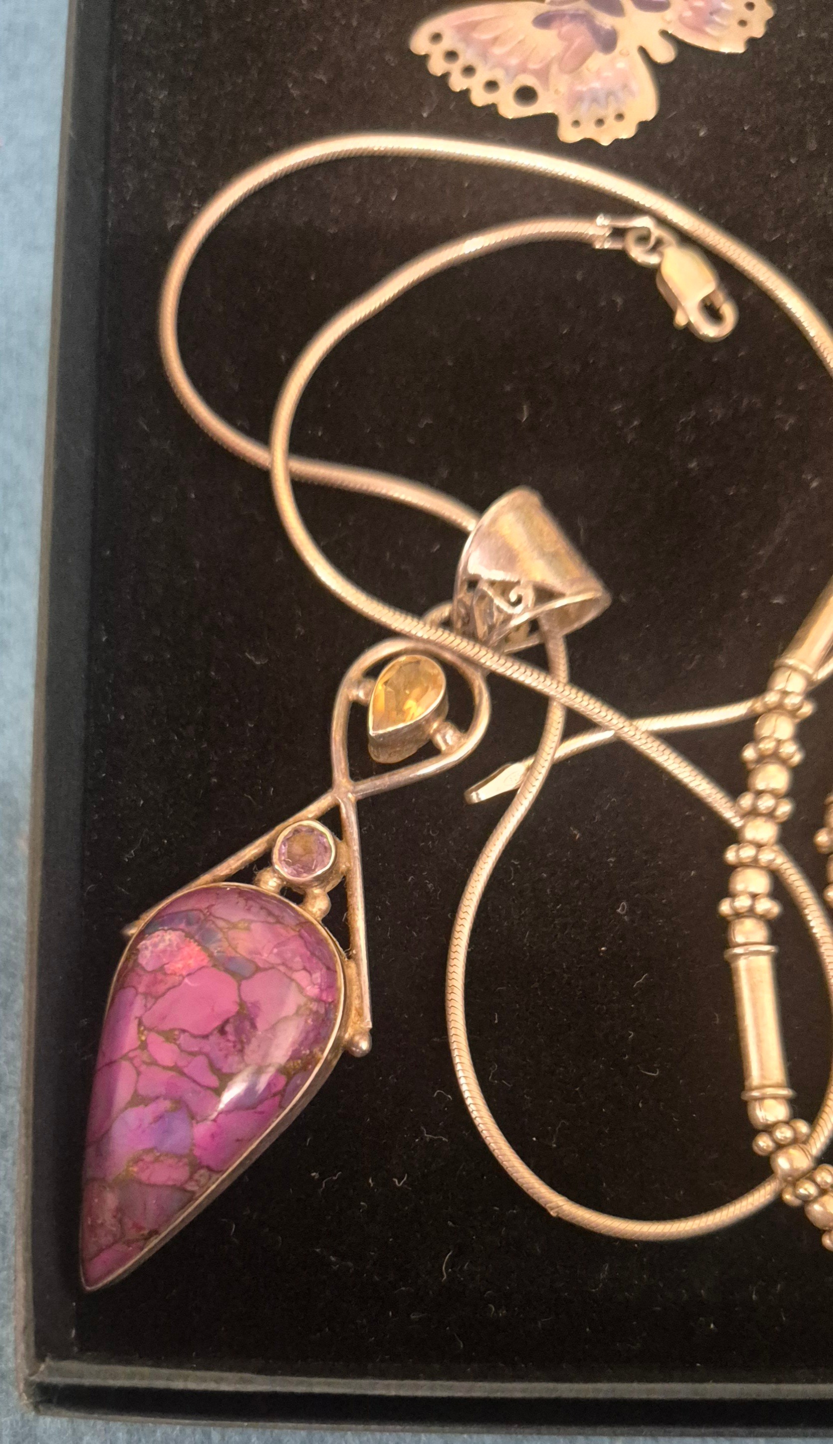 A Selection of Silver jewellery; Alistair Norman Grant silver and enamel butterfly brooch with silver chain, pendant and blue stone statement necklace and two others.