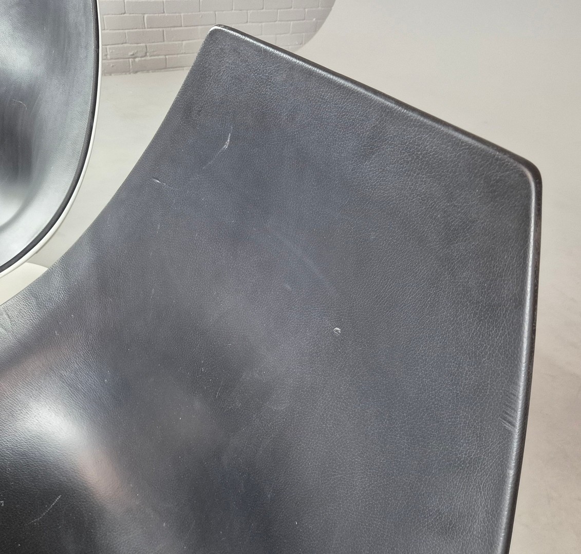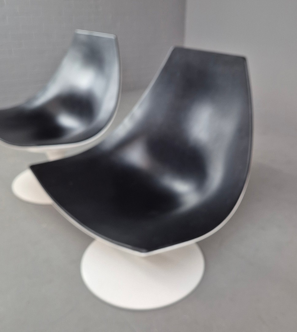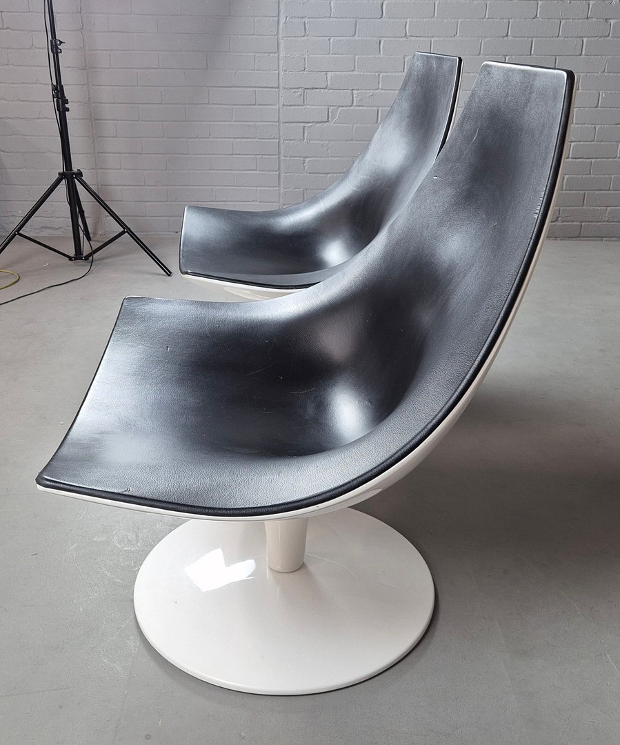 PAIR OF SWIVEL MOON CHAIRS BY PIETRO AROSIO FOR TACCHINI CIRCA 2000. With black leather upholstery 90cm H x 82cm W x 76cm D.