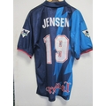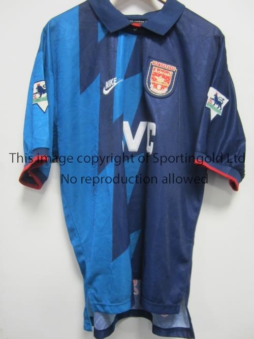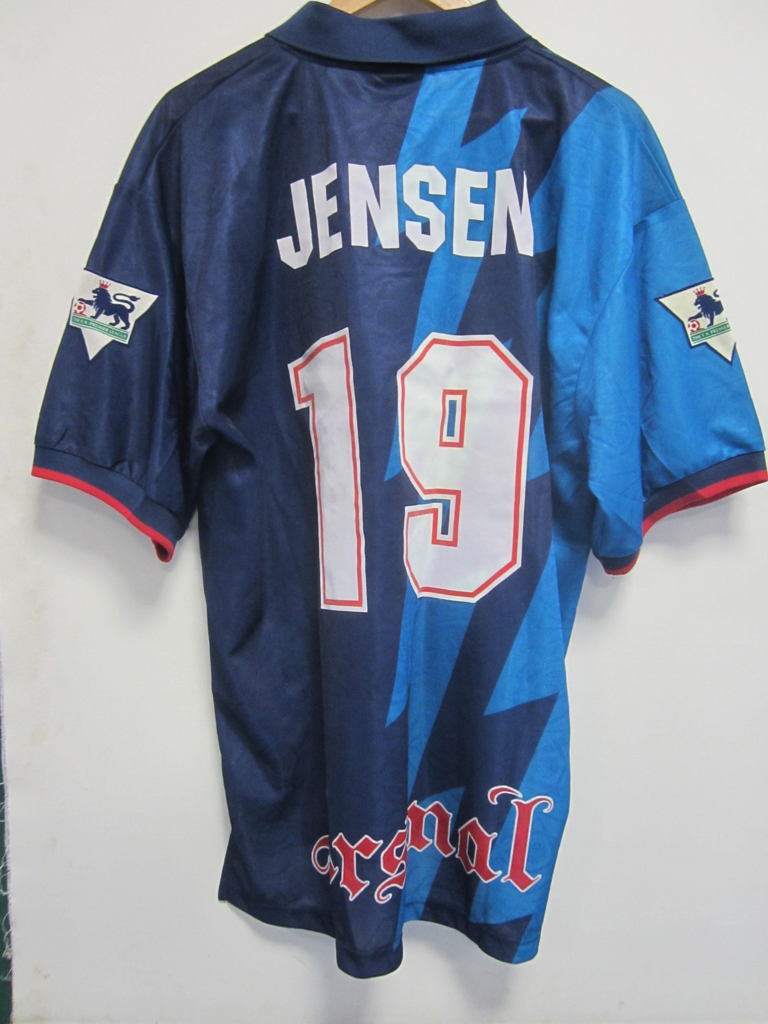 ARSENAL PLAYER ISSUE SHIRT / JOHN JENSEN Dark blue and light blue short sleeve shirt for season 1995/6 with Premier League arm flashes, 19 and the name on the back. Good
