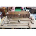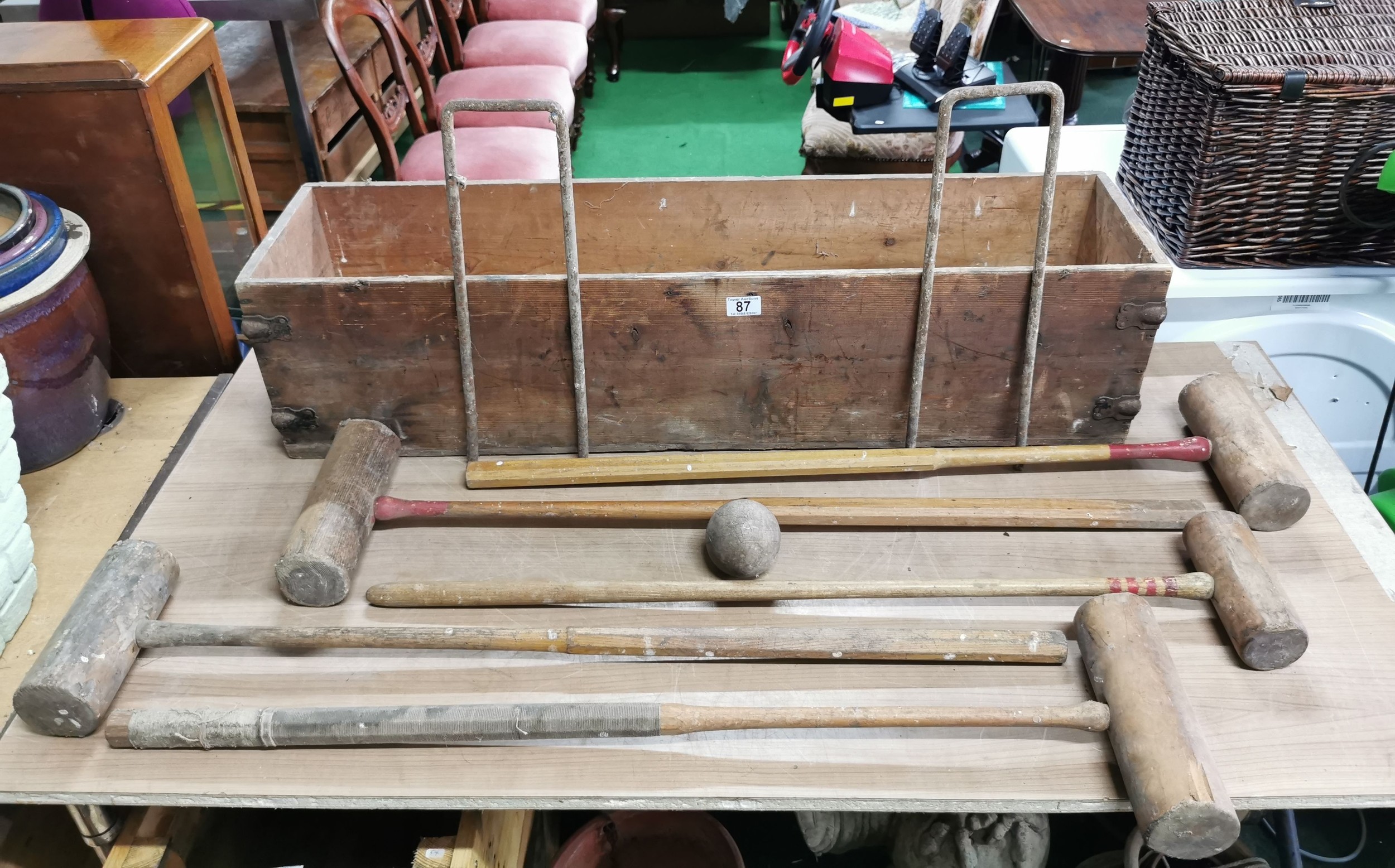 Antique boxed croquet set consisting of 7x mallets, 1x ball all contained in a vintage wooden box, largest mallet measures 98cm long box measures 25cm high 103cm long 23cm deep