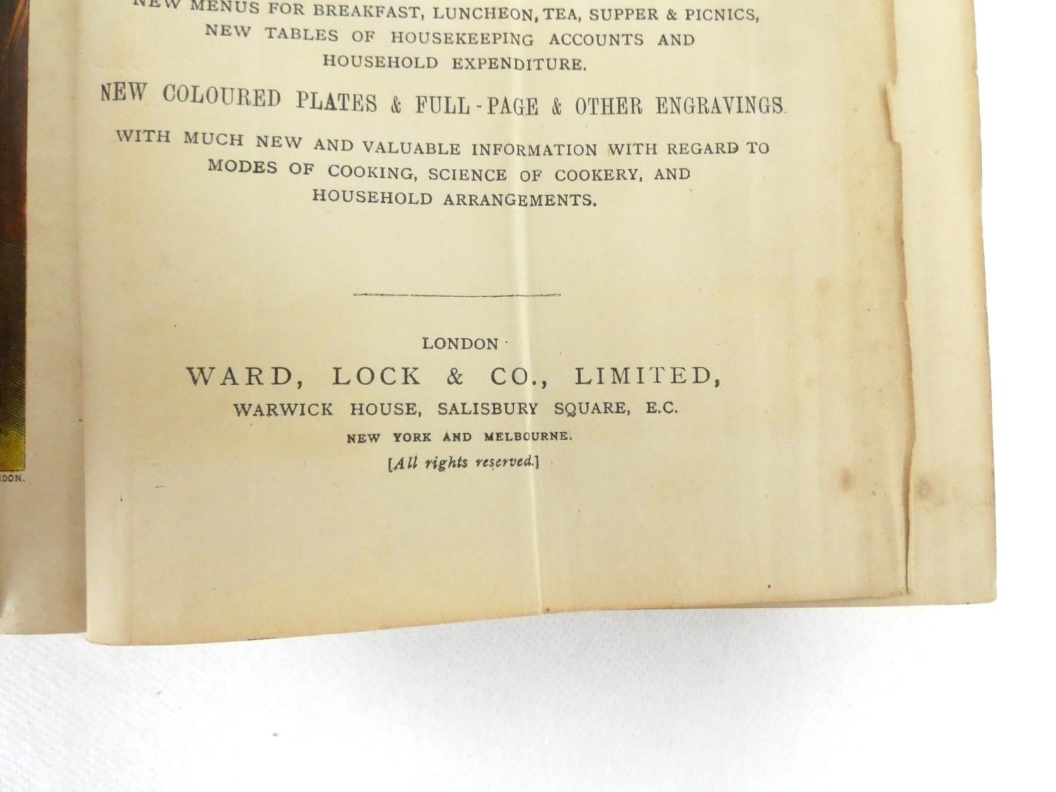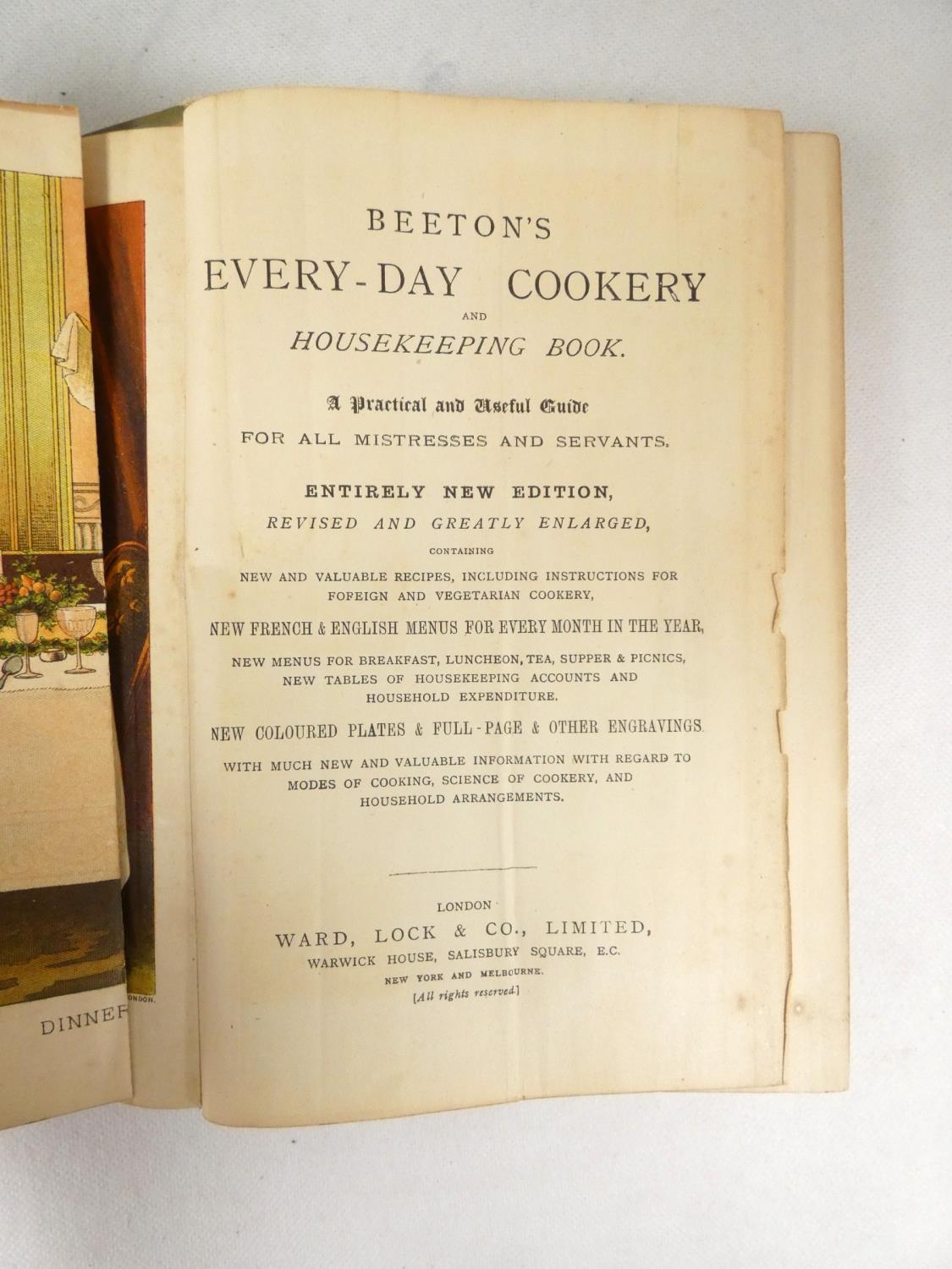 BEETON MRS. Beeton's Every-Day Cookery & Housekeeping Book. Fldg. col. frontis, col. & other plates & text illus. Half title & illus. Orig. pict. cloth, some rubbing & wear. Entirely New Edition, c.1920's.