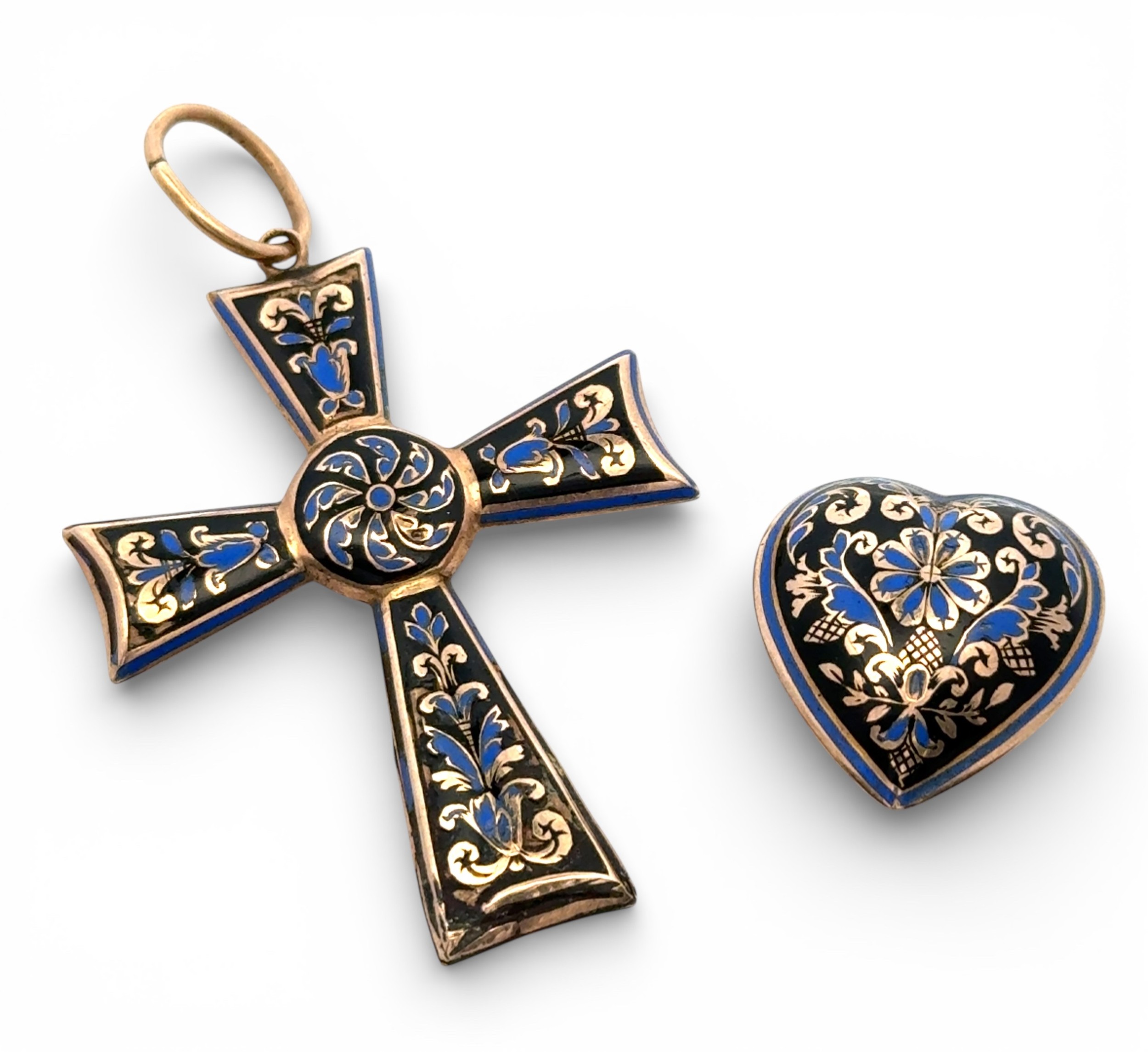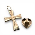 An enamelled yellow metal cross pendant and heart, tested as approx 17- 18ct gold. Some damage to base of cross pendant. 6.03g Cross pendant 44mm exc bale, heart 20mm length.