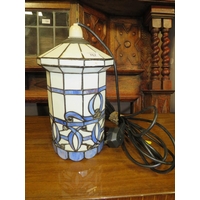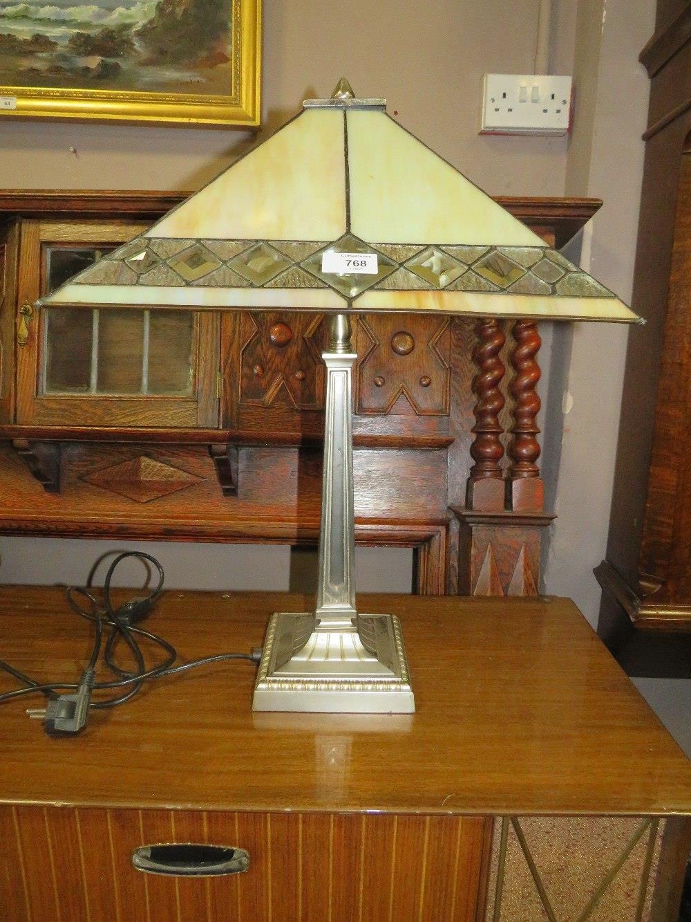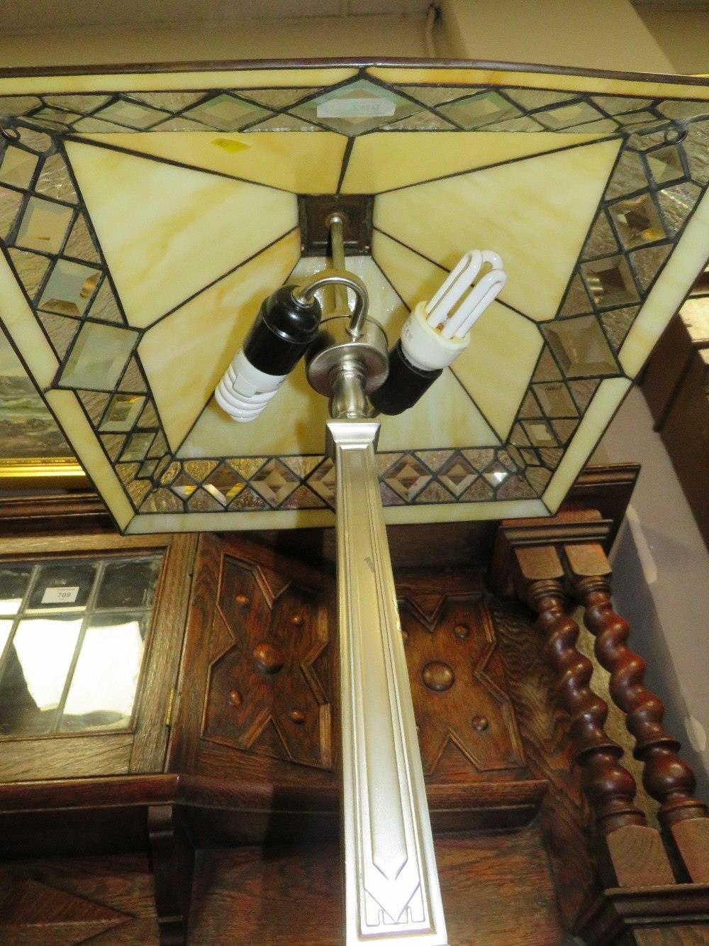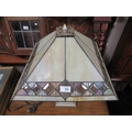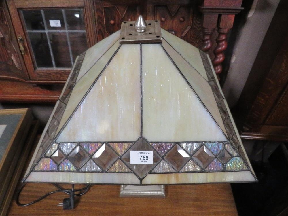 A LARGE TIFFANY STYLE DECO TABLE LAMP ON AN ANGULAR SUPPORT H-59 CM ( OVERALL )
