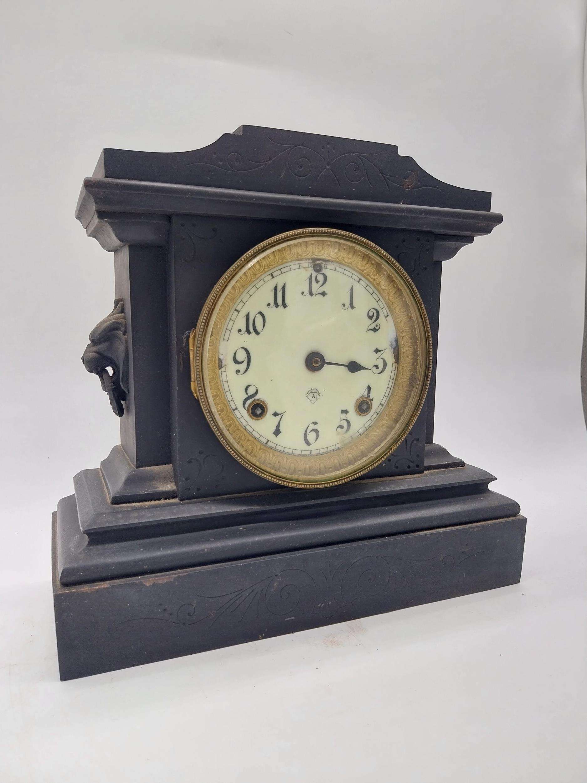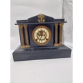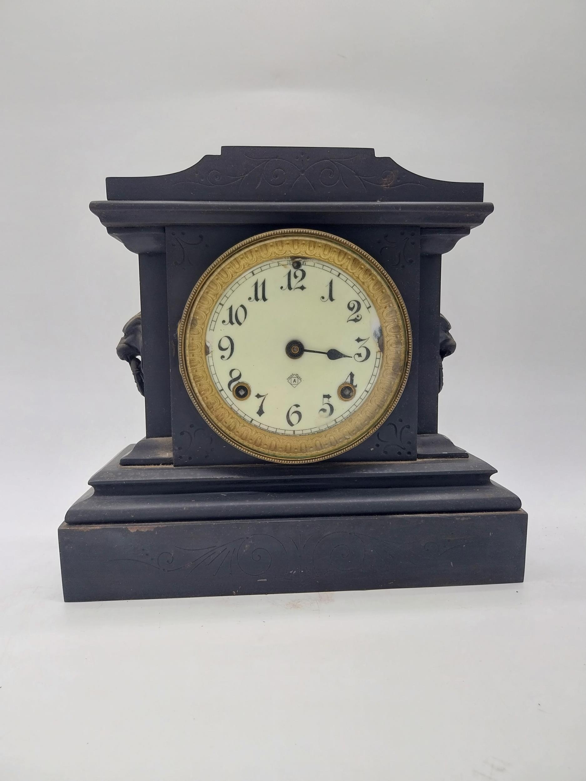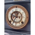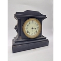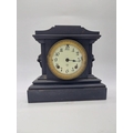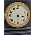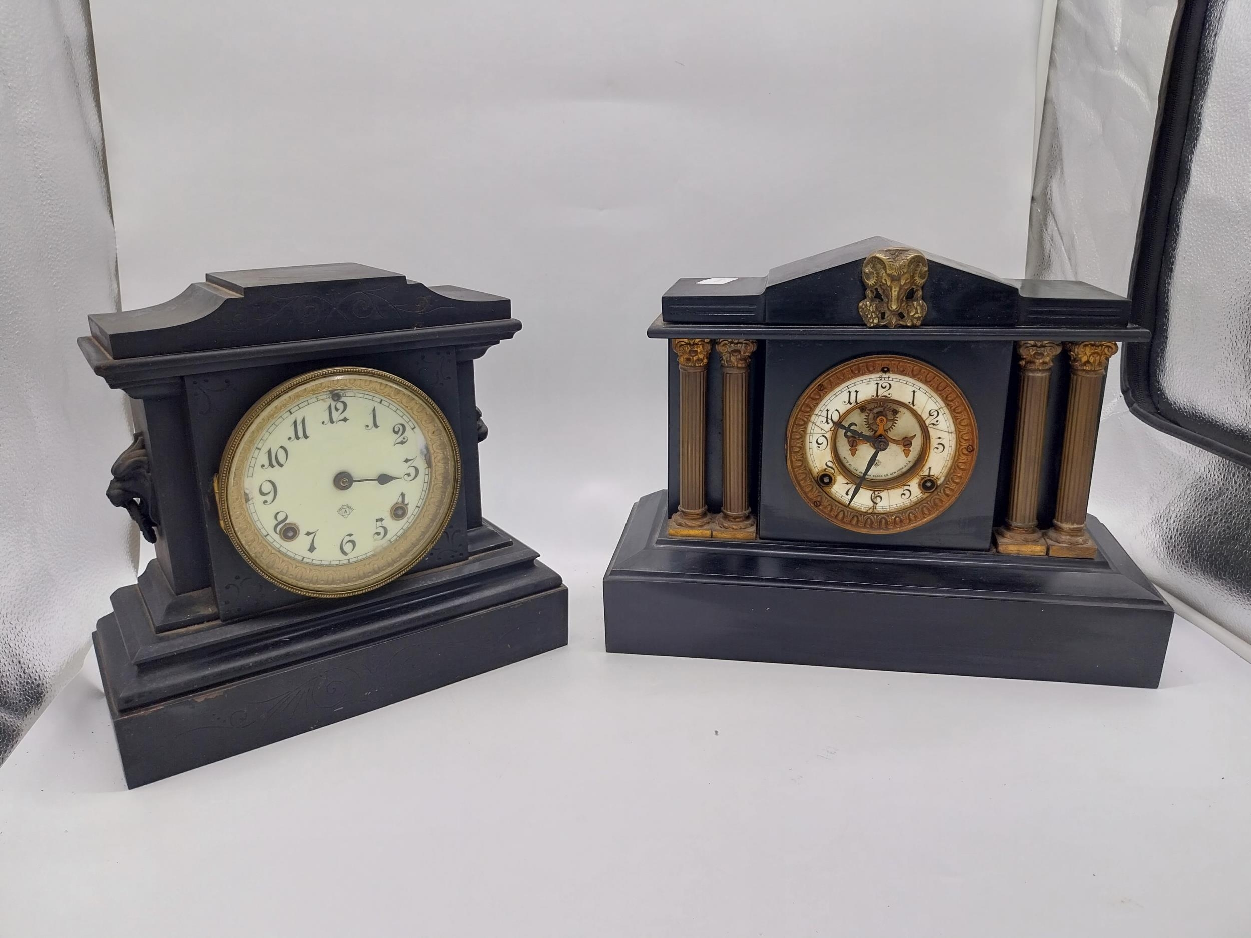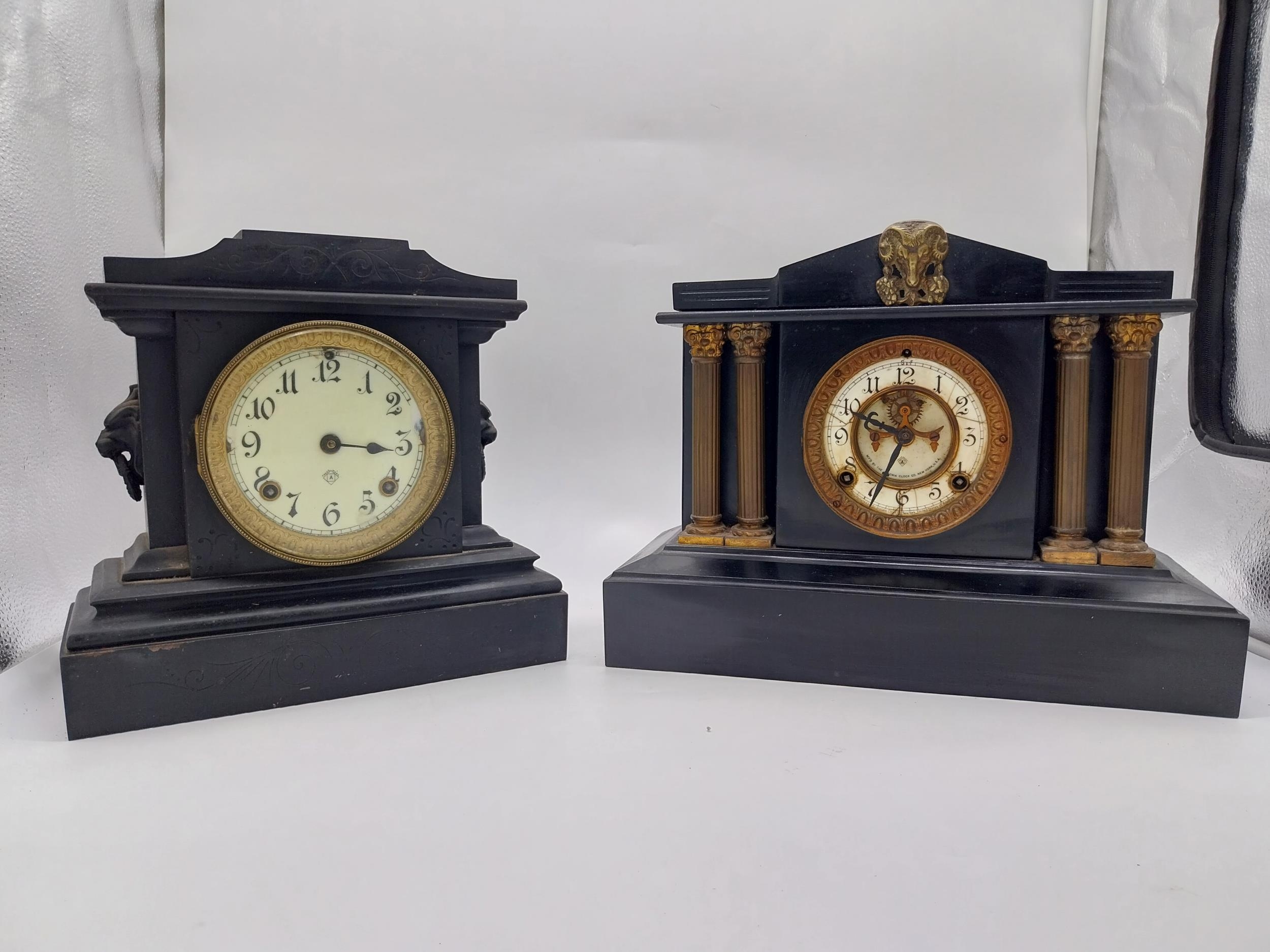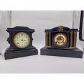 Two 19th C. slate mantle clocks with enamel dials {30 cm H x 38 cm W x 16 cm D and 28 cm H x 29 cm W x 12 cm D}.