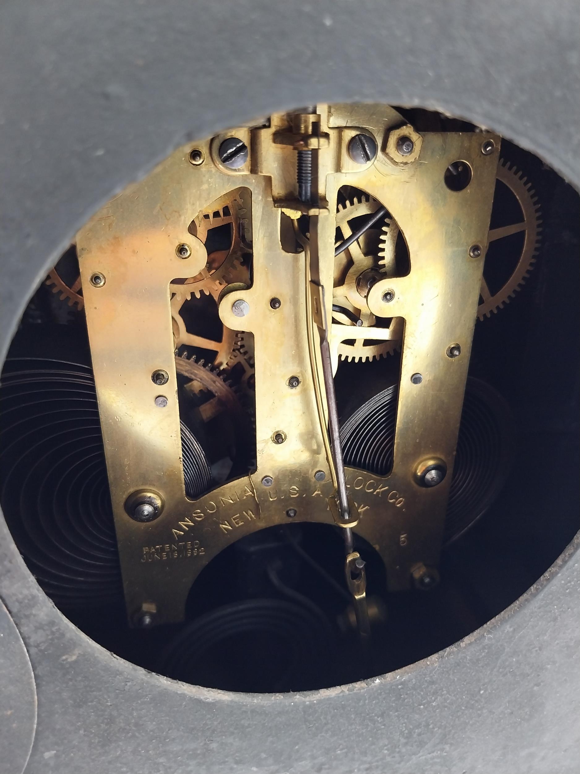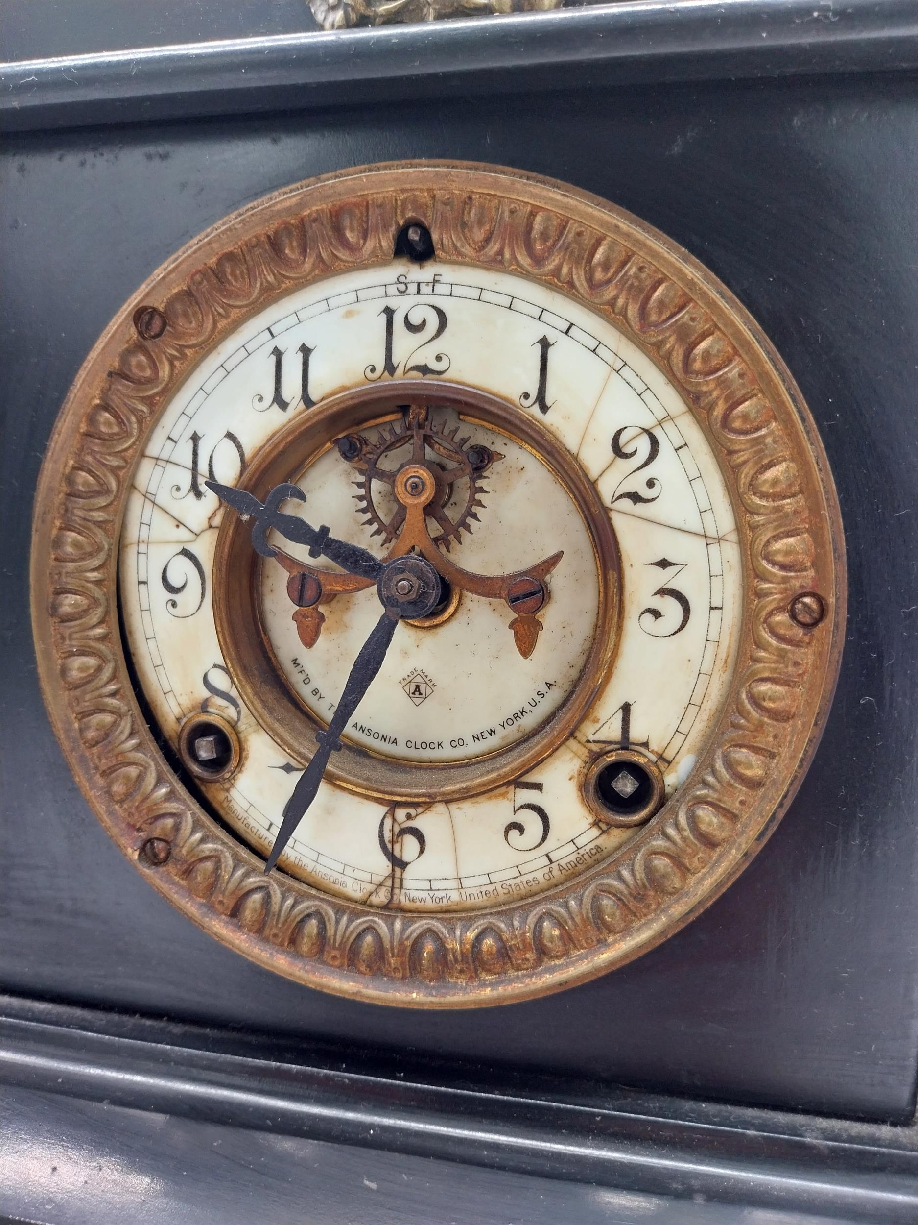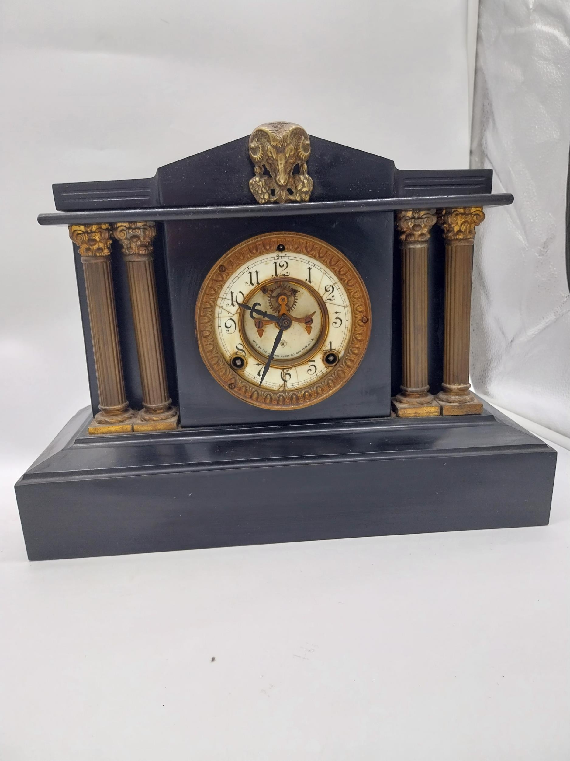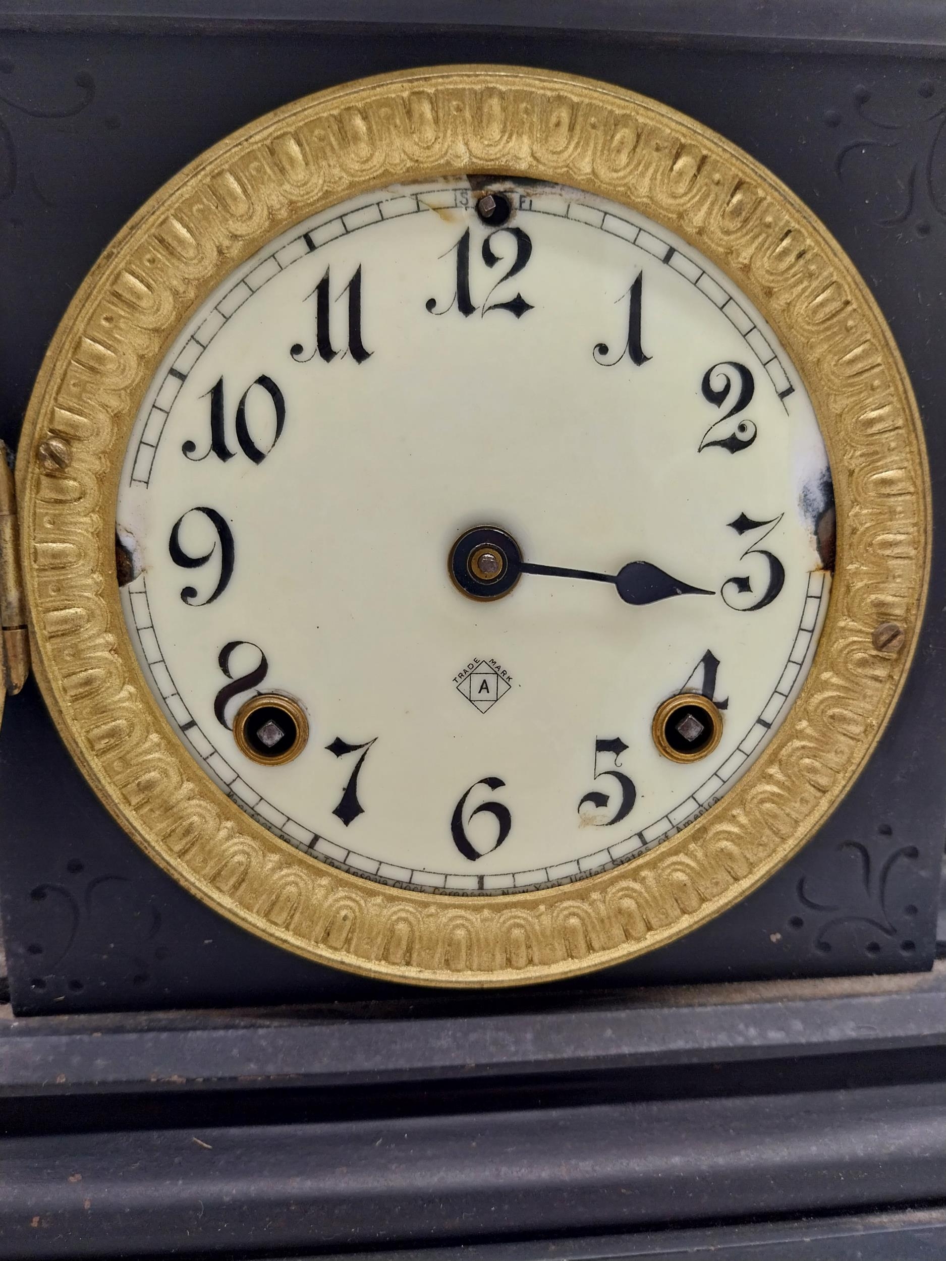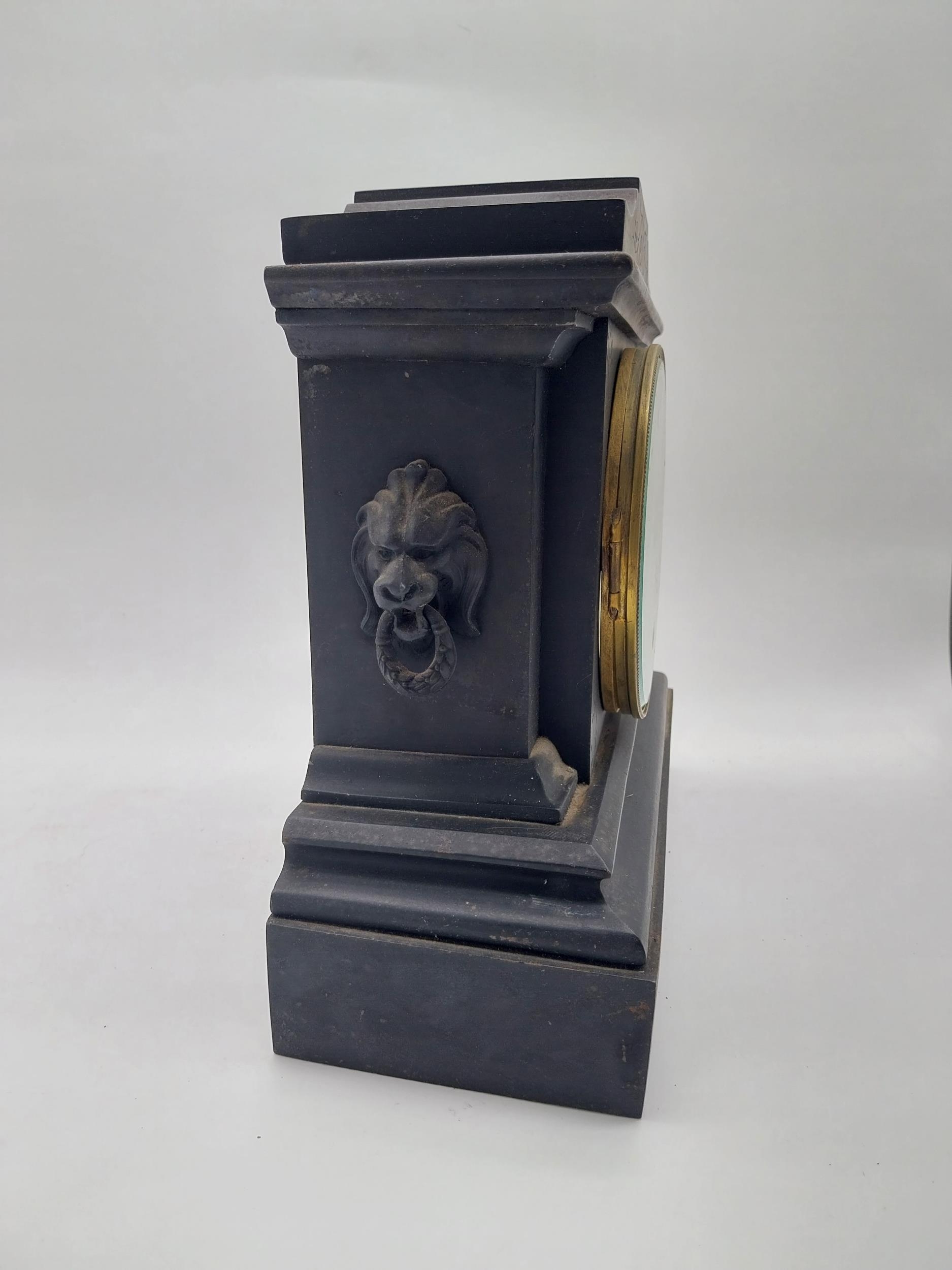Two 19th C. slate mantle clocks with enamel dials {30 cm H x 38 cm W x 16 cm D and 28 cm H x 29 cm W x 12 cm D}.